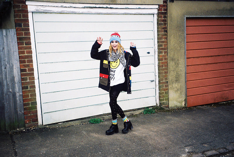 Check out this ultimate Lazy Oaf ensemble including the Black Anorak, Have A Nice Day Baseball T-shirt, Geo Eye Scarf, Have a Crap Day Bobble Hat and Jazzy Socks.