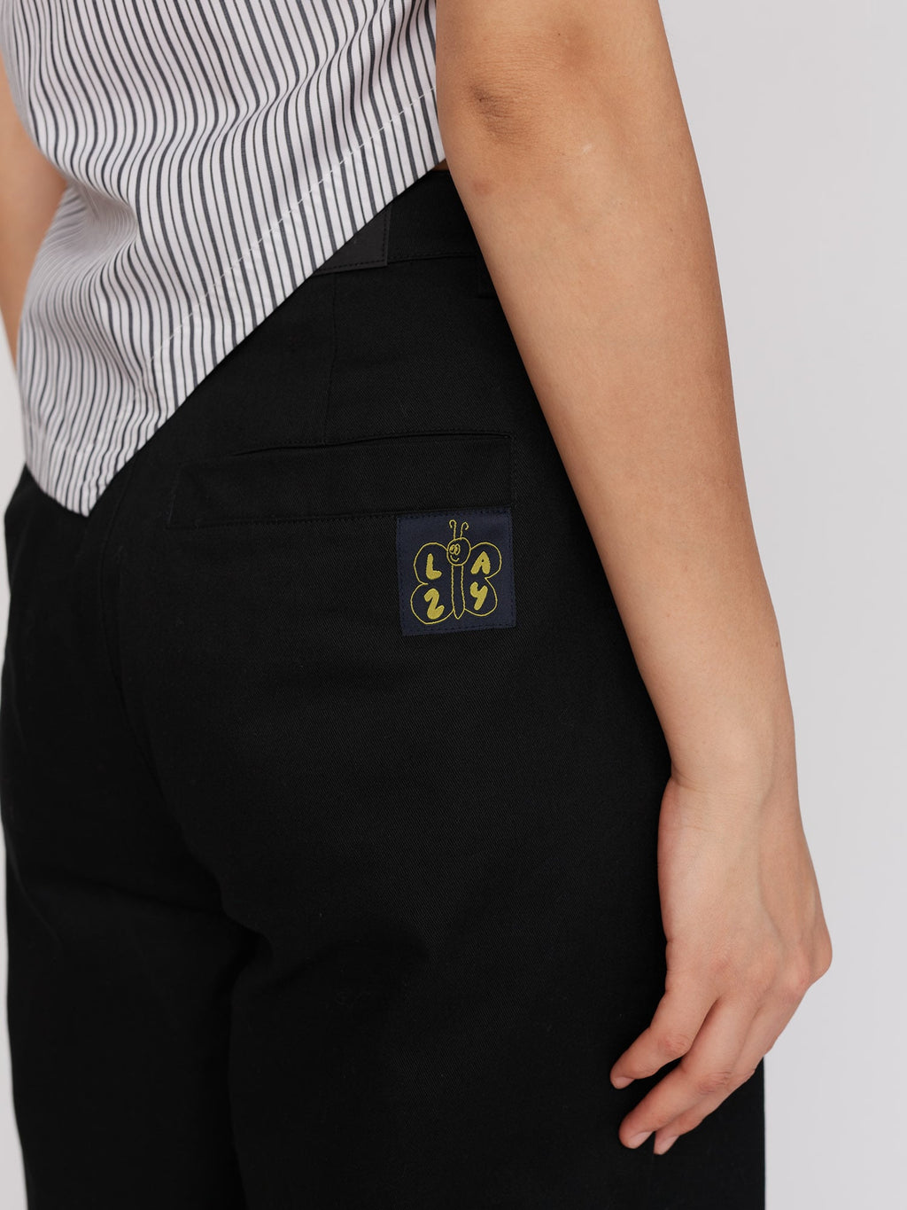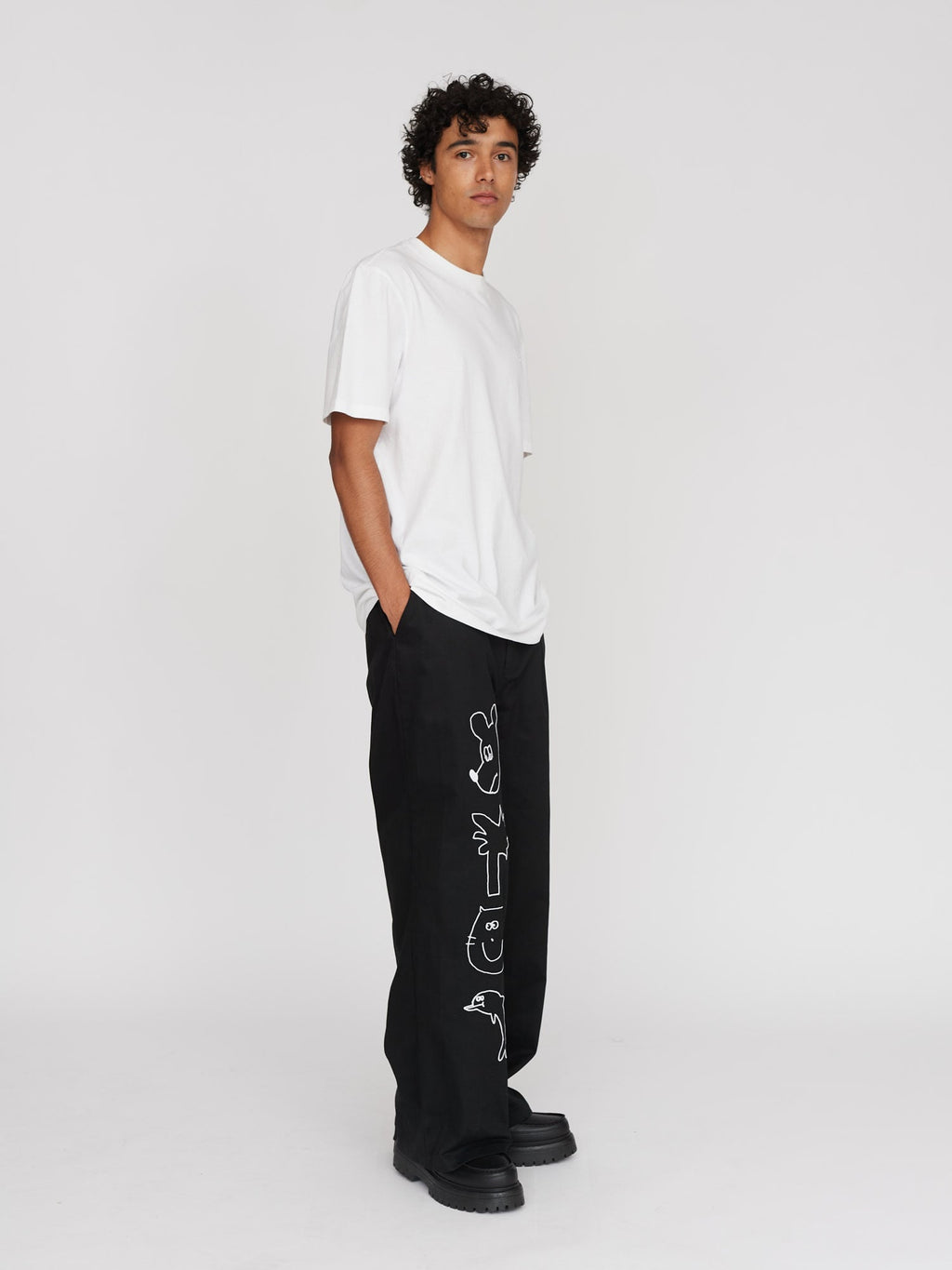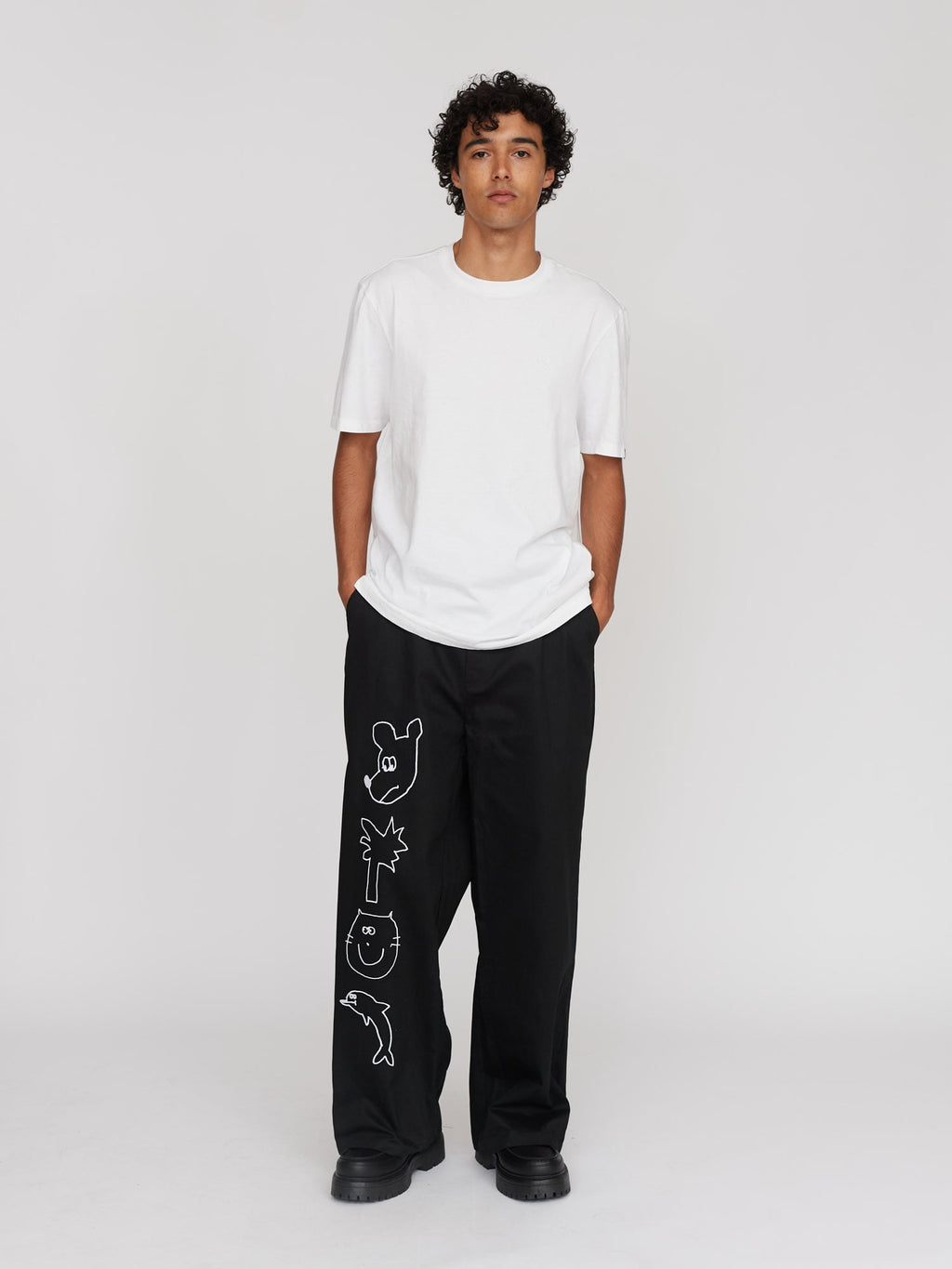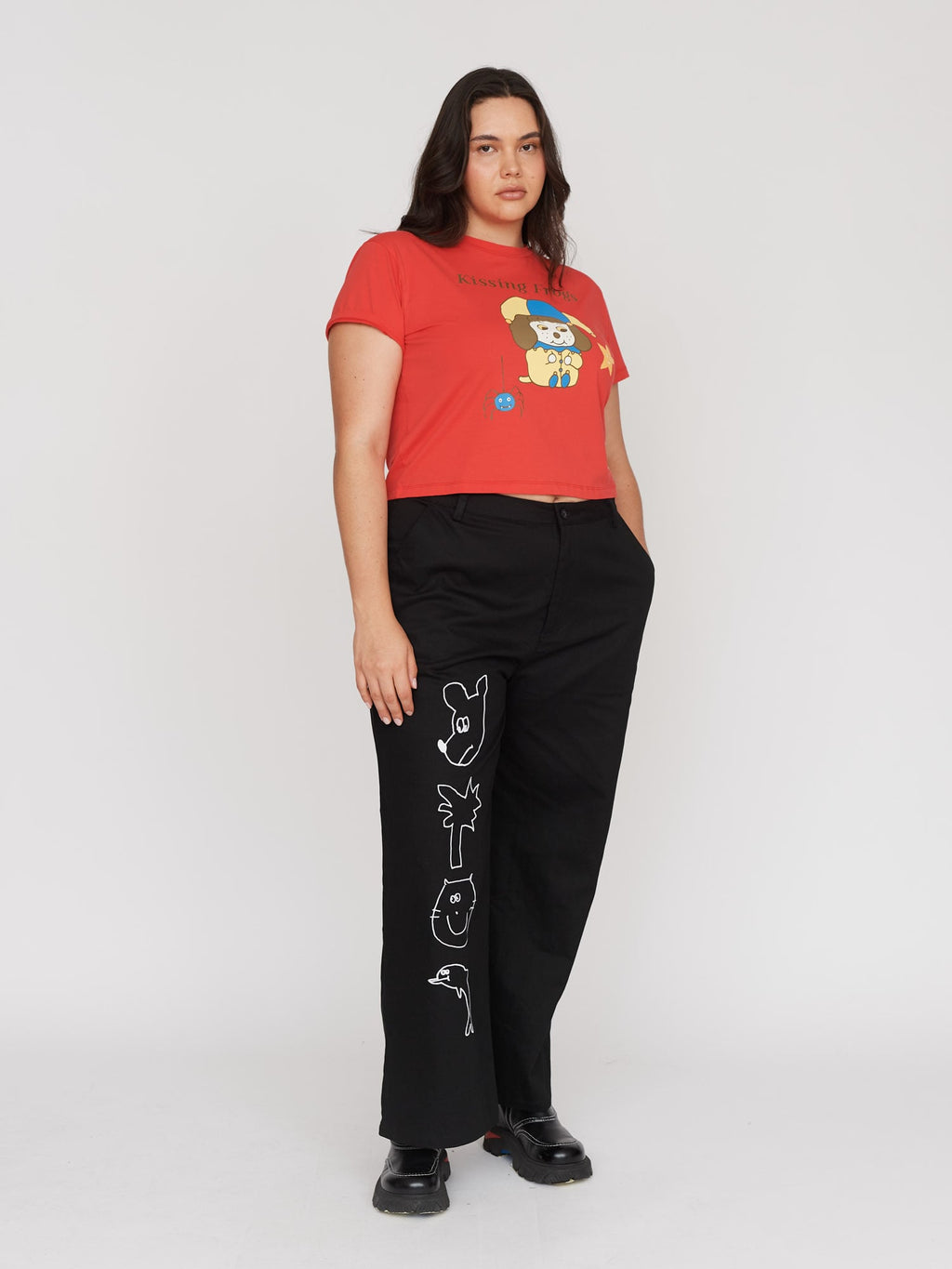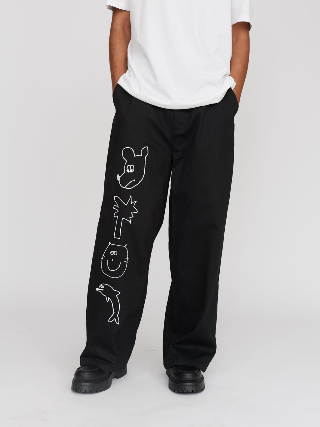 In black, these straight leg pants have a zip fly and button closure with two side seam pockets along with a back one. Made from a lightweight cotton, they have contrast white illustrations by Gemma, King of Oaf embroidered down the left right leg and custom patch on the back pocket. Sitting at mid-rise, these pants will be the perfect everyday addition to your wardrobe and would pair great with our Beary Good Holiday Shirt. Prefer a looser fit? Just go one size up from your usual!