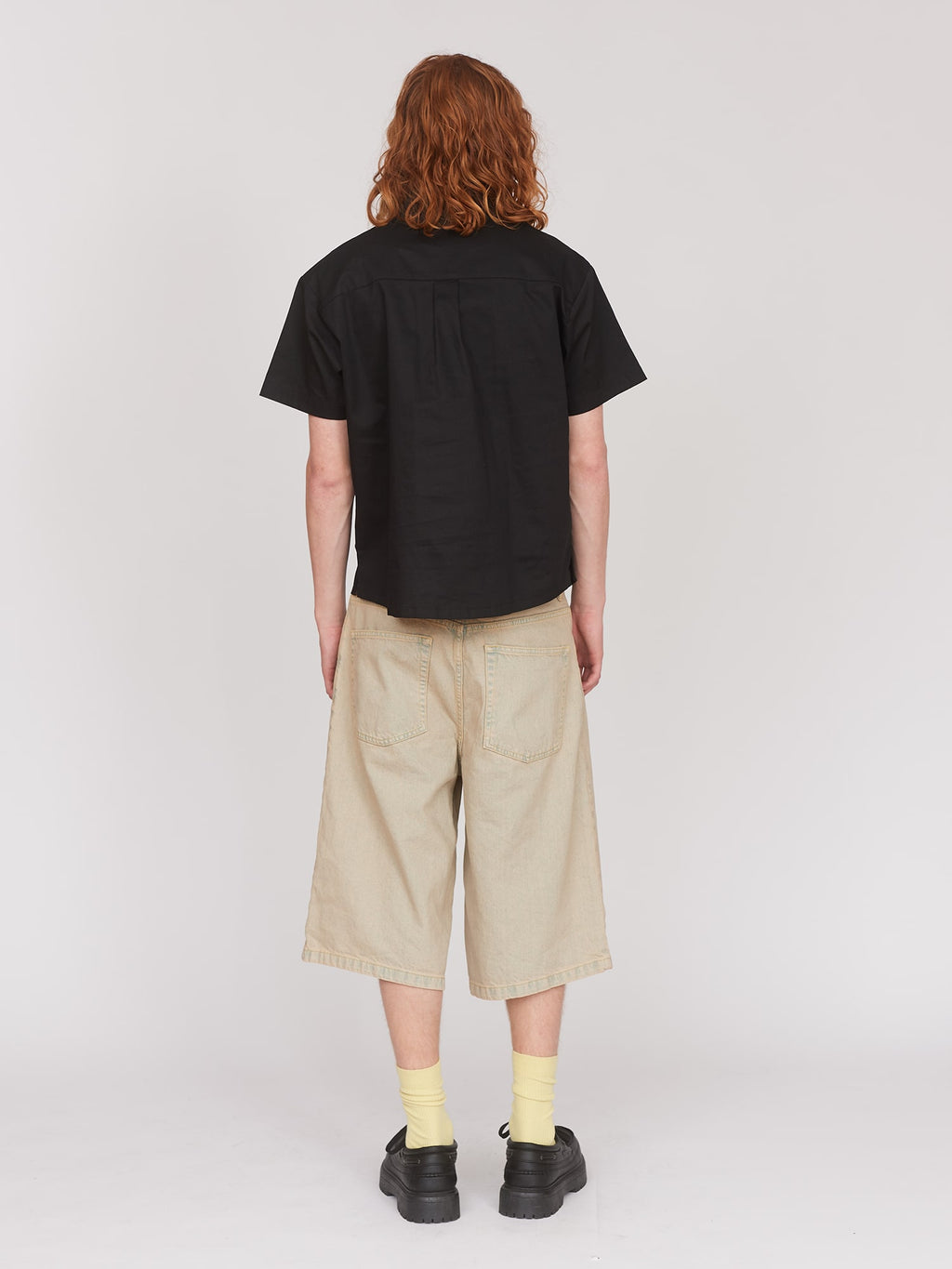 One of our bestselling motifs is ready to become a staple in your summer wardrobe. This short sleeve shirt has a button up front with back yoke and box pleat detail for an effortlessly good, yet relaxed, fit. With side slits at the hem, it features a colourful pleated grosgrain trim applique flower detail on the chest. This black shirt will pair well with all your favourite basics or why not add some more colour by pairing with our Clowning Around Bloomers?