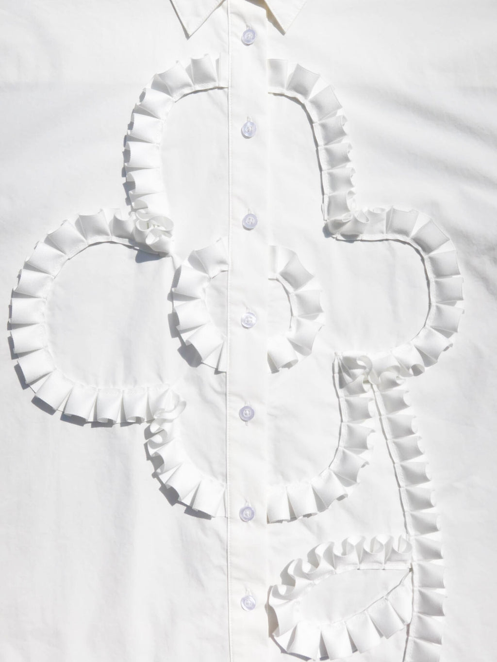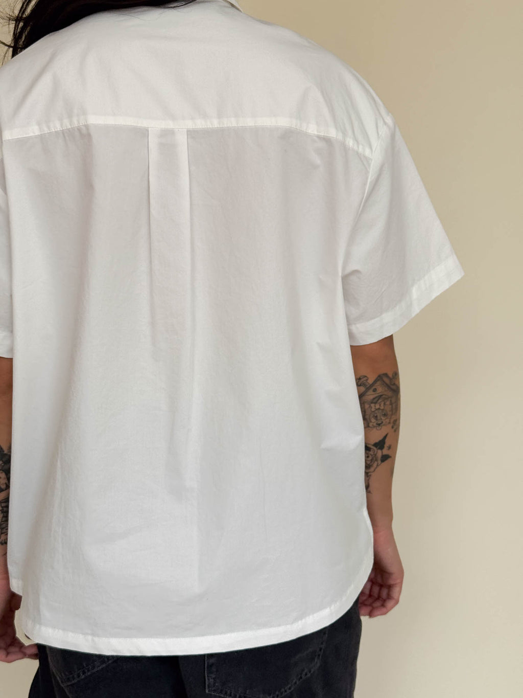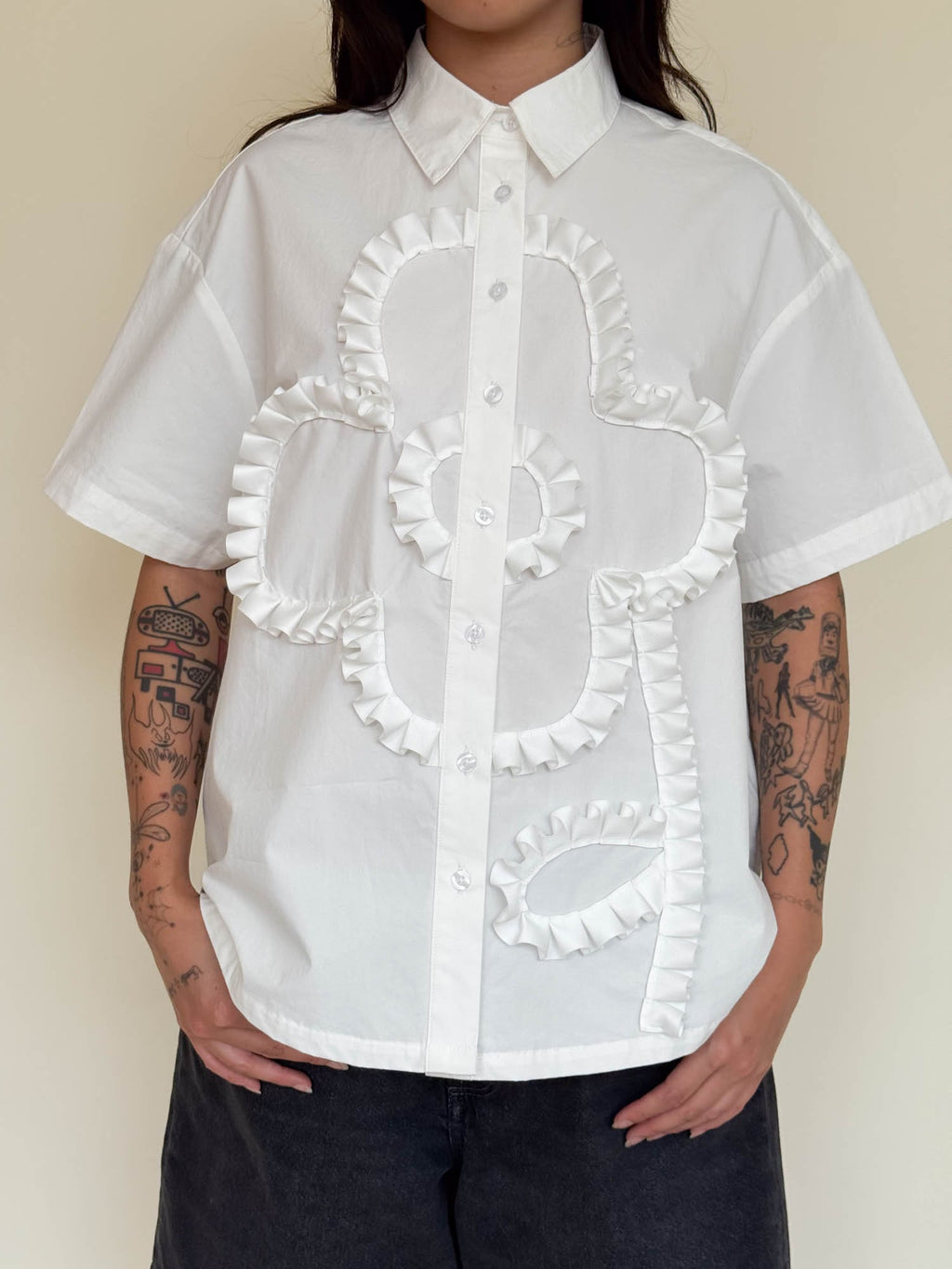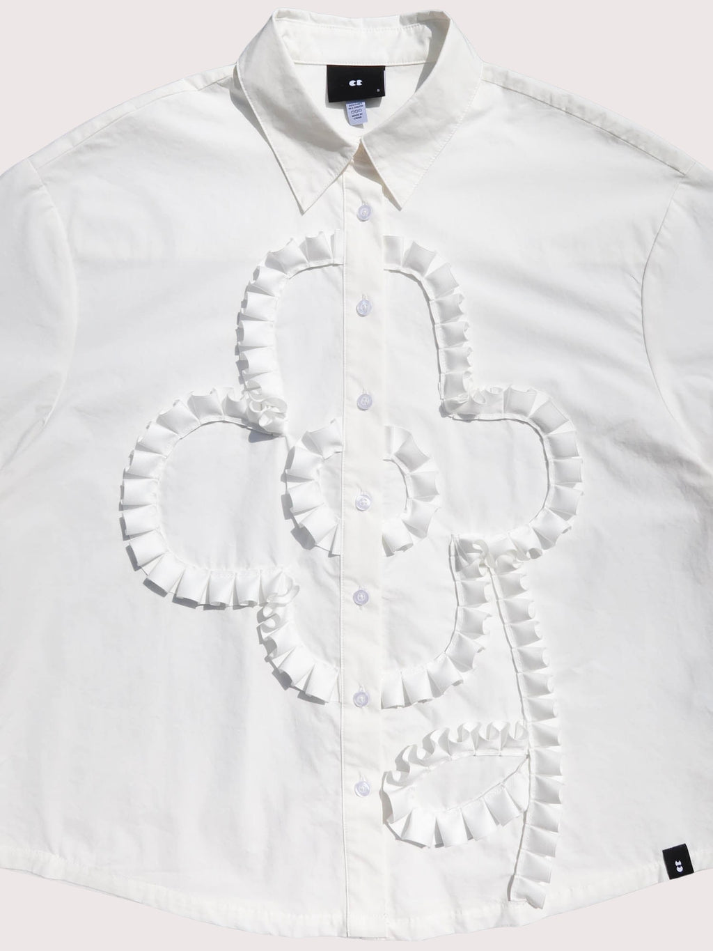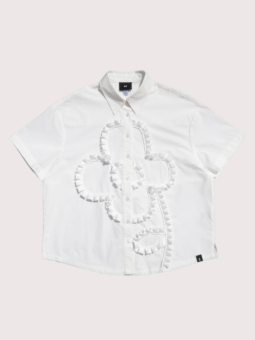 Our short sleeve shirt silhouette is a must-have in your Oaf collection. It has a button up front with a back yoke and box pleat detail as well as side slits at the hem; all these details giving it an effortless and relaxed fit. In white, it features a pleated grosgrain trim applique flower on the chest, one of our bestselling motifs. This easy-to-wear style will blend in seamlessly to your wardrobe all year round.
