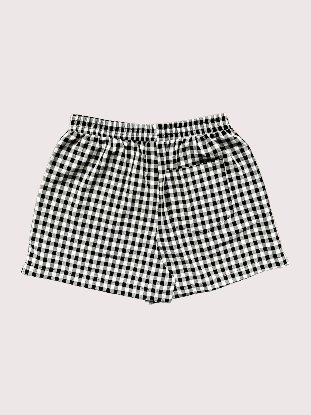 These pull on black and white gingham shorts have an elasticated waistband and are made from a breathable, lightweight material. They’re not just a looker, they’re practical too with side seam pockets as well as one at the back to put all your nic-nacs. Across the front is a black Happy Sad bear print; a new iteration of our bestselling mixed emotions print. Pair with our Black Grin and Bear It Smock Top and you’re set for a summer’s day.