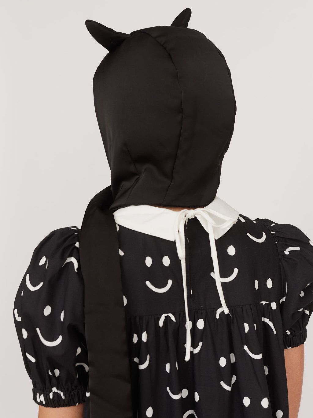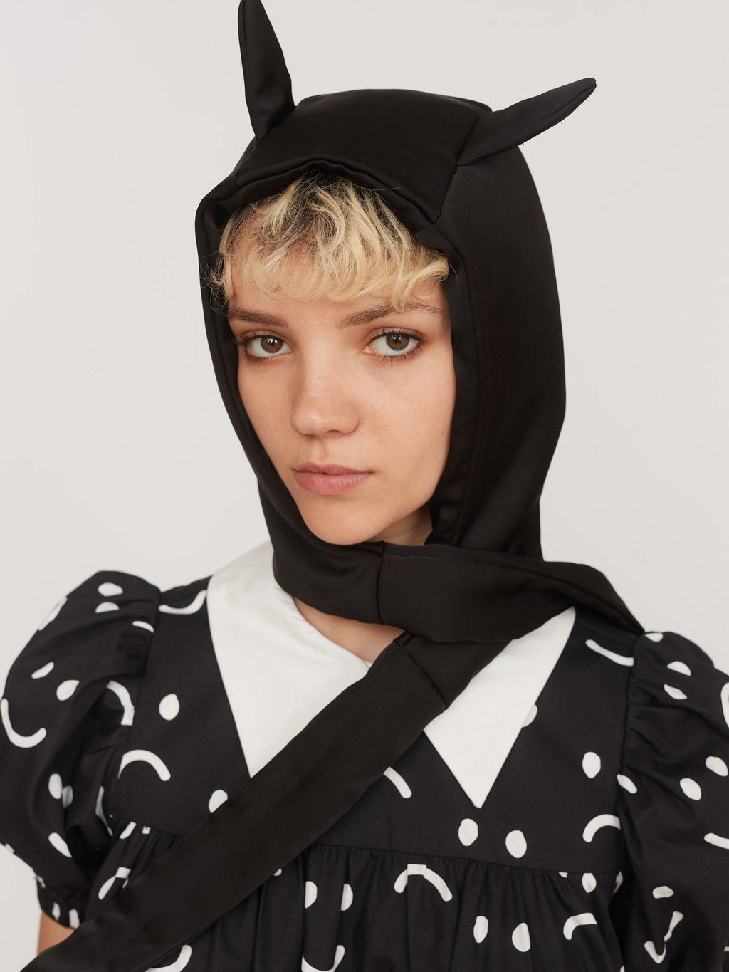 Made from a super silky satin fabric, this black headscarf features two stuffed horns on the top of the head. Lightly padded throughout, the two long ties can be fastened within a bow or left loose.