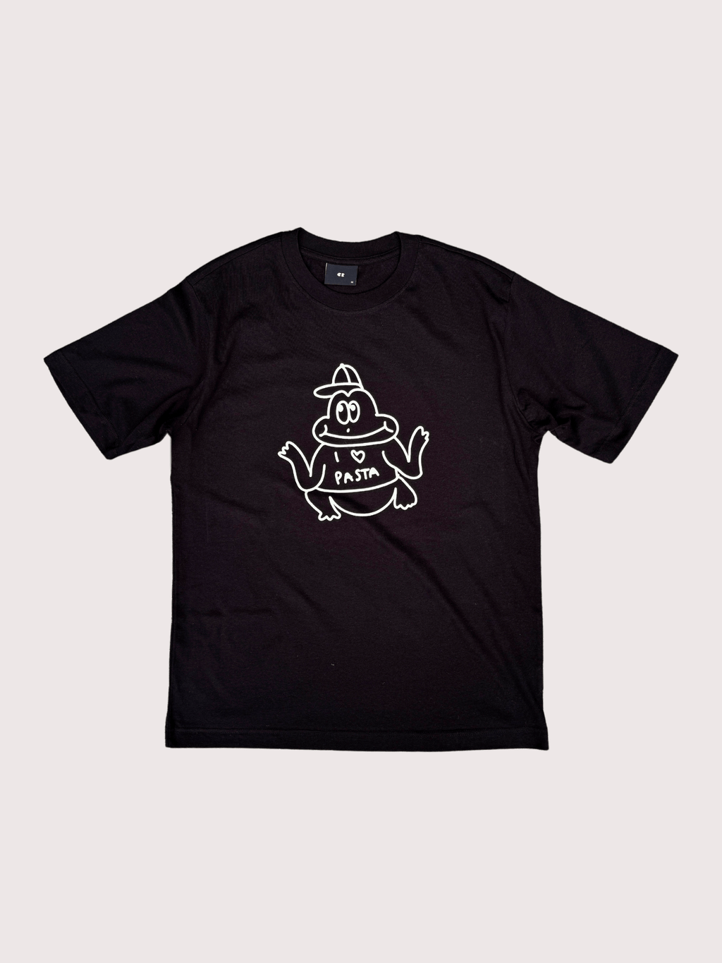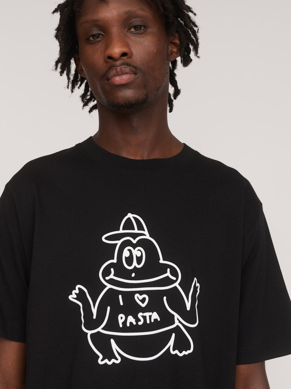 In 100% organic cotton, this unisex tee is part of our print shop collection, a limited edition run of embroidered and printed graphic apparel and accessories. In black, this t-shirt features a contrasting ‘I <3 Pasta’ text with a hand-drawn frog graphic on the front and with a ribbed neckline.