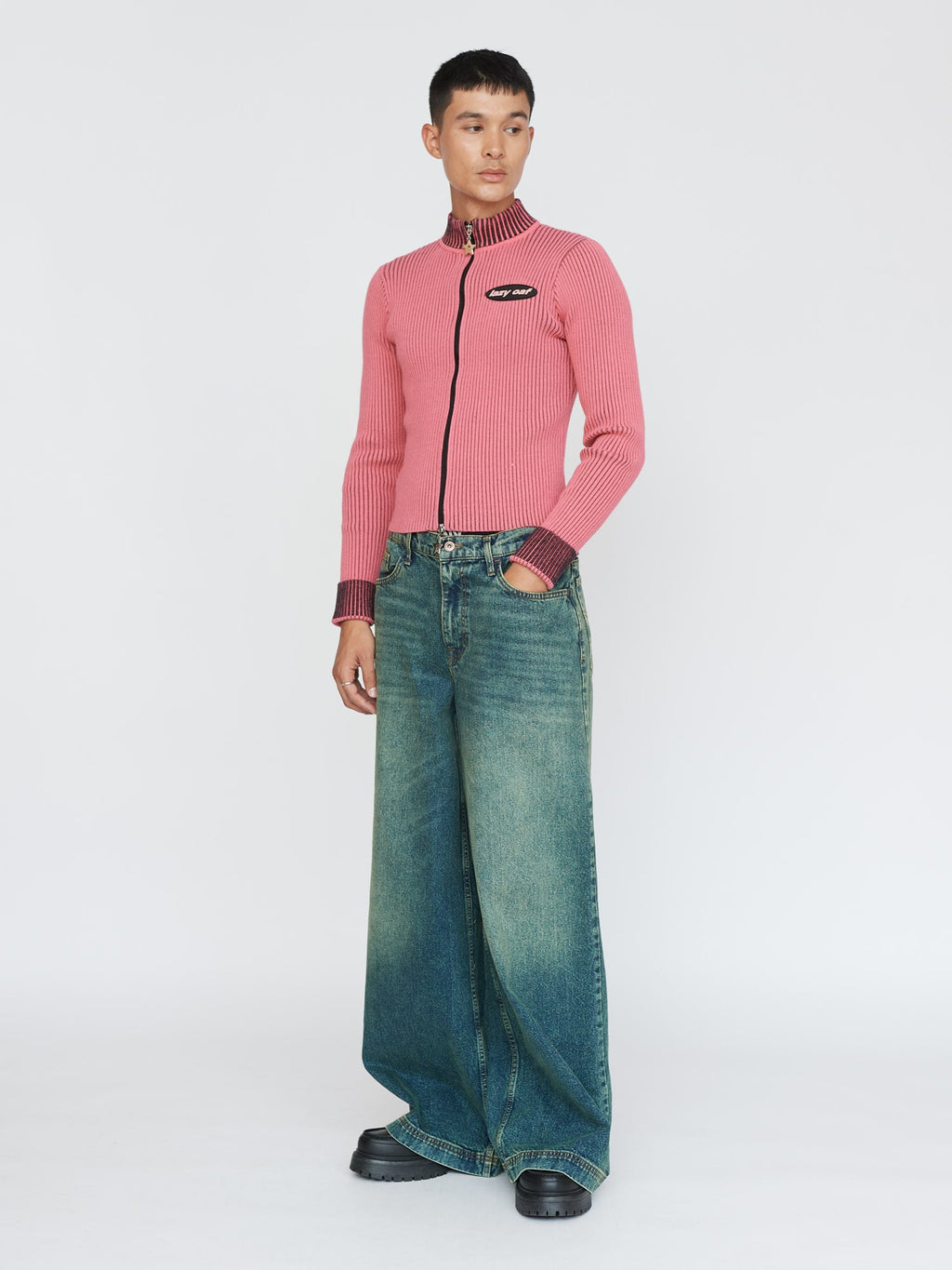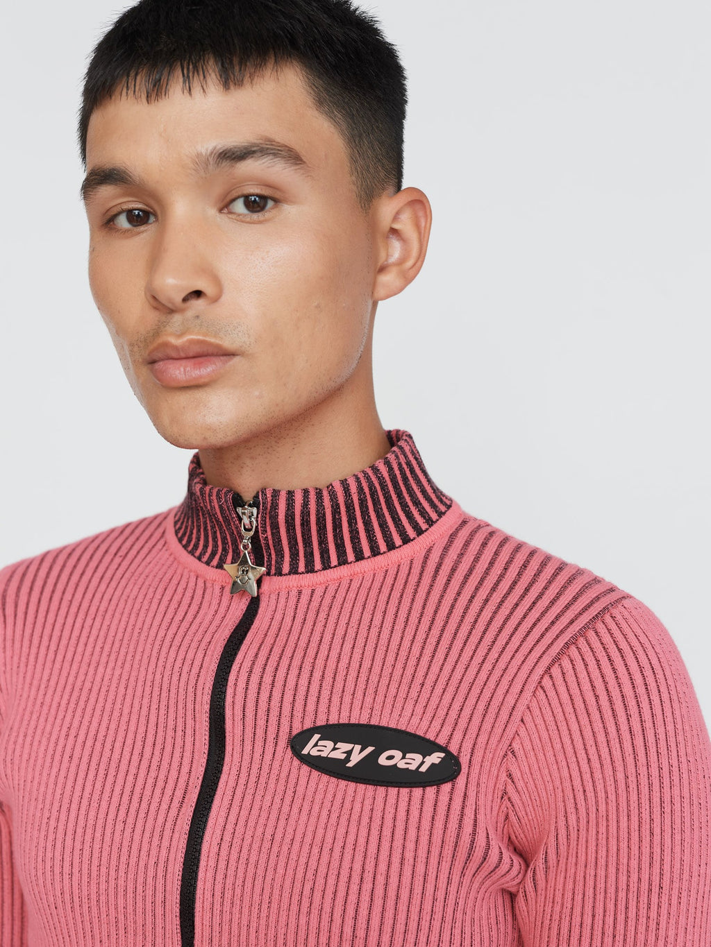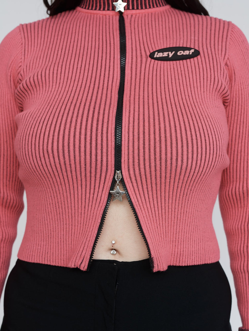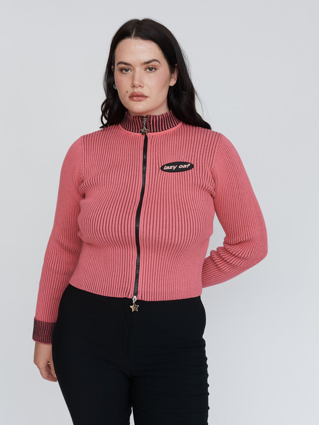 In a pink two-tone rib knit, this cardigan has a double ended zip closure with engraved star pullers. The knit has a contrast mock neck and cuff detailing then on the chest is a rubberised Lazy Oaf branded patch. Why not style with our Not Now Baggy Jeans and our Glitched Quilted Bag?