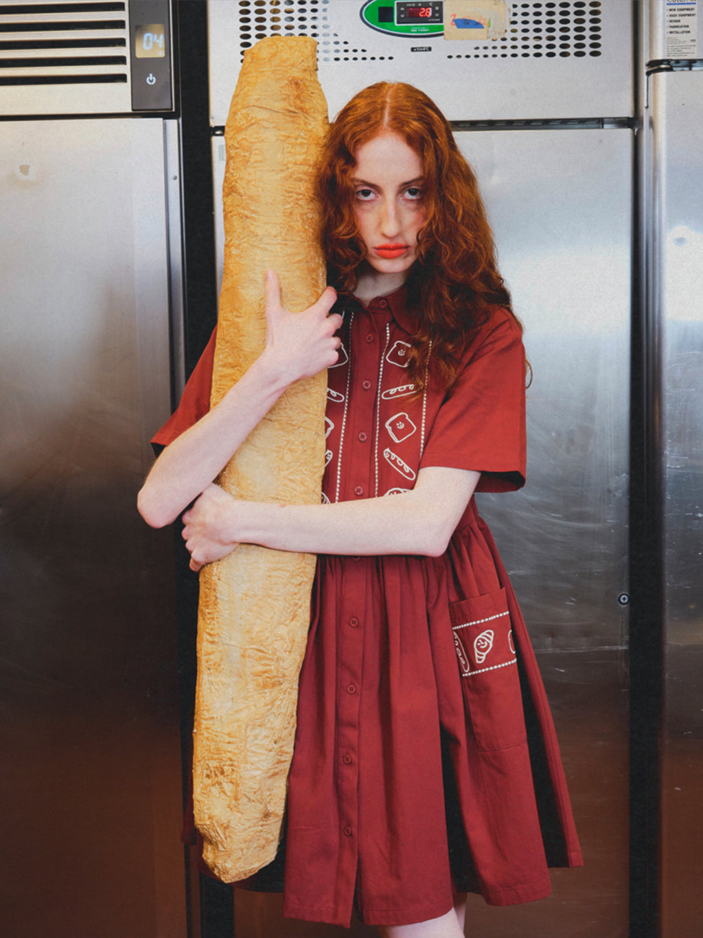 In a reddish-brown, this mini shirt dress has short sleeves with a full gathered skirt and front patch pockets. Made from 100% cotton, it features contrasting embroidered details drawn by Oaf founder, Gemma Shiel, on the chest, back and pockets. Complete the carb fantasy by styling with our Sandwich Pocket Knitted Cardigan and Lazy Loaf Crochet Style Bag.