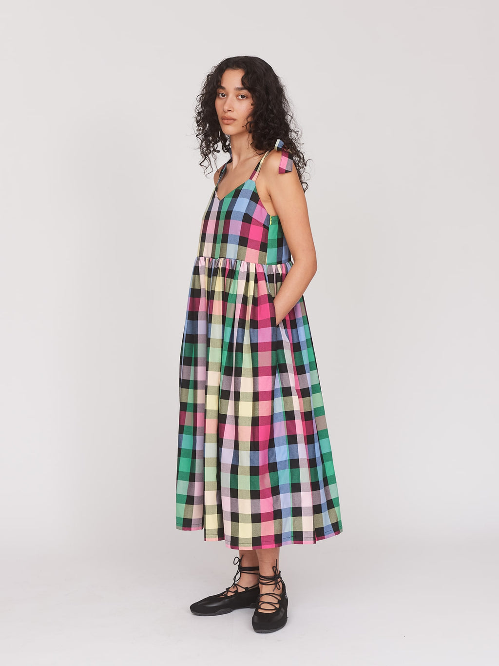 This adjustable, tie shoulder dress has a fitted bodice with a full skirt that falls at midi length. In a lightly brushed multi-colour check, it’s fastenable by a side seam zip and the skirt has pockets which’ll be perfect for your essentials. Got a special occasion on the cards? Pair with our Checkmate Bow and Bag, you’ll be the main event.