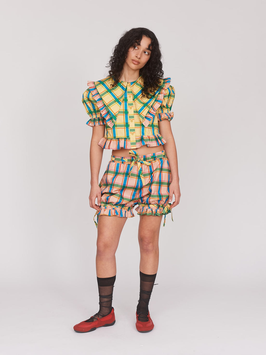 The wisteria is in bloom and so are our shorts! These pull-on bloomers have an elasticated waist and hem which both have adjustable, fabric tie details so you can get the bloom, just right for you. Made from 100% cotton, they have an all over, mismatched check print and of course, they have side seam pockets. Let the shorts be the star by styling with your favourite white tee, or get checked in by pairing with our Clowning Around Check Top.