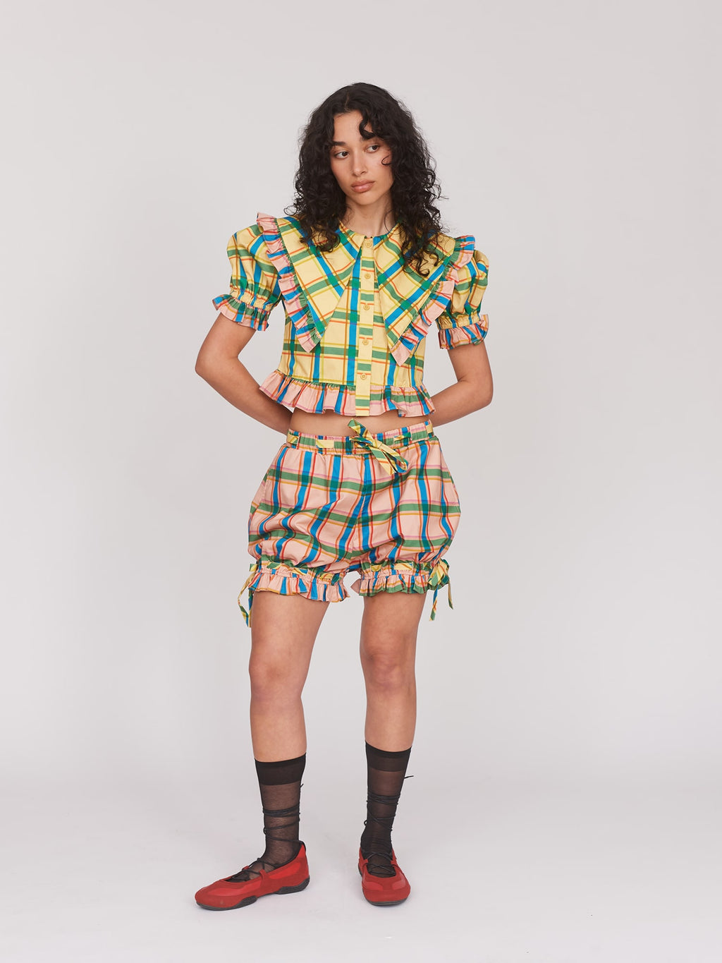Love our ruffle collar dress, but not really a dress person? This is the top you’ve been waiting for. This button-up, short sleeve shirt has an oversized collar with a ruffle trim as well as a ruffled hem peplum. Made from 100% cotton, it has puff sleeves with elasticated, ruffle cuffs to keep all the volume. In a mismatched check print, if you love this style, you won’t want to miss our Clowning Around Bloomers or Mixed Check Tights.