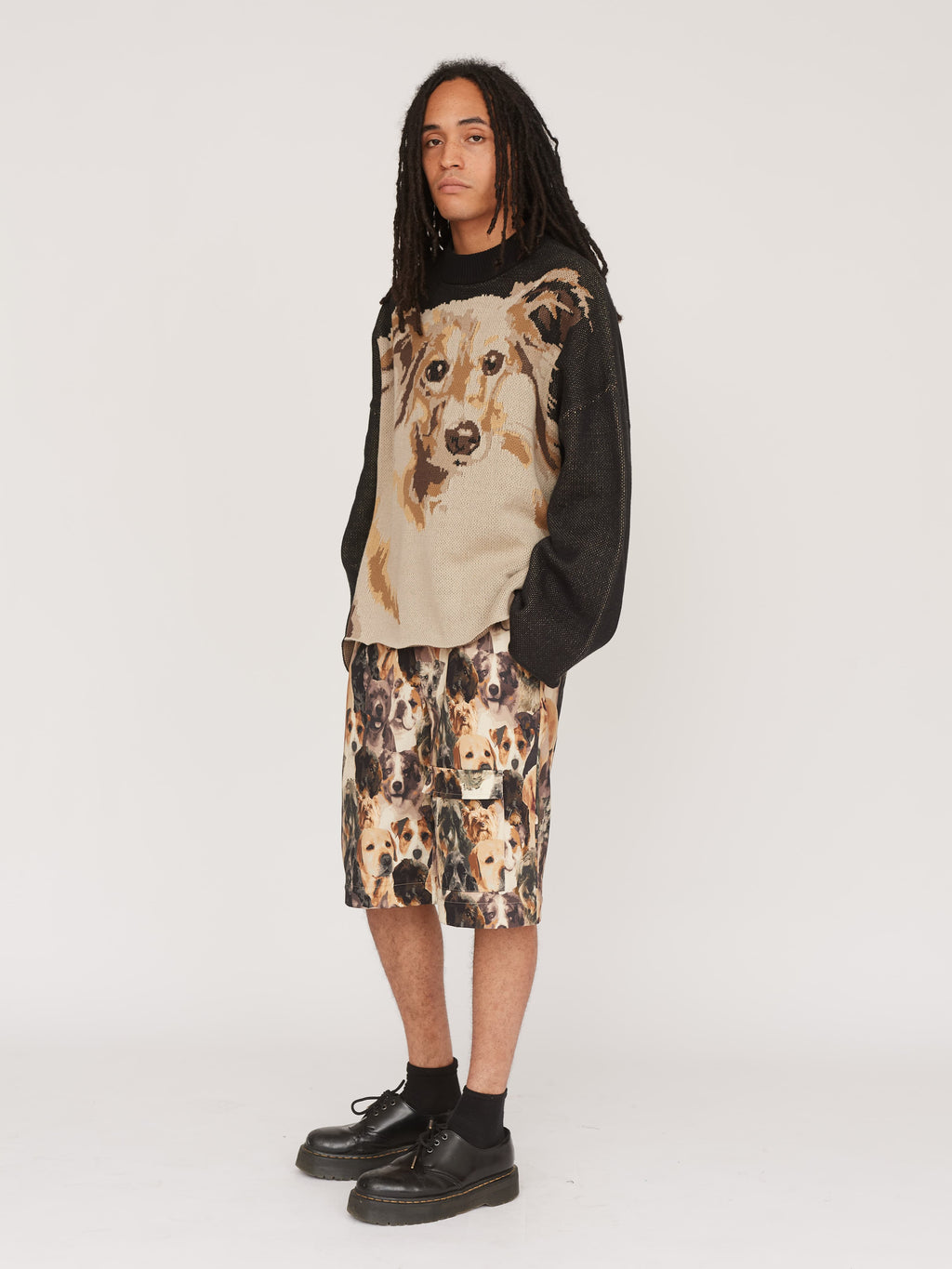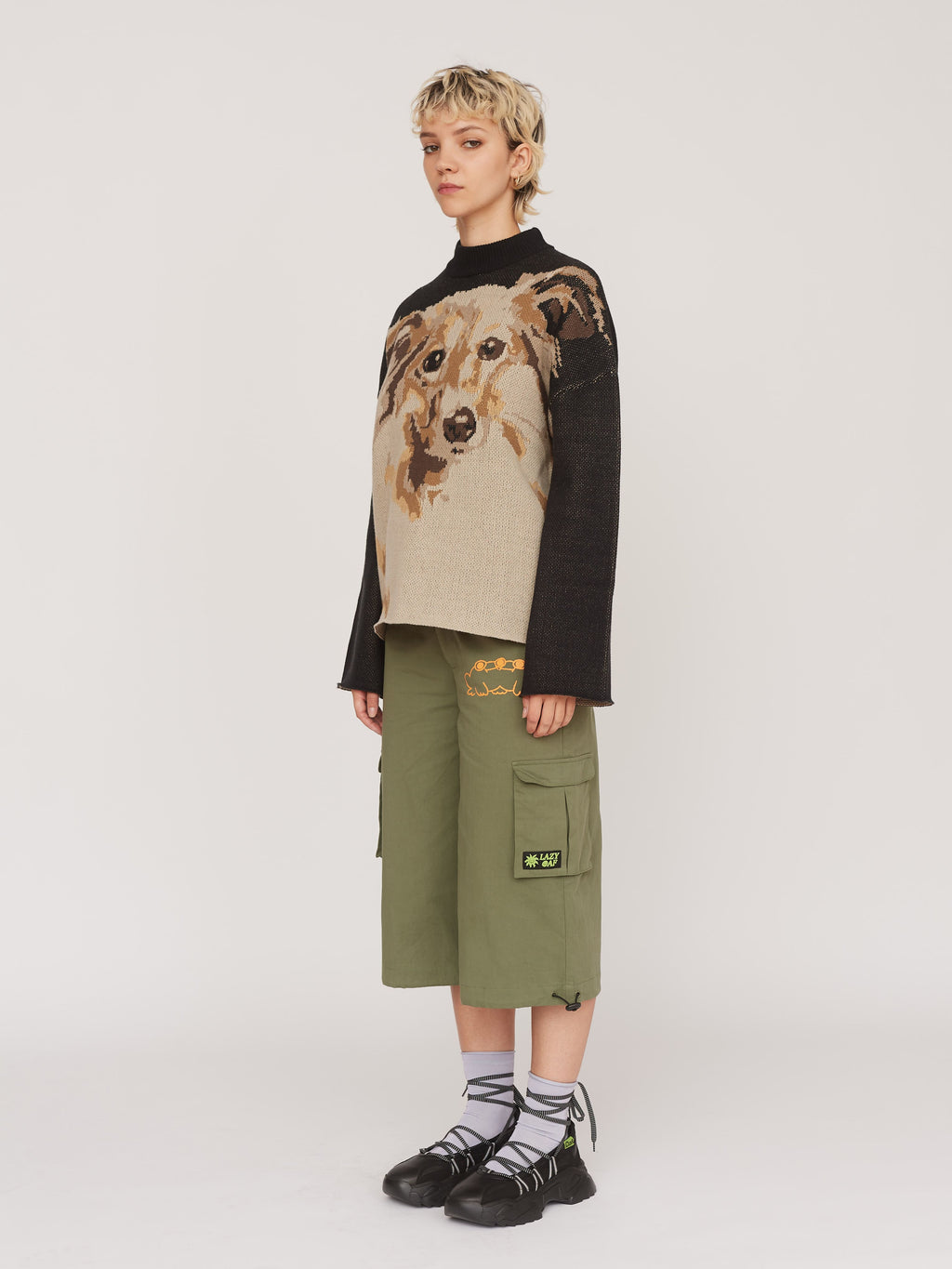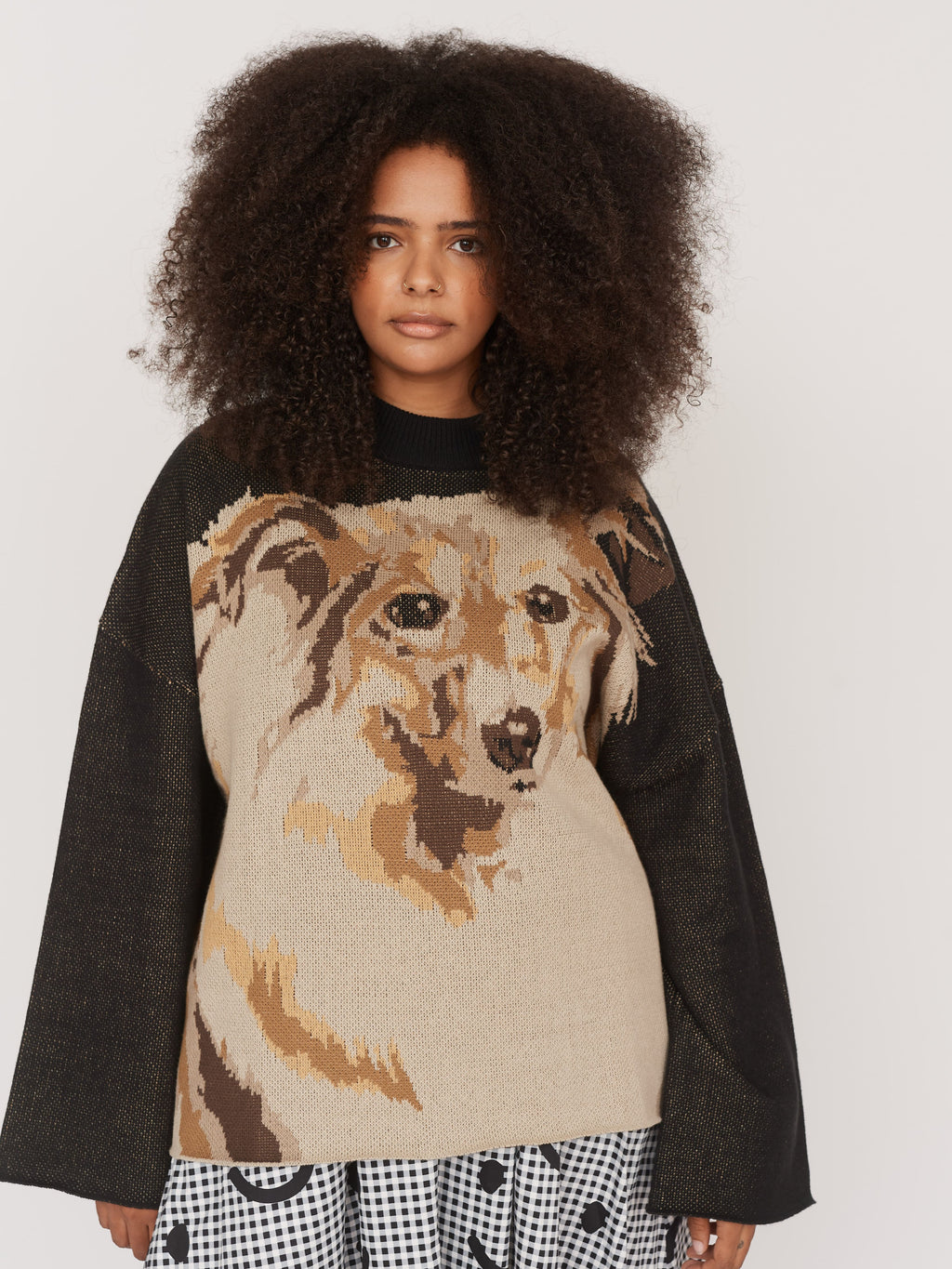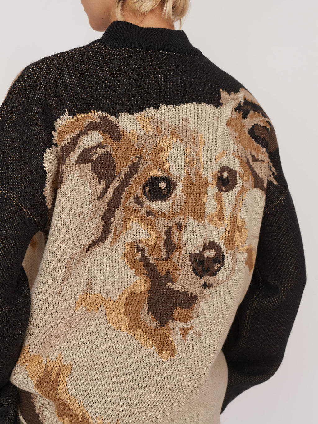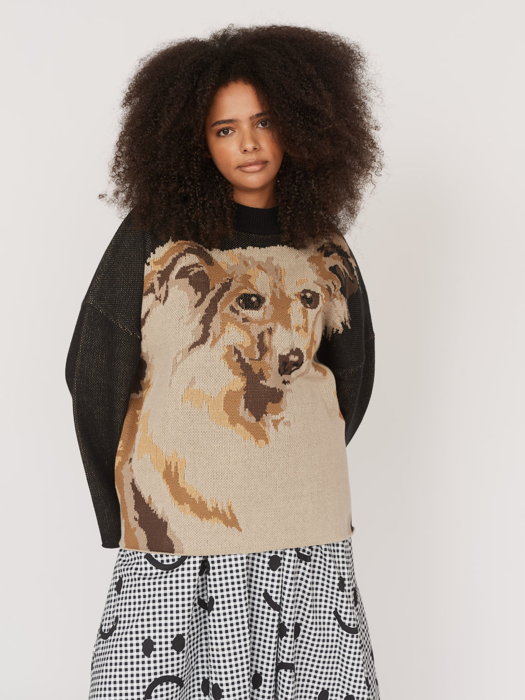 This oversized knit jumper features an intarsia collie dog design on the front and back. It has a ribbed high neck with a drop shoulder, which flows into a bell sleeve. Made from a super soft cotton yarn blend, this loved shape is the perfect knit to throw on for a cooler day.