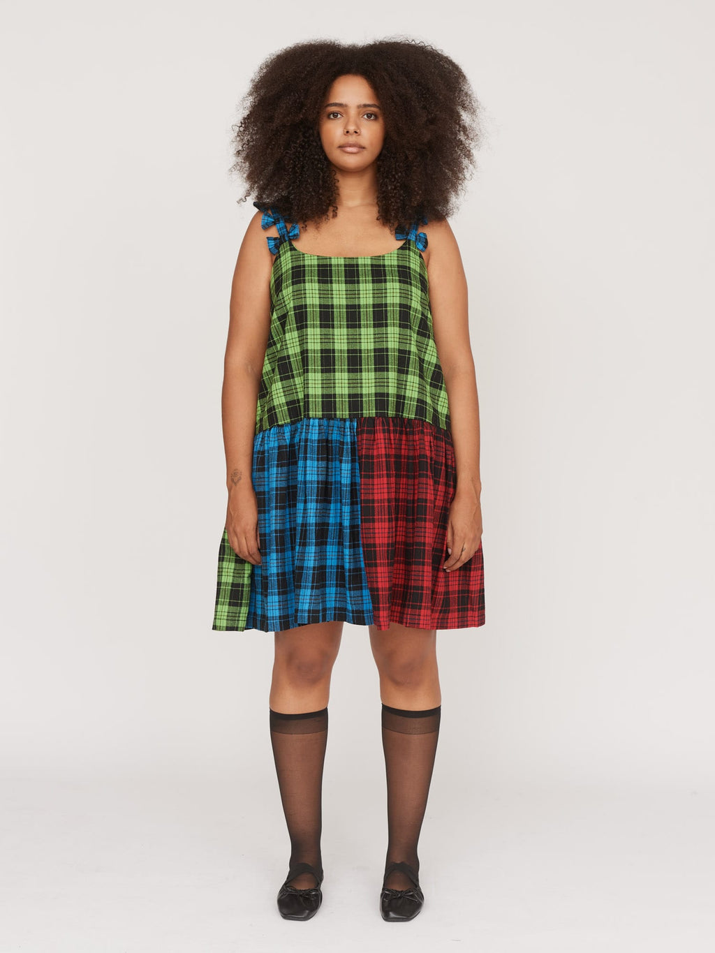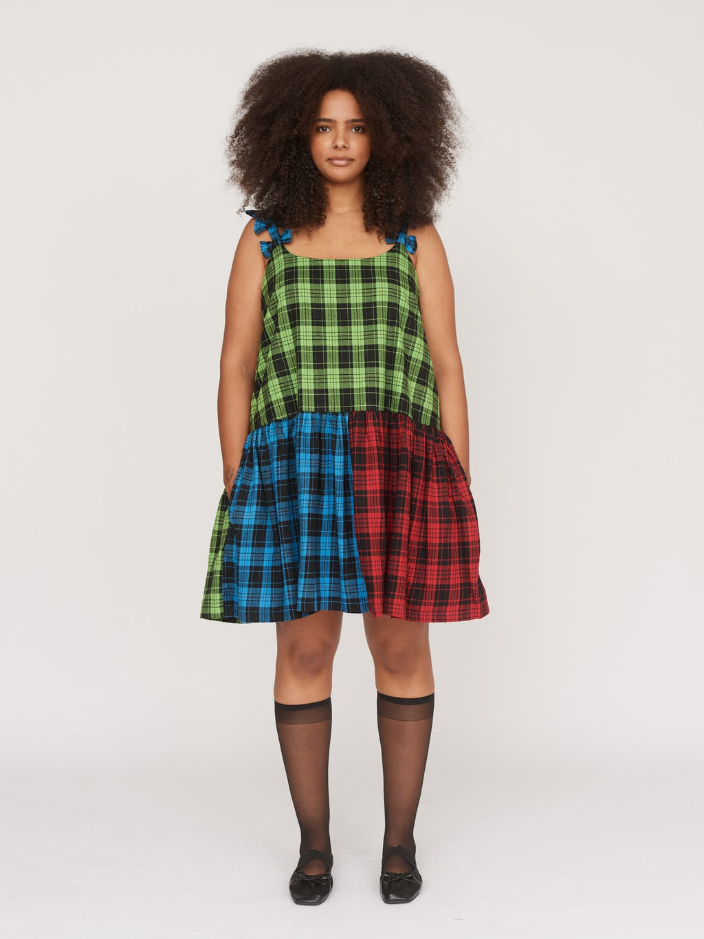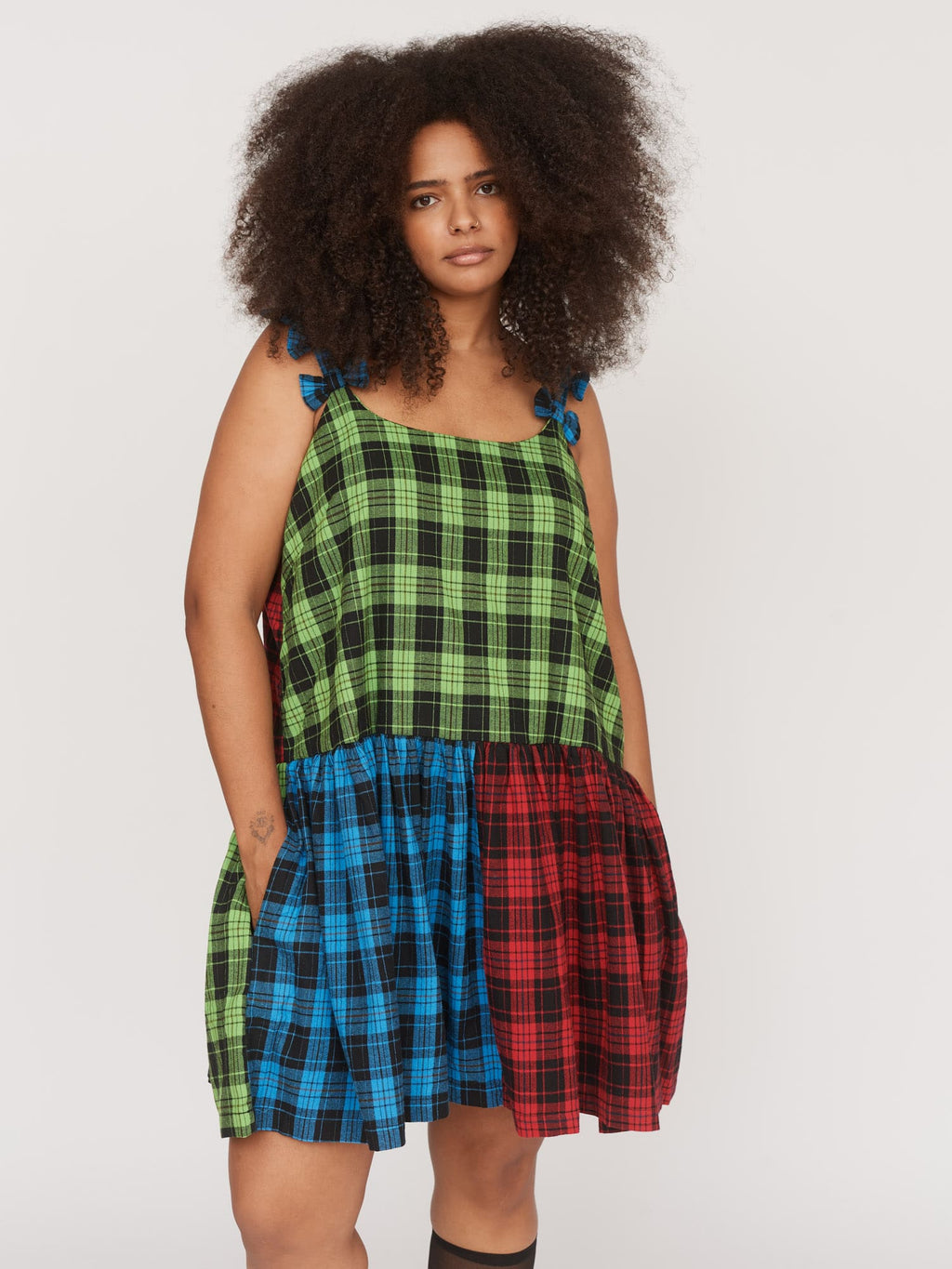 This cotton blend mini dress comes in a green, blue and red flannel patchwork design. In a drop waist silhouette, it has a gathered skirt creating natural volume, and straps with bow detailing. We’re not one for carrying all our things, so there are two side seam pockets. With a relaxed fit, this dress is perfect for looking cute to devour a pub Sunday roast.
