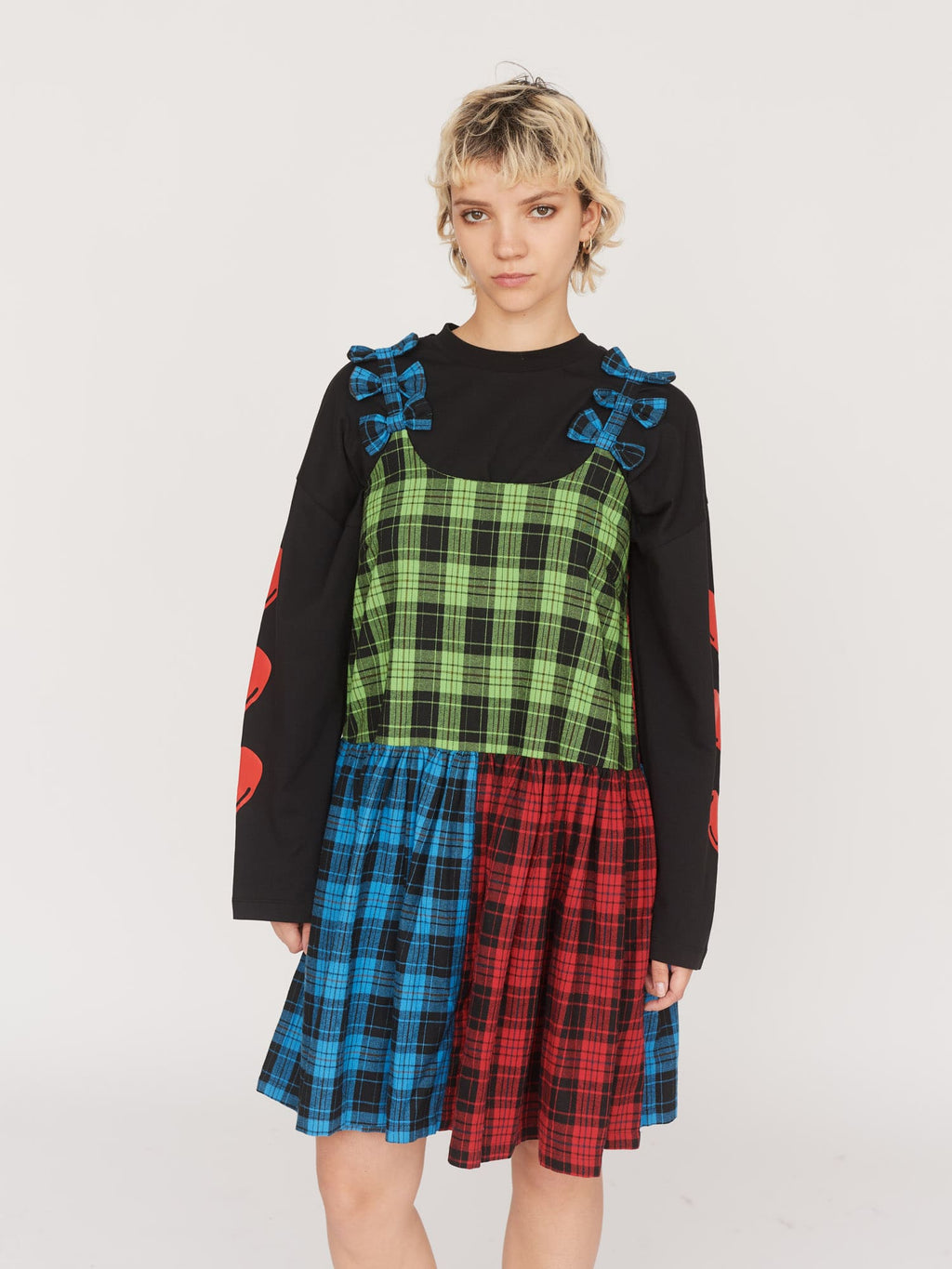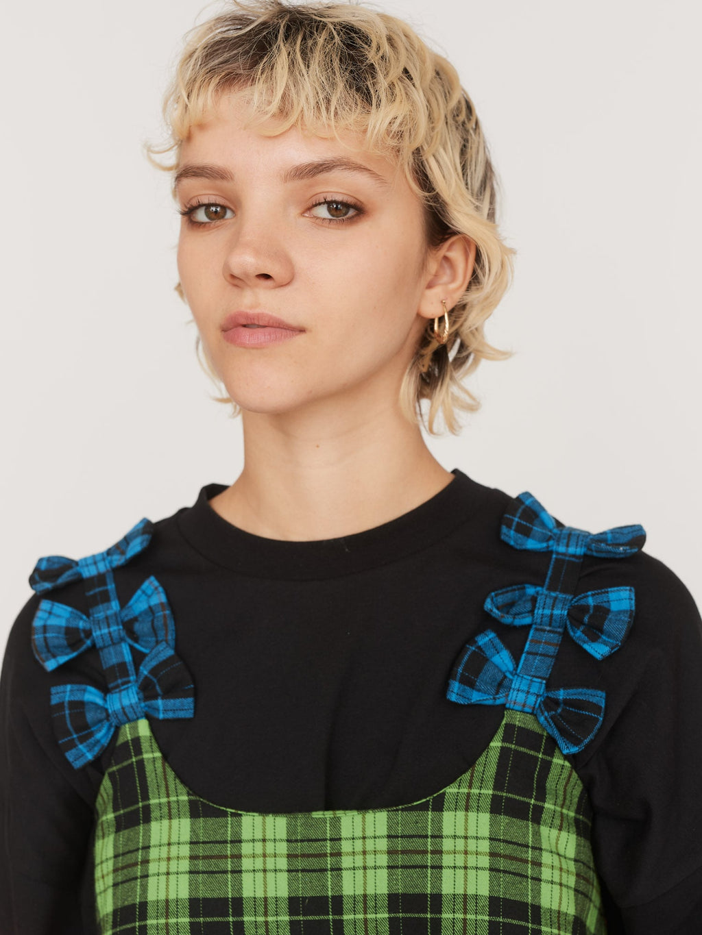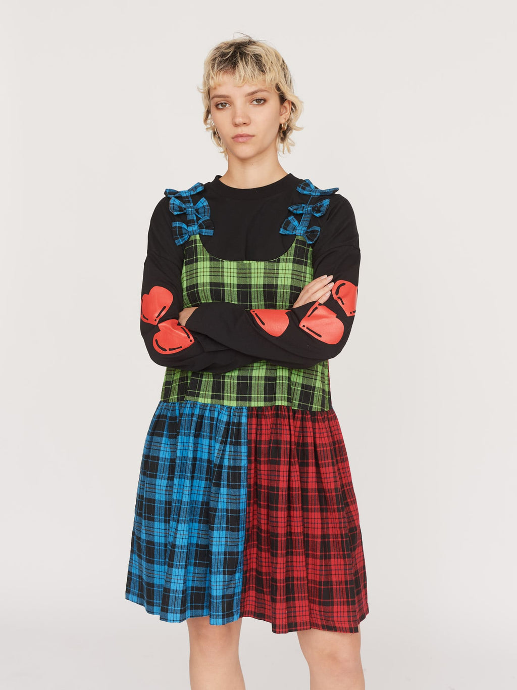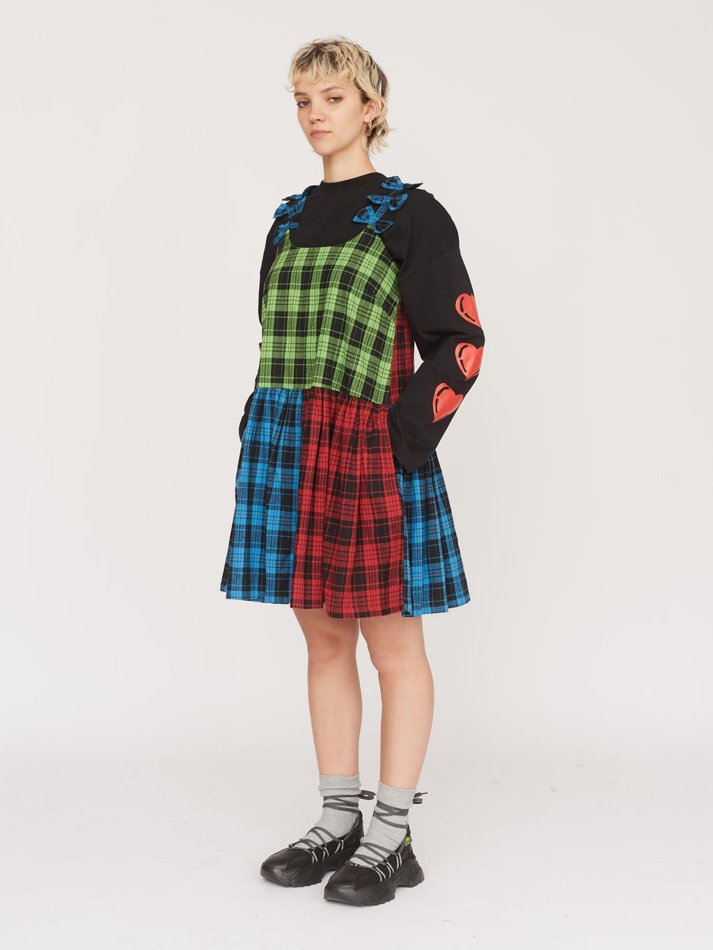 This cotton blend mini dress comes in a green, blue and red flannel patchwork design. In a drop waist silhouette, it has a gathered skirt creating natural volume, and straps with bow detailing. We’re not one for carrying all our things, so there are two side seam pockets. With a relaxed fit, this dress is perfect for looking cute to devour a pub Sunday roast.