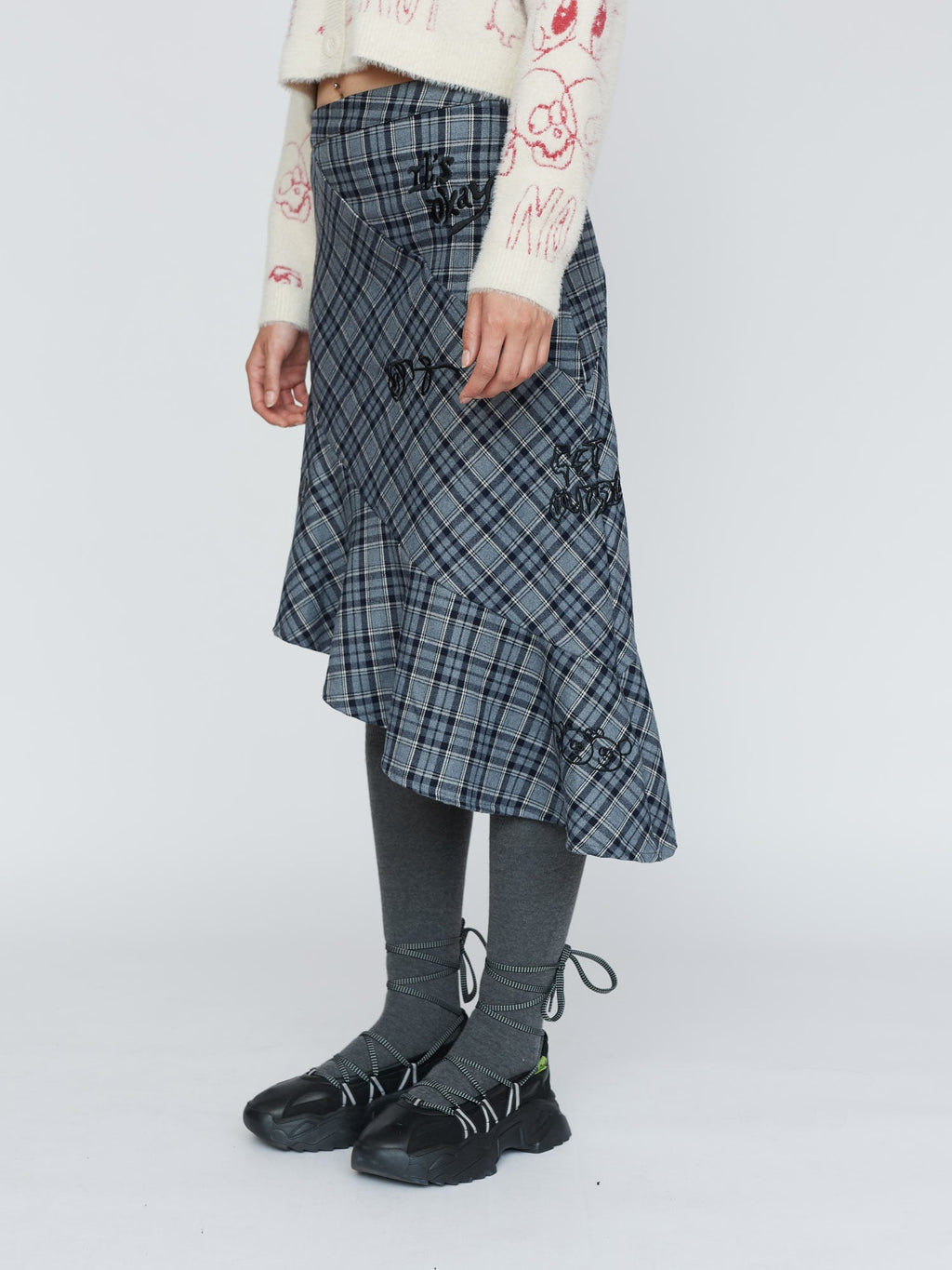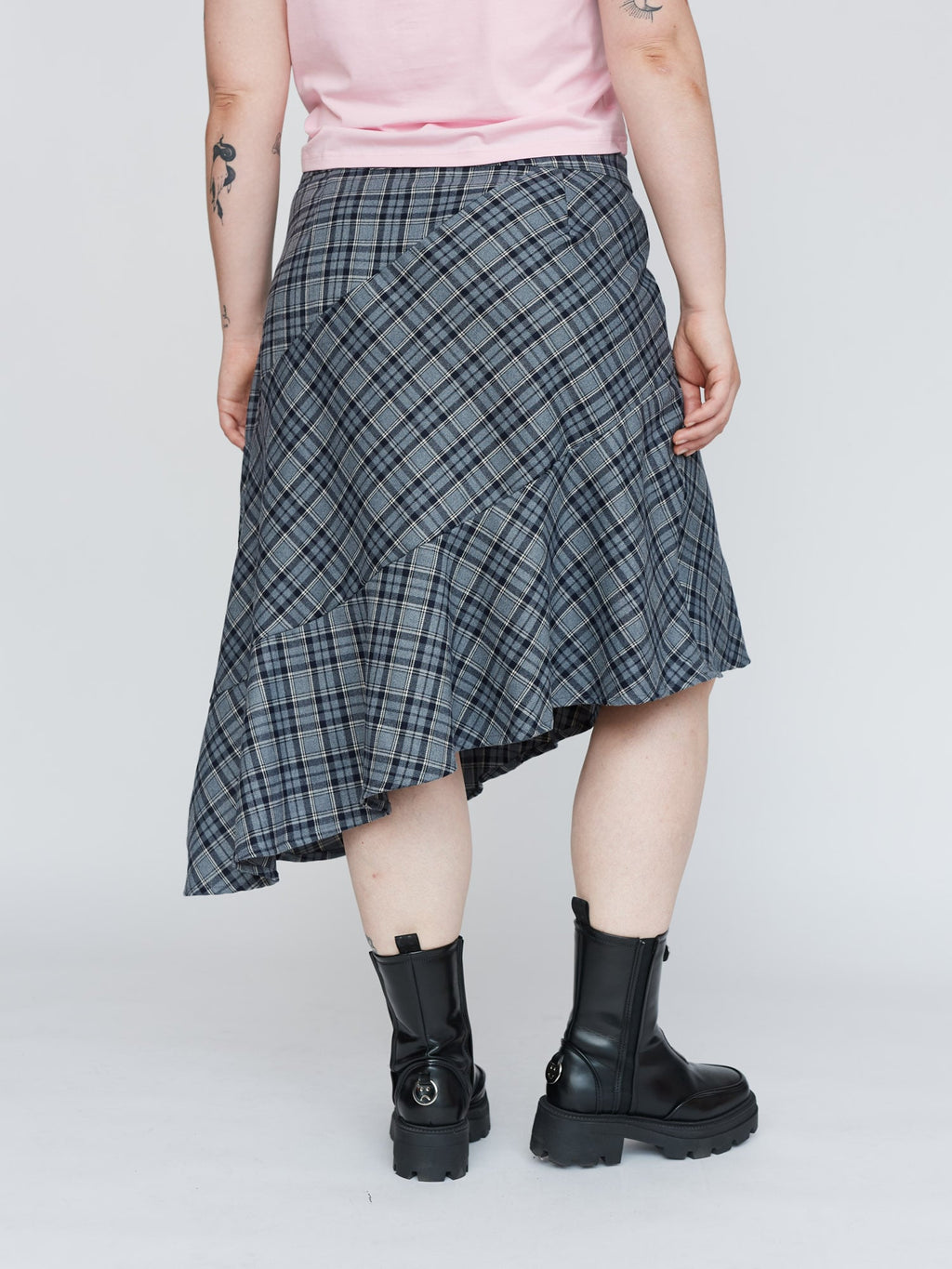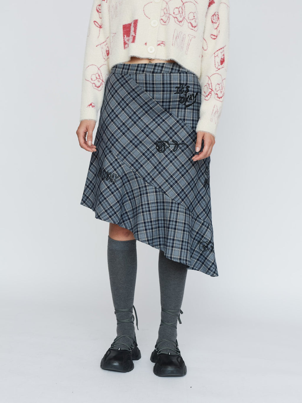 A new style for us, this panelled asymmetrical skirt is made from a brushed check fabric and is fastened by a concealed zip and button closure at the side seam. In contrasting black, there’s embroidery detailing of various doodles all across the skirt. You’ll be a doodler’s dream if you pair this up with our Roses are Red Cardigan
