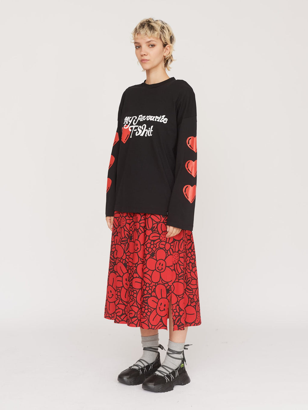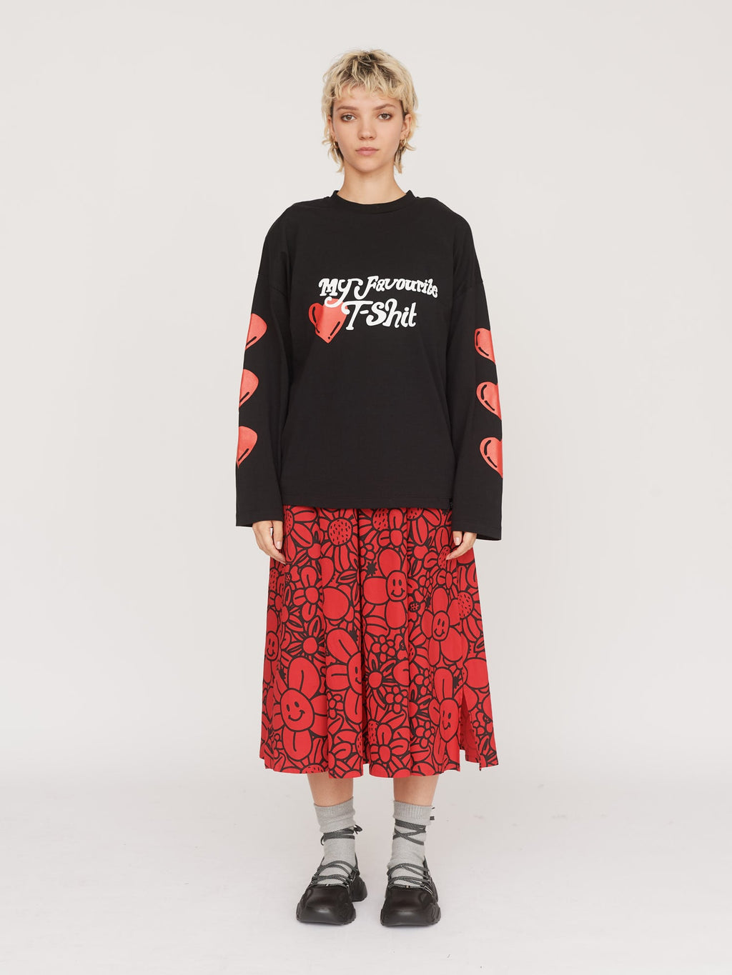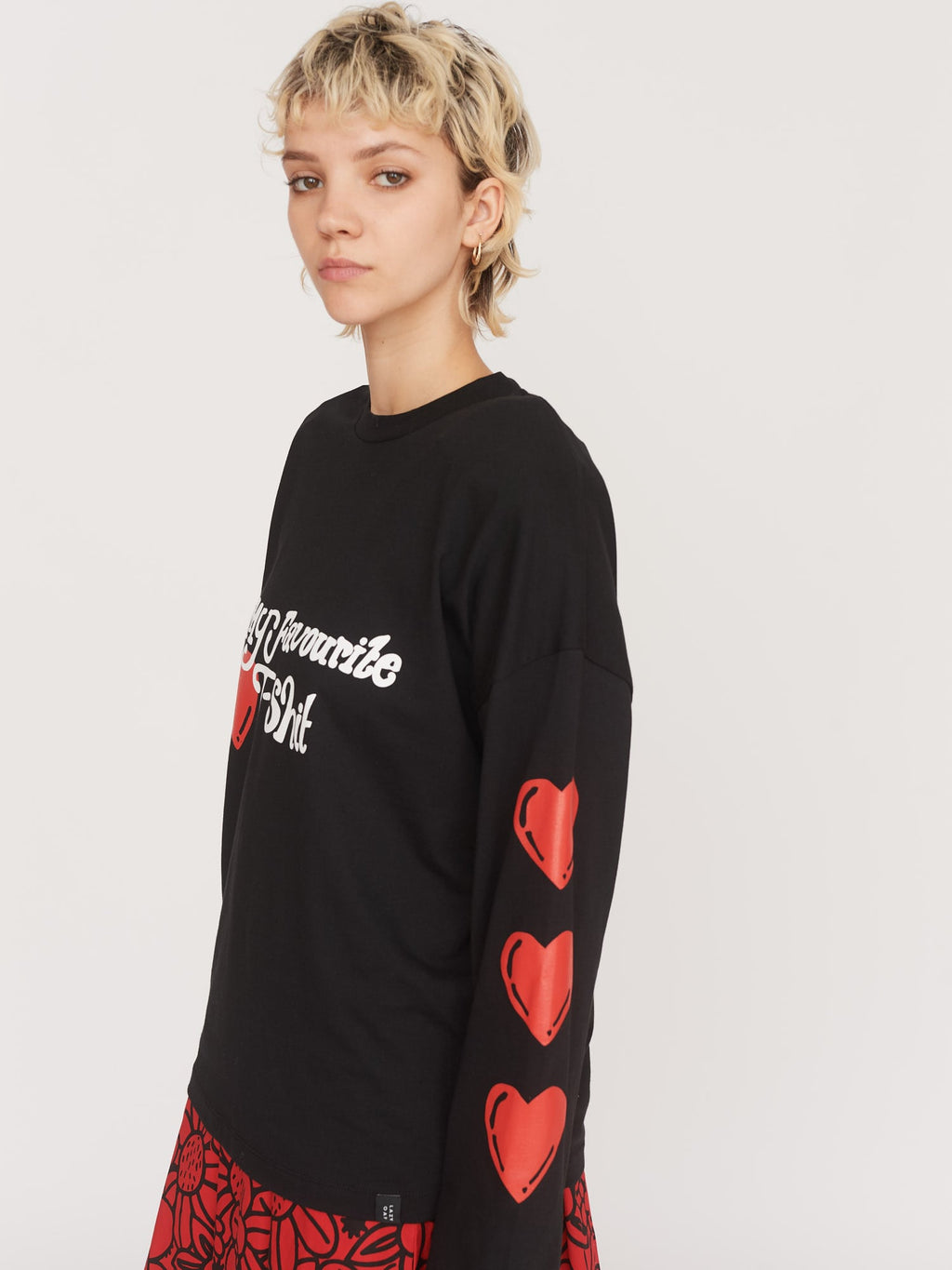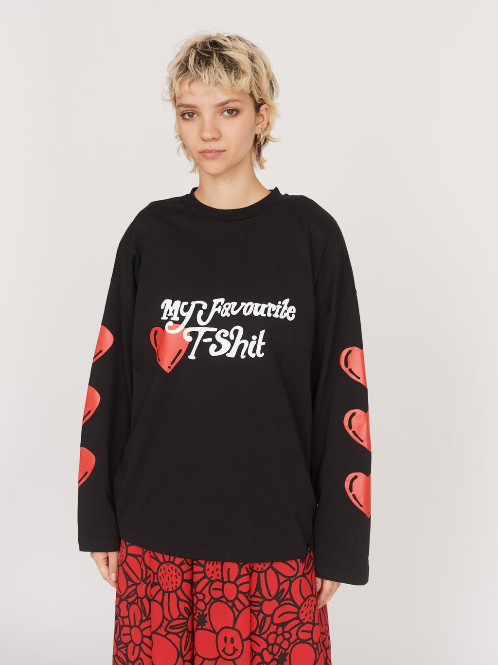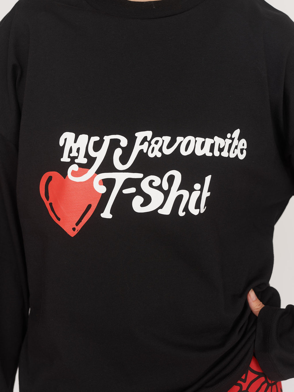 Our 100% cotton long sleeve t-shirt, has a relaxed fit with a ribbed neck, and is a perfect shape for all. This iteration features a red heart print across either sleeve, with white ‘My Favourite T-Shit’ text across the chest.