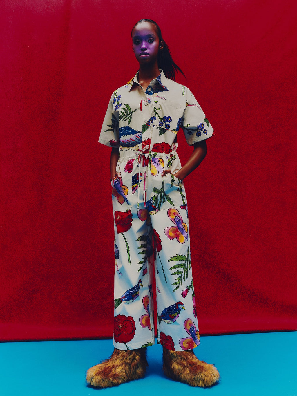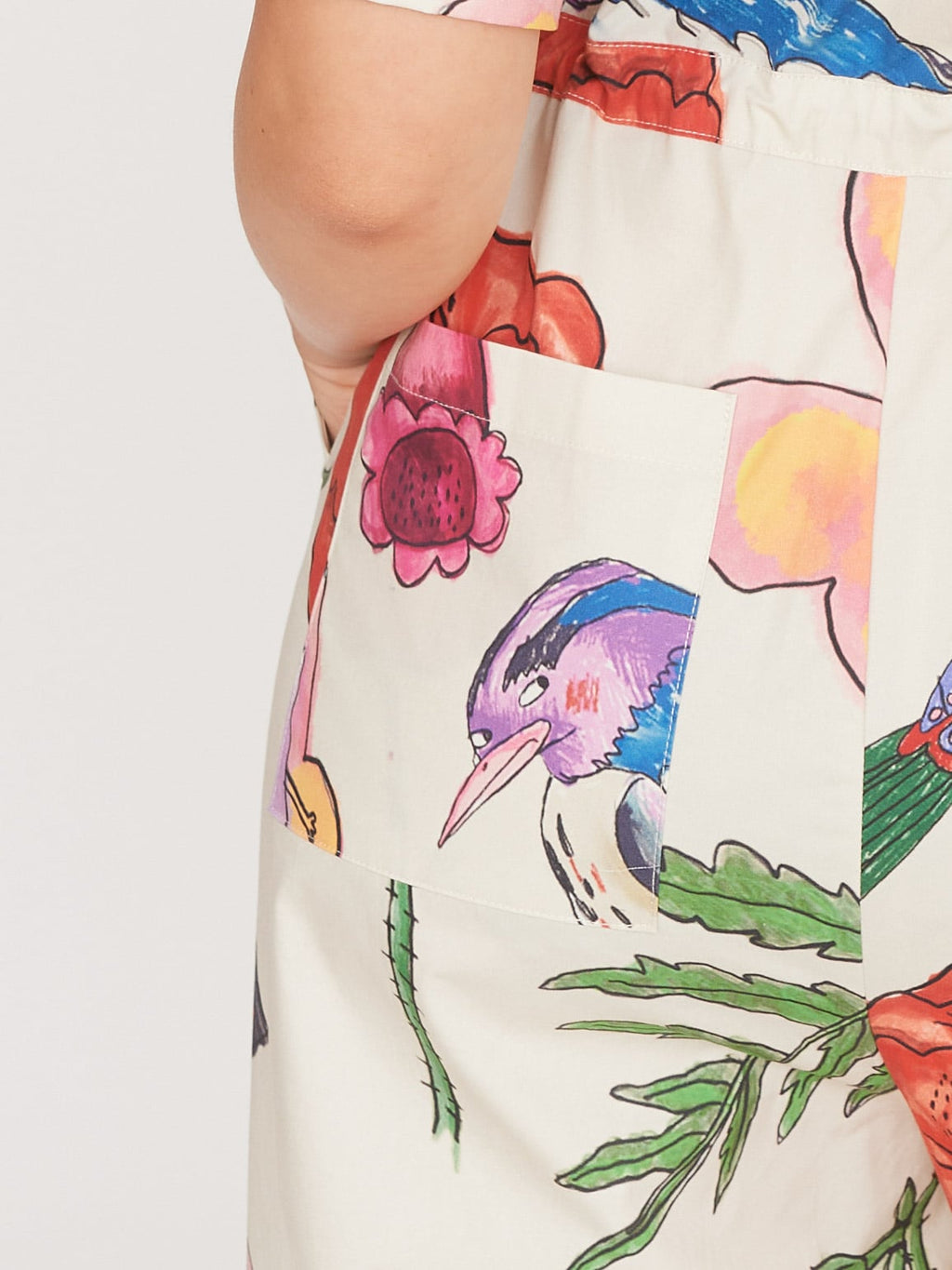 A jumpsuit that’ll make you feel just like you're roaming through the depths of Epping Forest when the weather is half-decent. In an all over flora and fauna print illustrated by none other than the King of Oaf, Gemma Shiel, this short sleeve jumpsuit has a centre front button closure with a shirt collar. The lightweight cotton fabric of the jumpsuit adds to the relaxed fit it has, along with the adjustable drawstring waist allowing you to change up the silhouette. It wouldn’t be very Oaf of us to not have pockets, would it? So of course there’s a chest pocket along with hip and back patch pockets. Its relaxed fit makes it ideal to layer under on the cold days, or wear alone on the warmer ones.