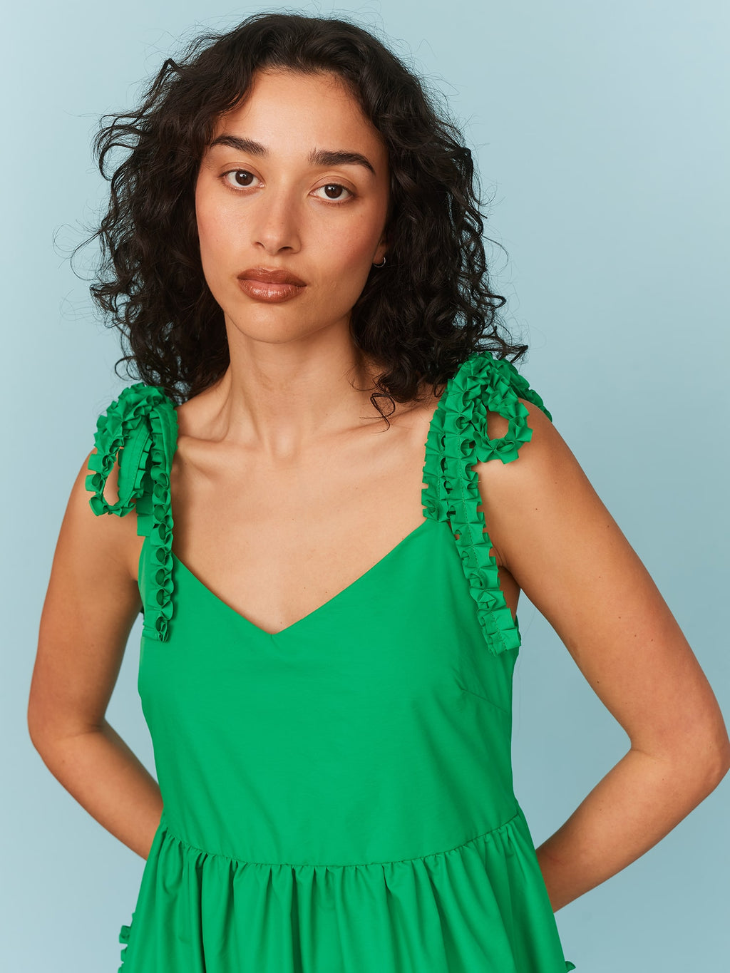 In vivid green, this midi length dress is made from a heavyweight satin-feel fabric and has adjustable, ruffle trim shoulder straps. The fitted bodice is fully lined and goes into a full skirt, which of course has pockets, and features applique flower detailing on either side. Fastenable by a concealed side seam zip, this'll be the dress that you can dial up or down for all your summer occasions.