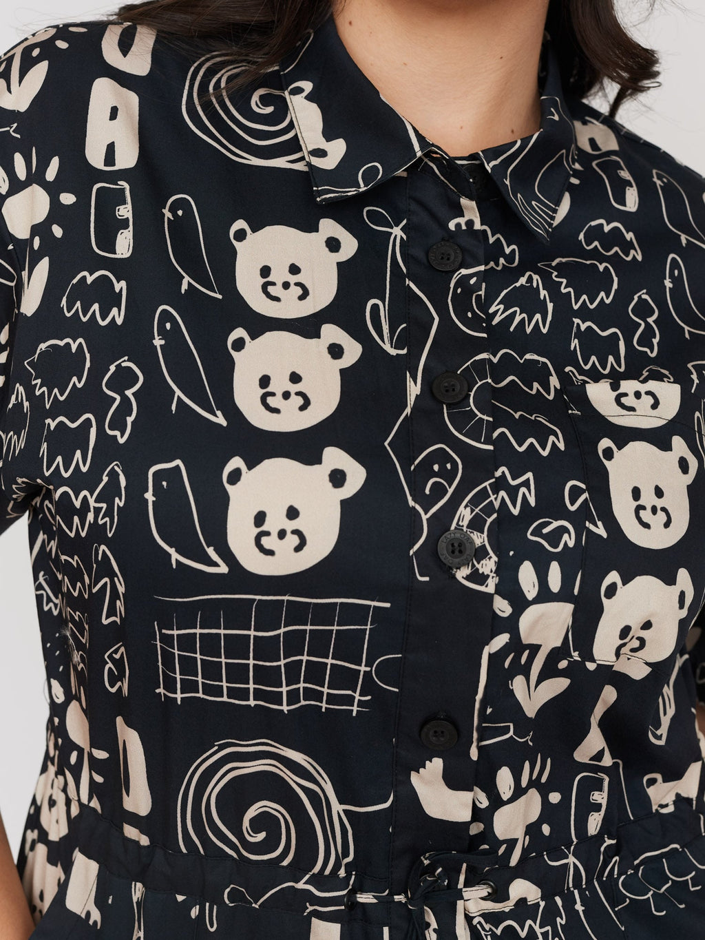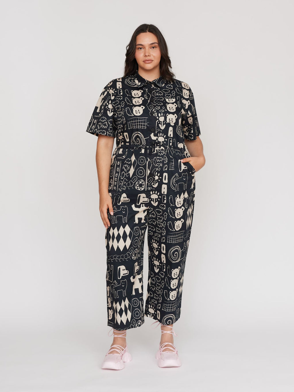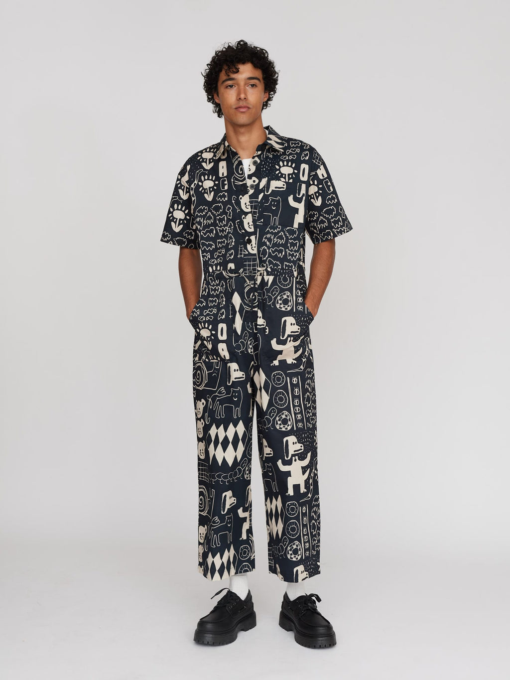 This navy collared jumpsuit is made from 100% cotton twill and has an all over contrasting print, made up of animal pals and doodles in all shapes and sizes. The fit is relaxed with a dropped shoulder and a slightly tapered leg. The waist has a functional drawcord and there are pockets at the hips, chest and on the back. From warm days to cold ones, this jumpsuit will be the perfect all-year round piece.