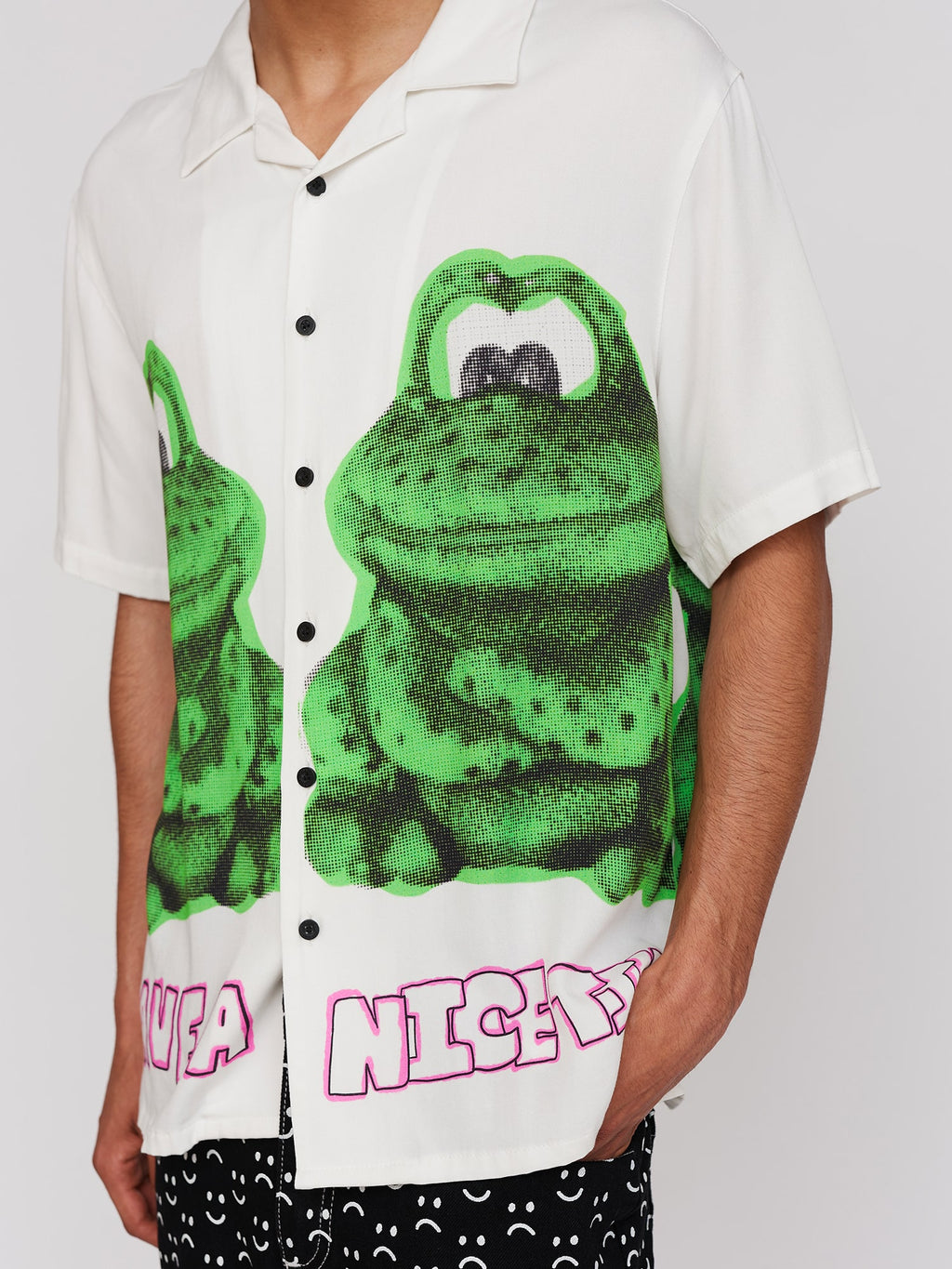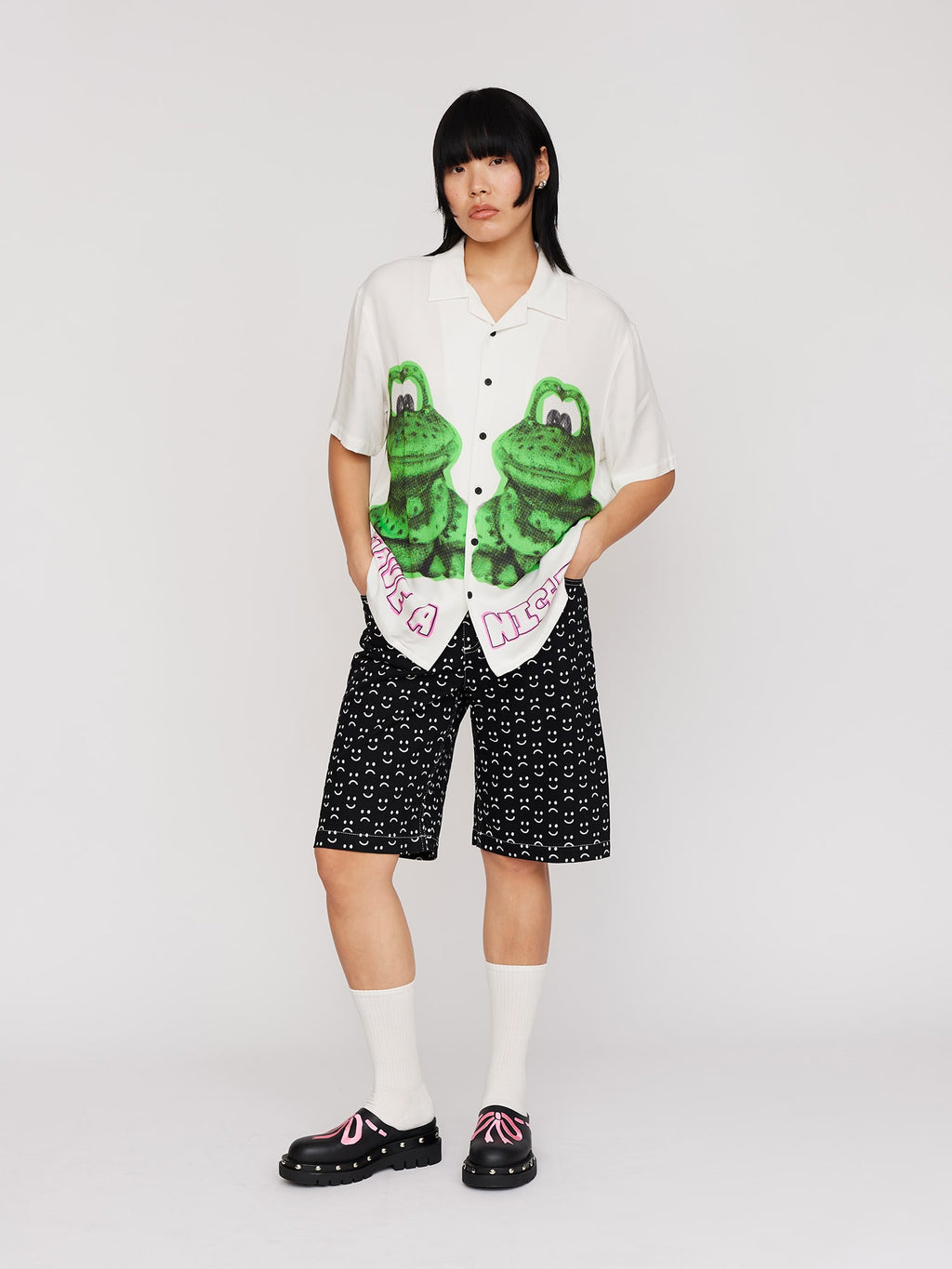Our bowling shirt shape has a relaxed fit with a dropped shoulder, and a branded button down front. Made from a super soft viscose fabric, it’s the perfect shape for wearing alone or layered. In white, it has a front and back placement print of a green frog and the text ‘Have a Nice Time’ in contrasting pink. This easy to wear style will be great for a summer of relaxing or raving.