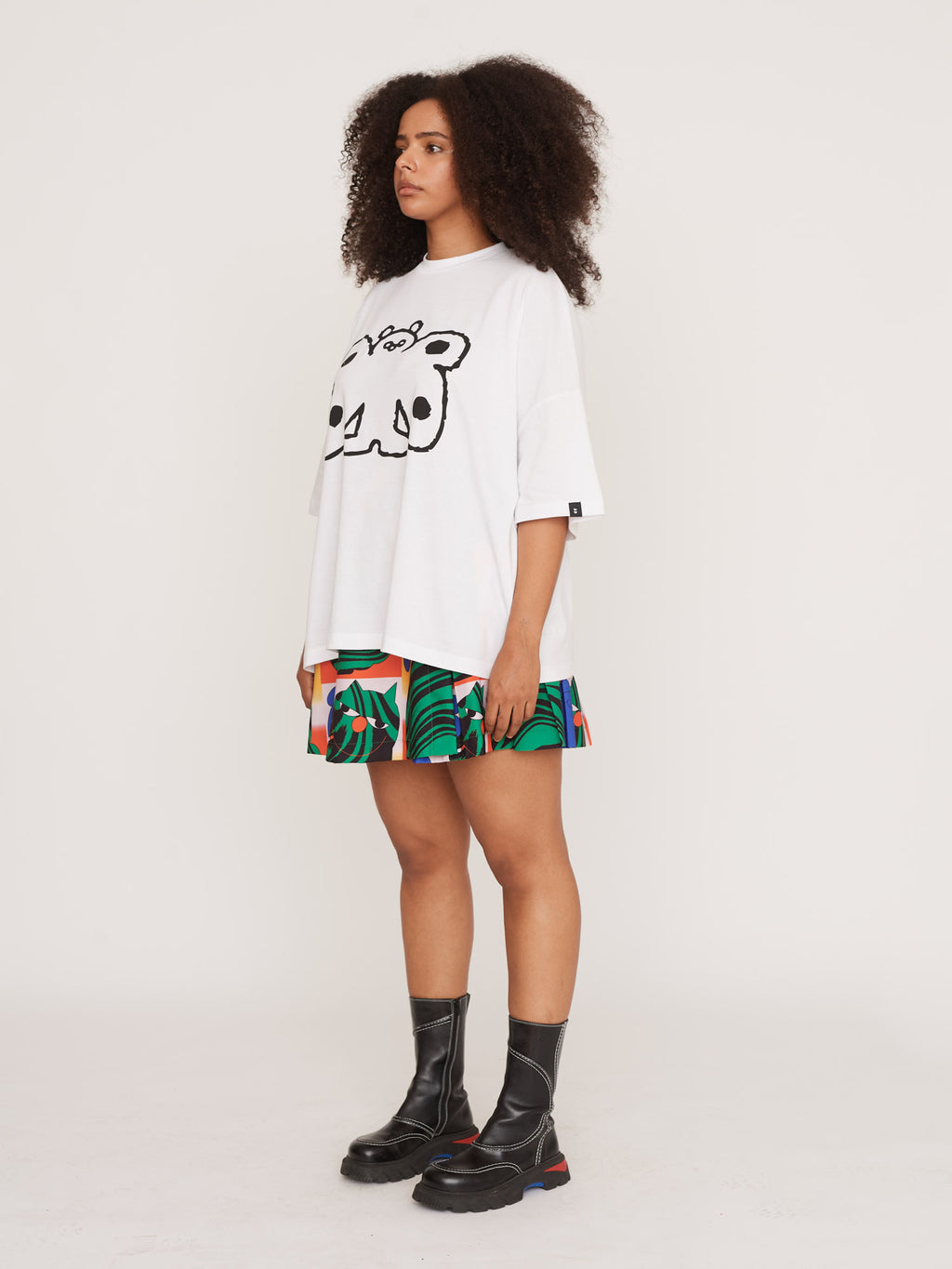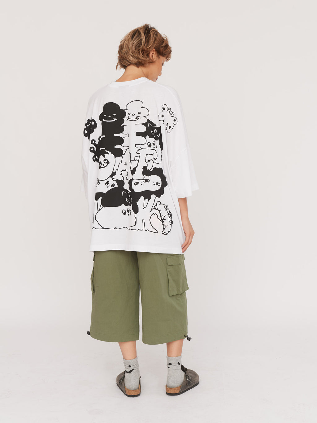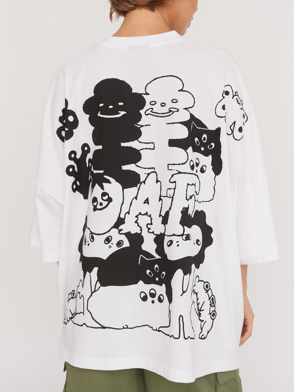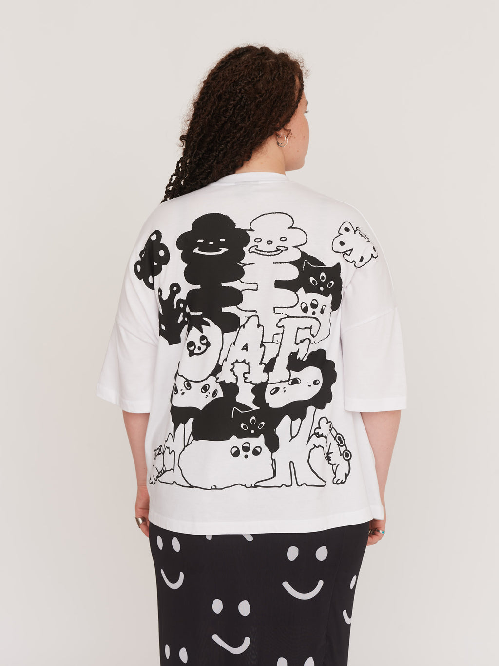 For the days when you wish you could wear your pyjamas out the house, here’s a tee for you. This 100% cotton white t-shirt is in our well-loved genderless big square shape, with a drop shoulder and ribbed neck. It features a black butterfly graphic on the centre of the chest, with a garden party graphic on the back by Larissa Laban (@larissalaban). Can someone get us on the guestlist for this?!