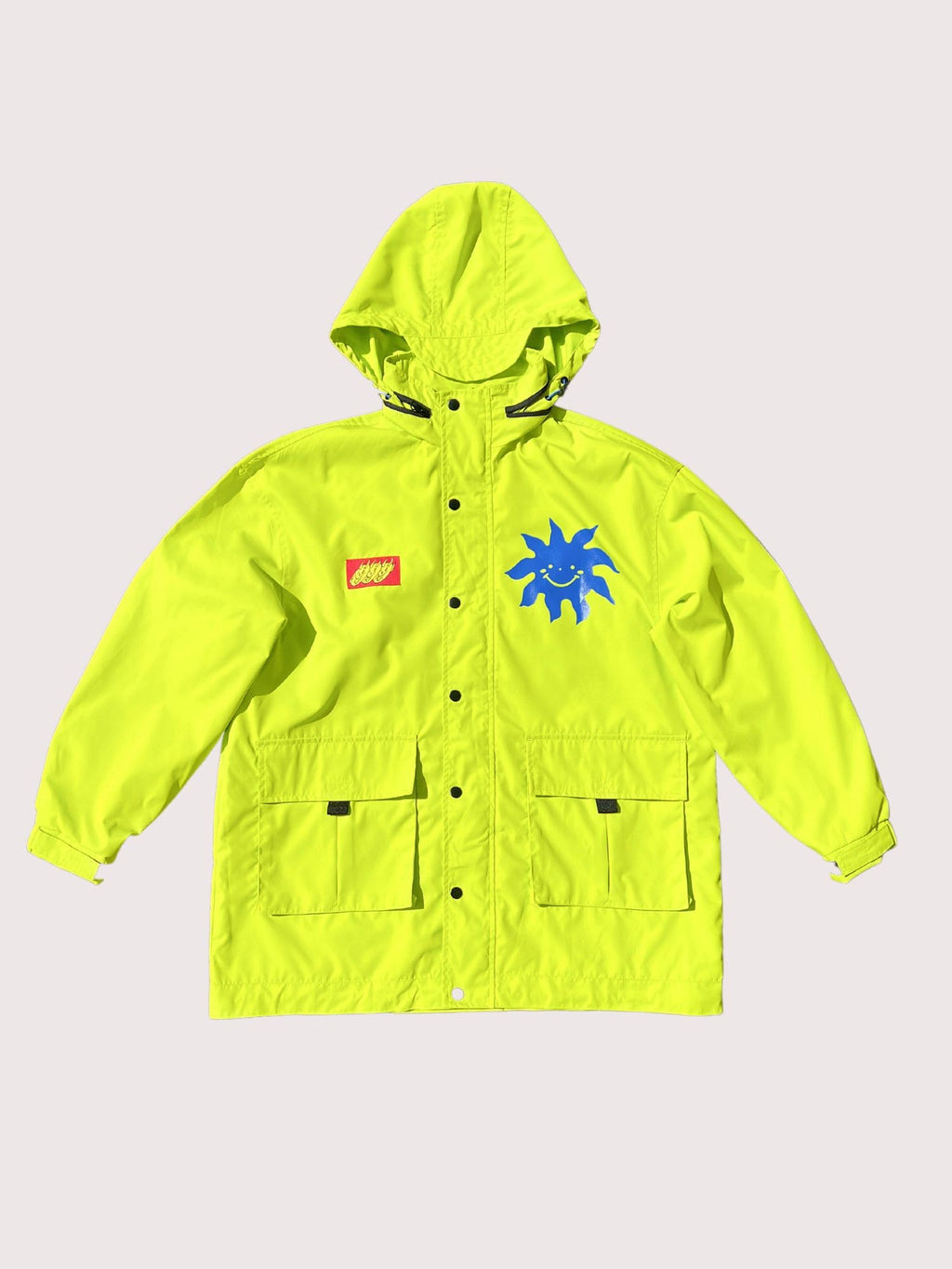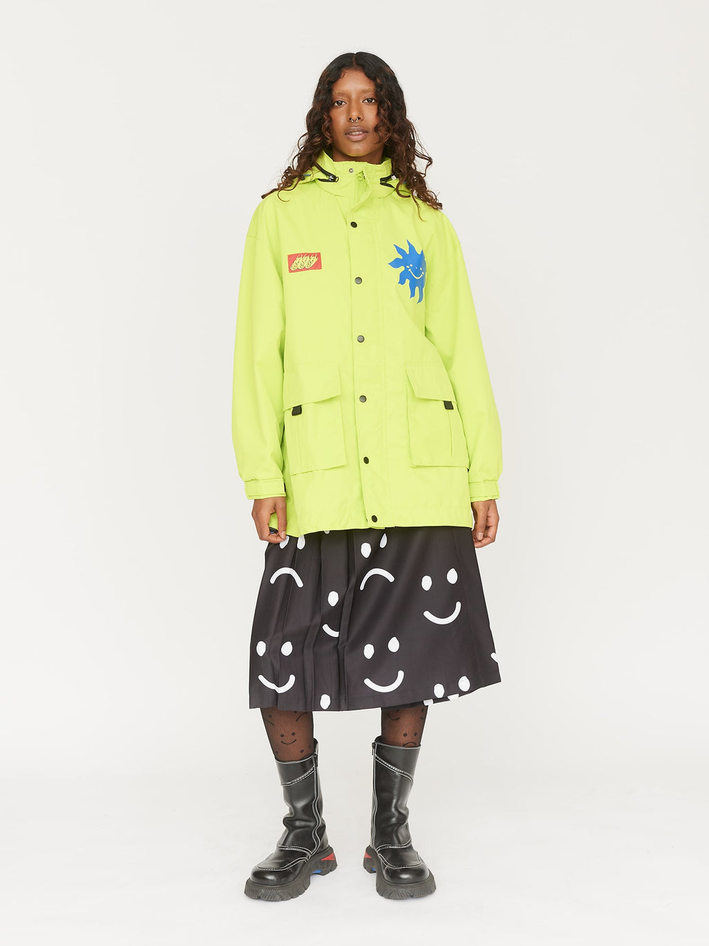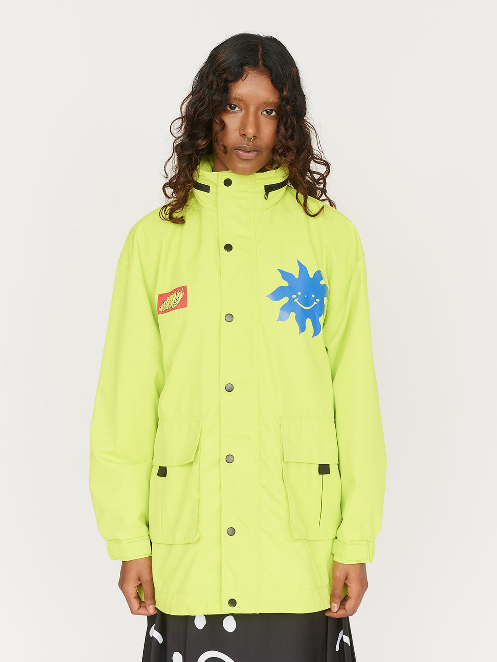 You’ll be the star of the rave in this bad boy. This lined neon green jacket has an oversized, relaxed and is shower resistant. There are blue designs dotted across the jacket by Larissa Laban (@larissalaban) and a woven chest patch illustration by Gavin Conell (@gavconl). It has a front zip closure with snap metal fastenings, an adjustable packaway hood along with elasticated cuffs with a velcro strap to tighten. Keeping you covered on the go, this jacket has two front pockets with velcro closures and an internal one on the left side of the chest.