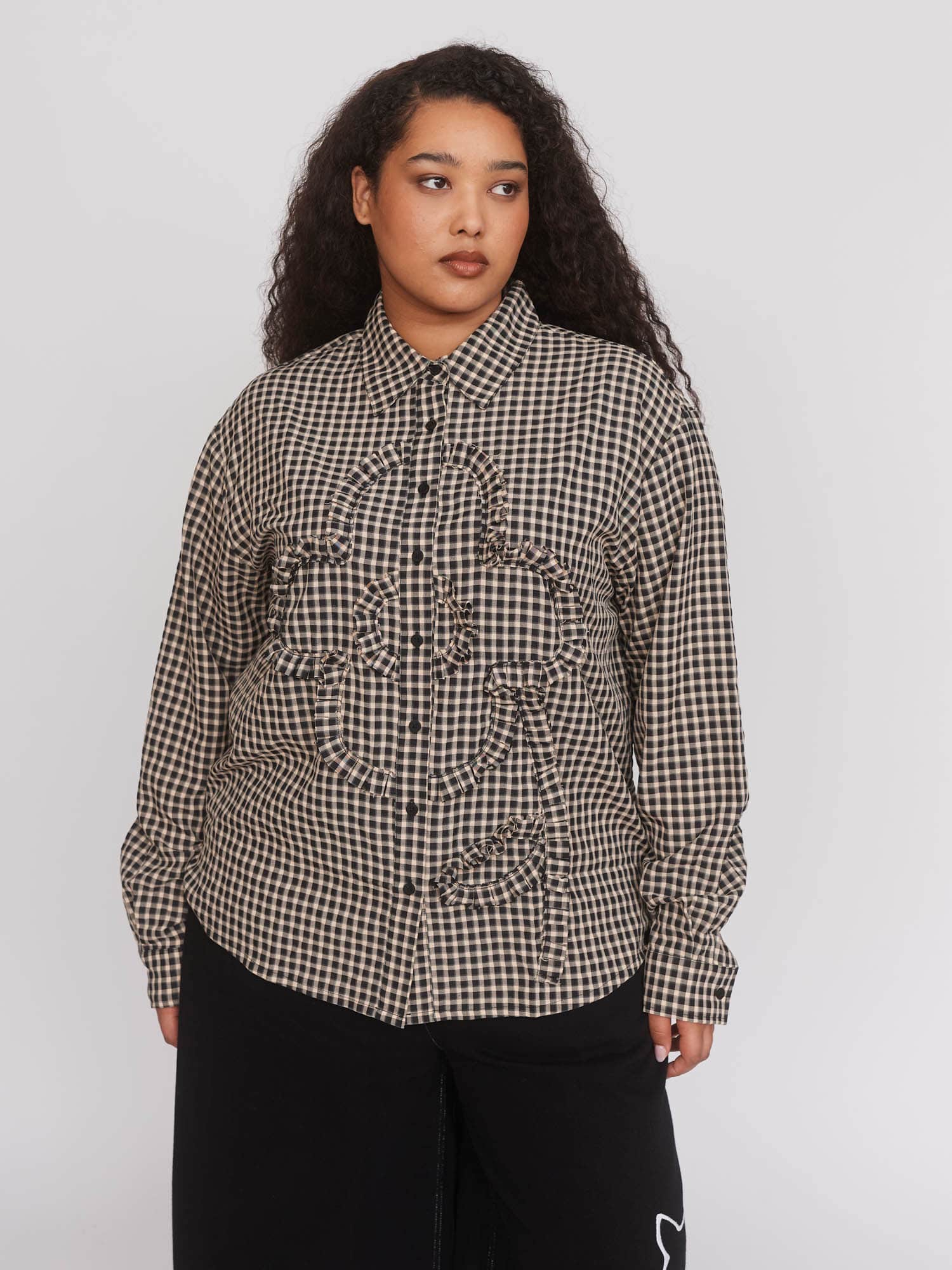 In brown gingham, this midi skirt has an elasticated shirred hip panel and of course, side seam pockets. In the same fabric, there are pleated, applique flower details on either side of the skirt. If you’re loving the flowers, you're gonna want to pair this with our Gingham Flower Shirt - you’re welcome.