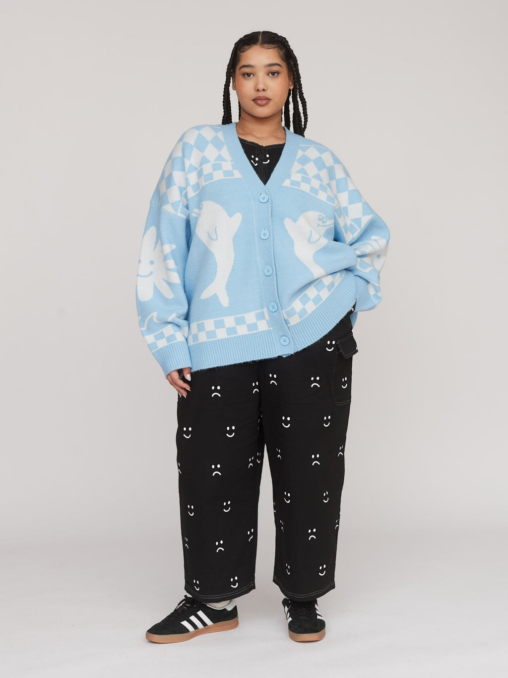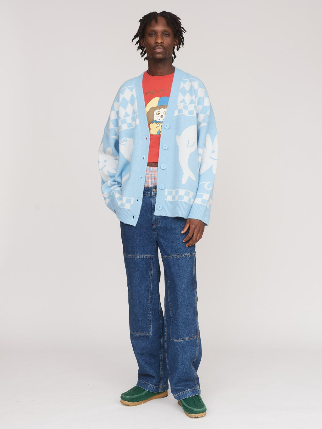 Cardigans are the ideal throw on piece for the changing seasons, and we feel like we’ve got this garment down to a tee. In a super soft knit, this genderless cardigan has an oversized fit with a dropped shoulder and a classic button down front. There’s an intrasia design in contrasting white across the front, back, and sleeves. The ribbed cuffs and hem give the cardigan a great shape, as well as make sure your sleeves don’t get in the way. For the warmer days, this will be perfect worn alone but if there’s a chill in the air, why not layer a hoodie underneath for a lil extra cosiness?