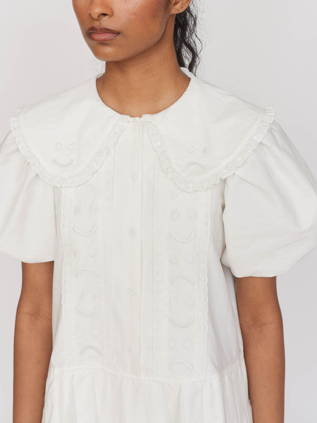 You guys went bloody bat-shit crazy for our Happy Sad Embroidered Shirt so you know what we thought - let’s make it a dress. Made from 100% cotton, this short-sleeve, shirt dress has an oversized collar with lace ruffle trim which features Happy Sad embroidery giving it an embossed look. On the front panels either side of the buttons is the same motif and detailing as the collar. The full, mini length skirt is pleated and fully lined so you don’t have to worry about the sun, or wind, doing you dirty. Style with our classic Happy Sad Socks and Slimbos for the perfect day to night summer look.