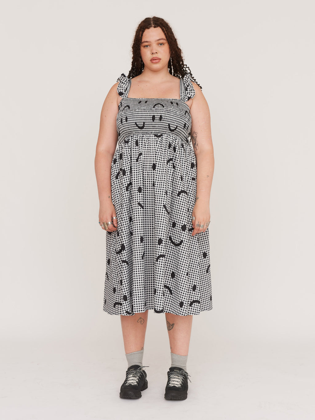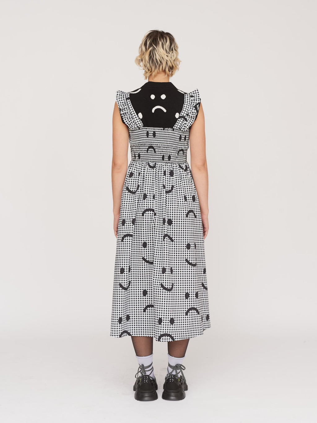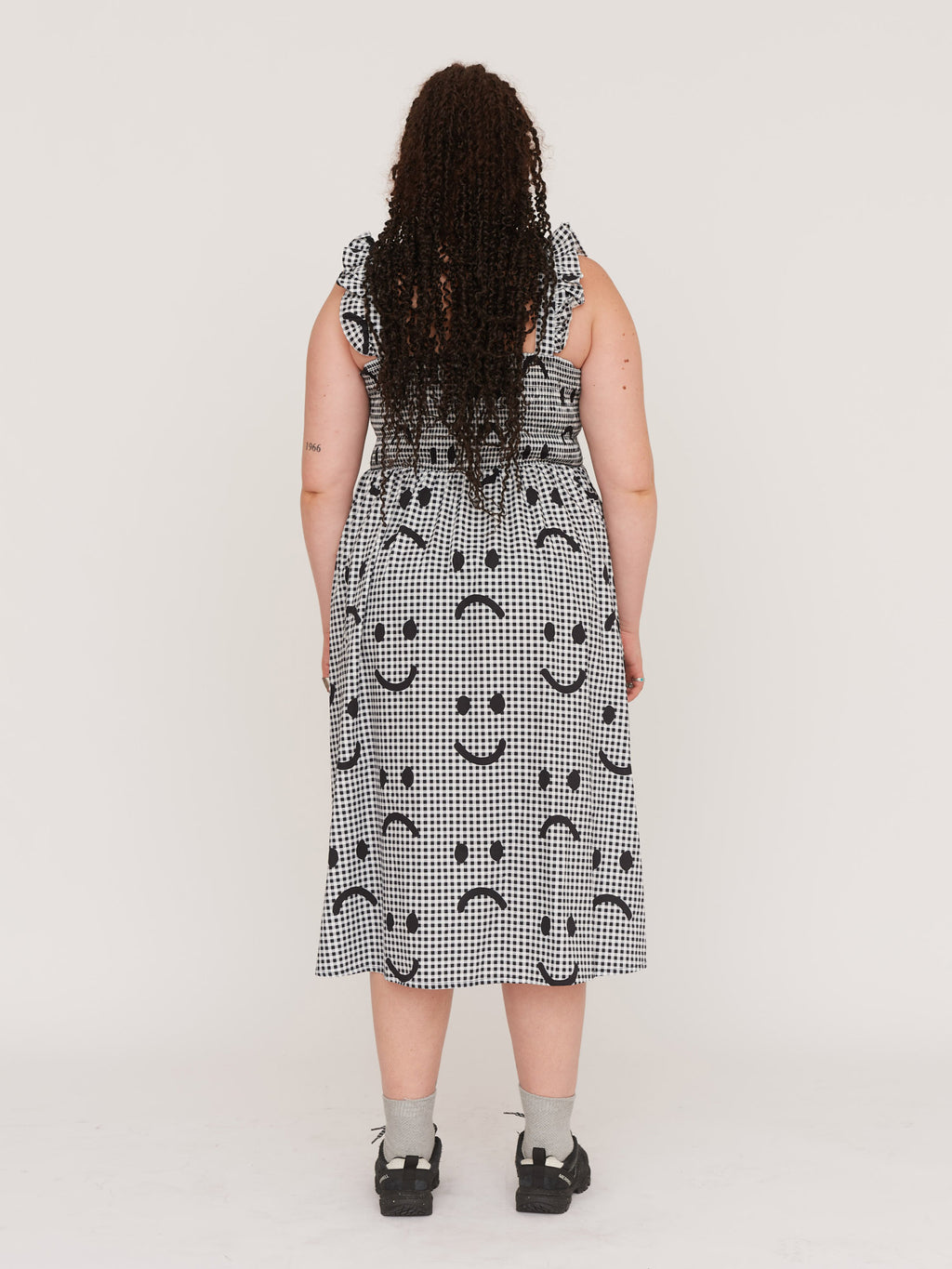 This dress is a super wearable and comfortable shape, in a relaxed smock style with a midi skirt, ruffle shoulders, and two side seam pockets. This one is in an all over print of our signature Happy Sad design.