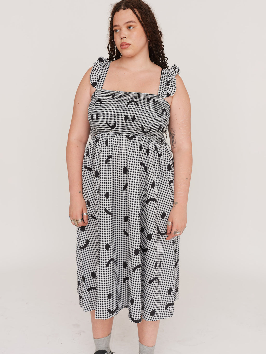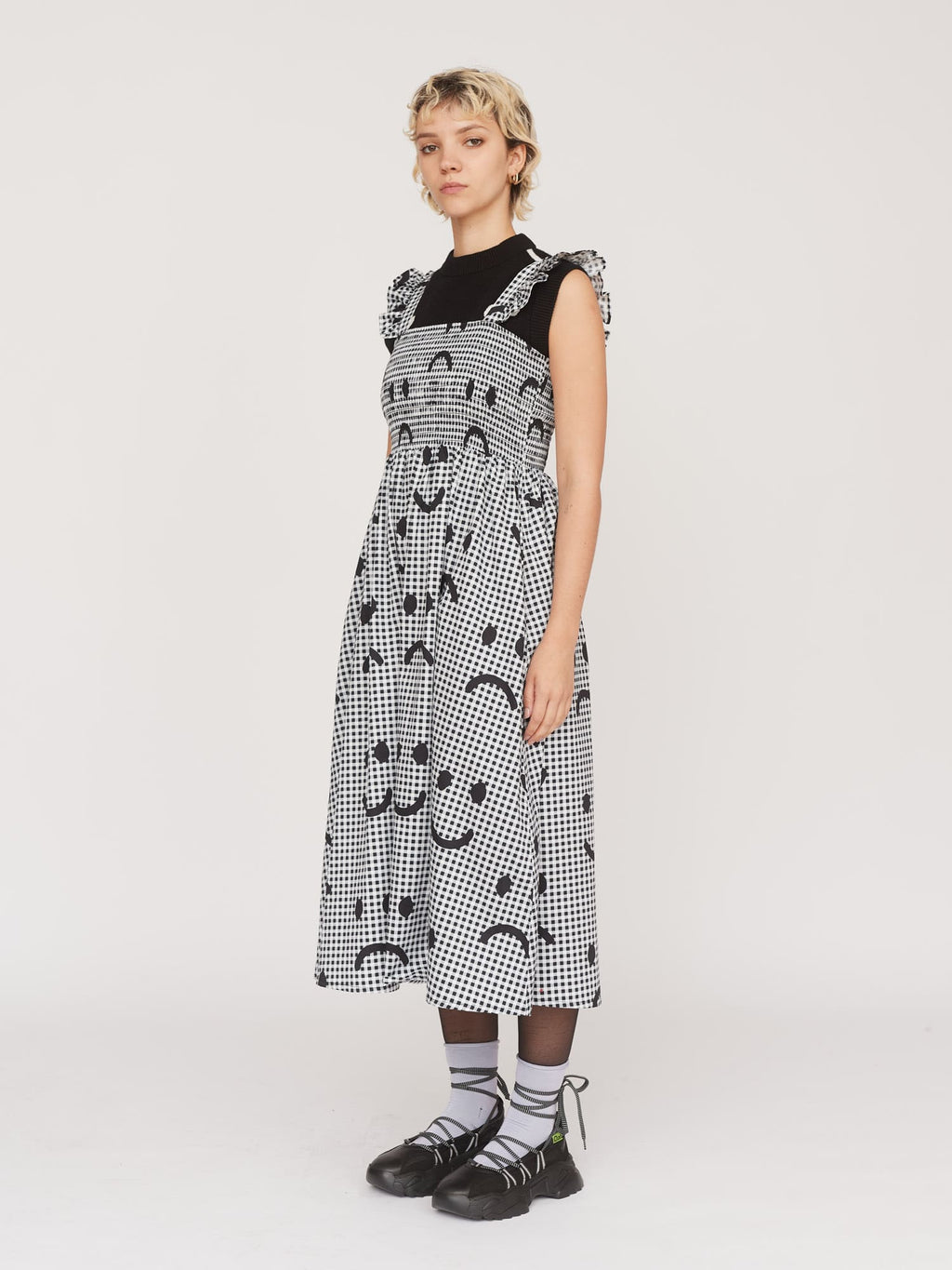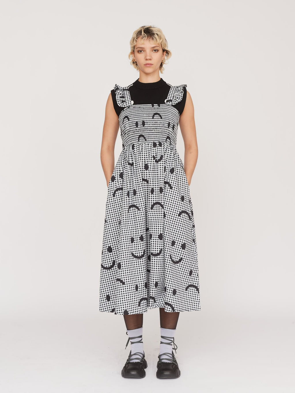 This dress is a super wearable and comfortable shape, in a relaxed smock style with a midi skirt, ruffle shoulders, and two side seam pockets. This one is in an all over print of our signature Happy Sad design.