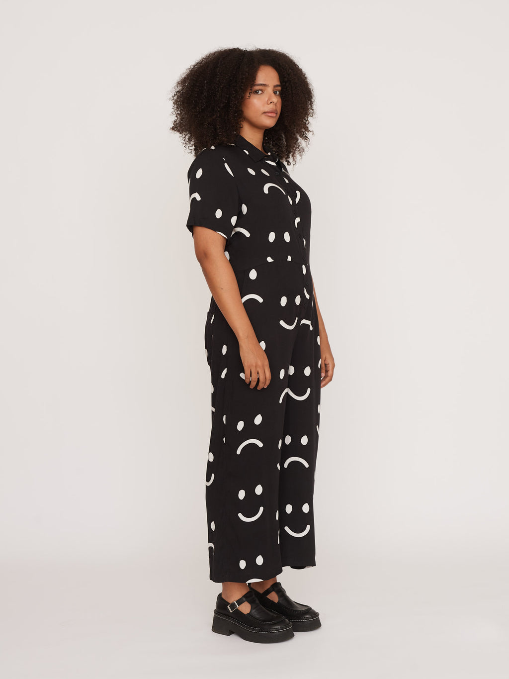 This Happy Sad Jumpsuit features a classic, button up shirt-style with short sleeves and wide fit legs for comfort. This will be your go to wardrobe essential and perfect for all seasons.The details:- Short sleeve happy sad jumpsuit