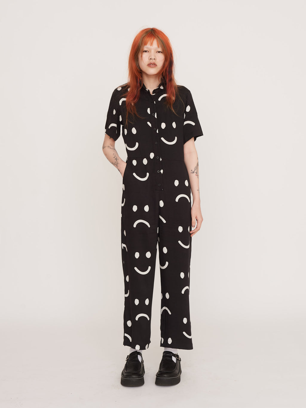 This Happy Sad Jumpsuit features a classic, button up shirt-style with short sleeves and wide fit legs for comfort. This will be your go to wardrobe essential and perfect for all seasons.
