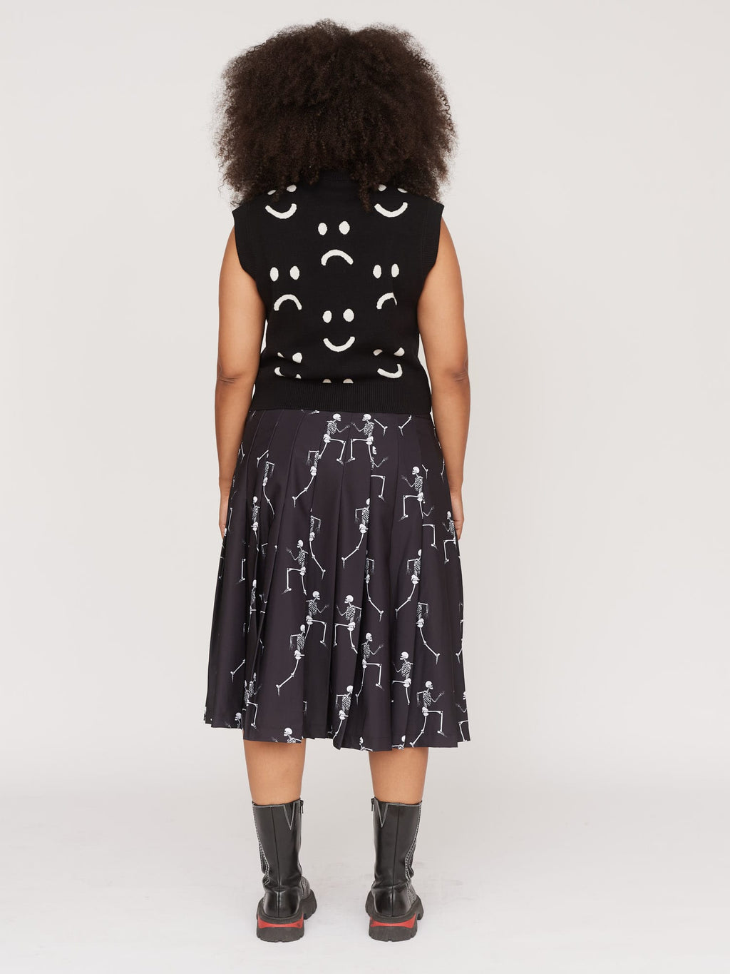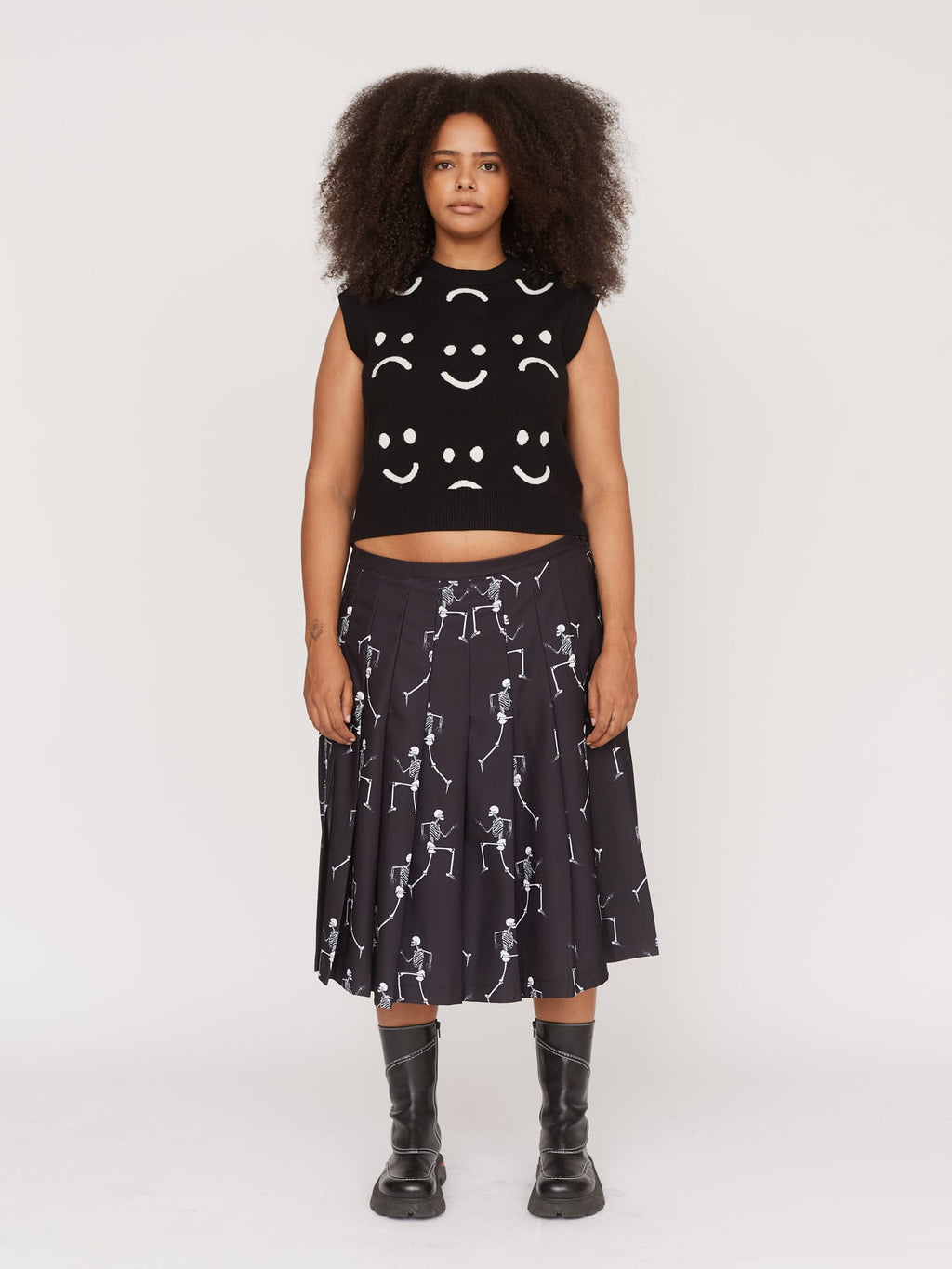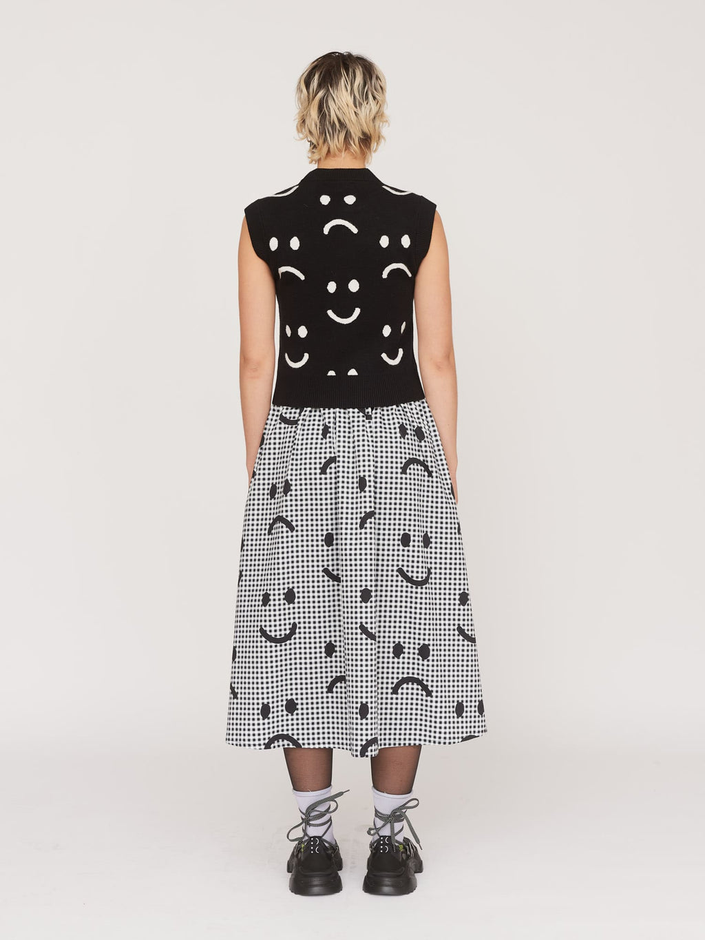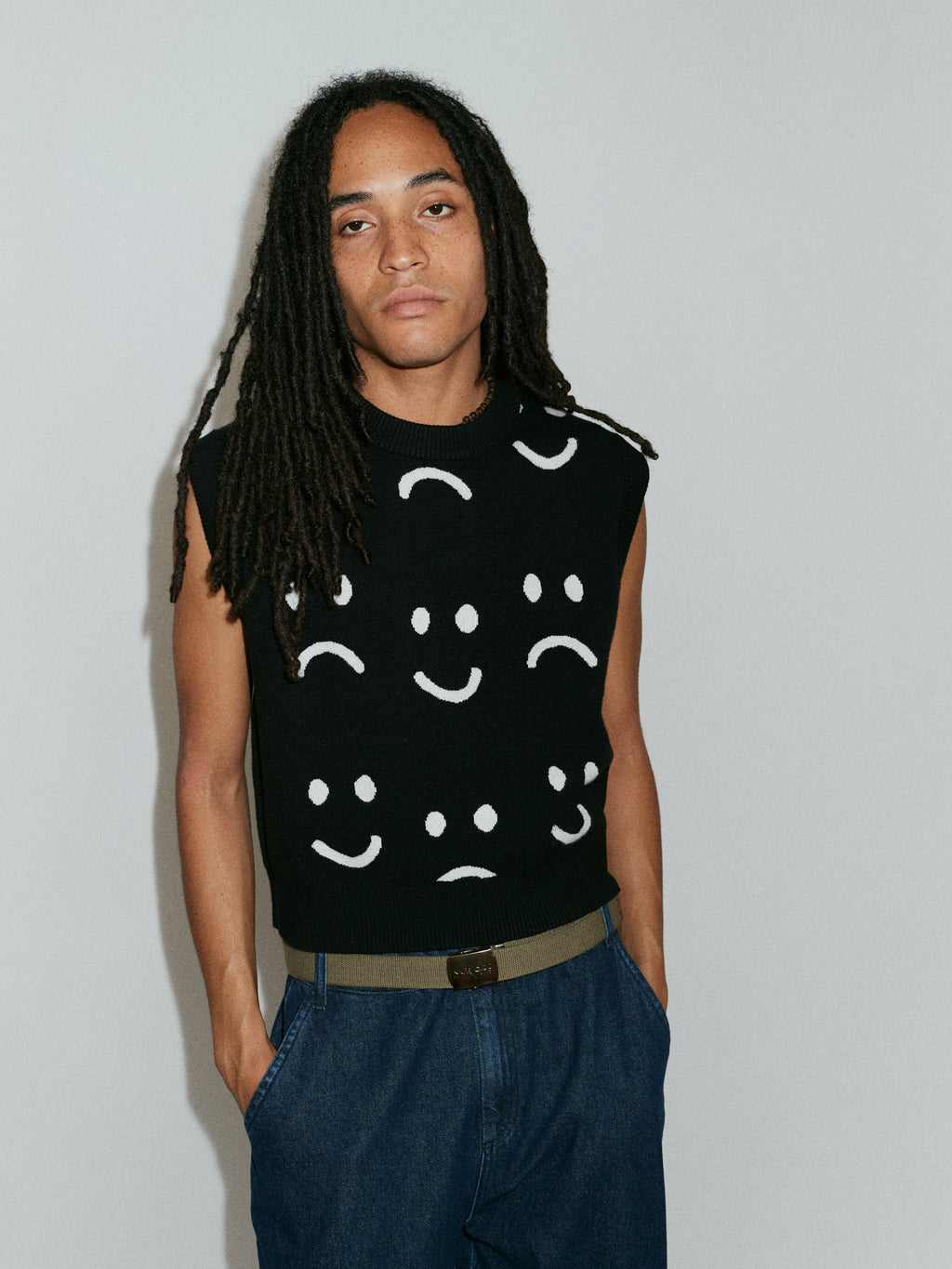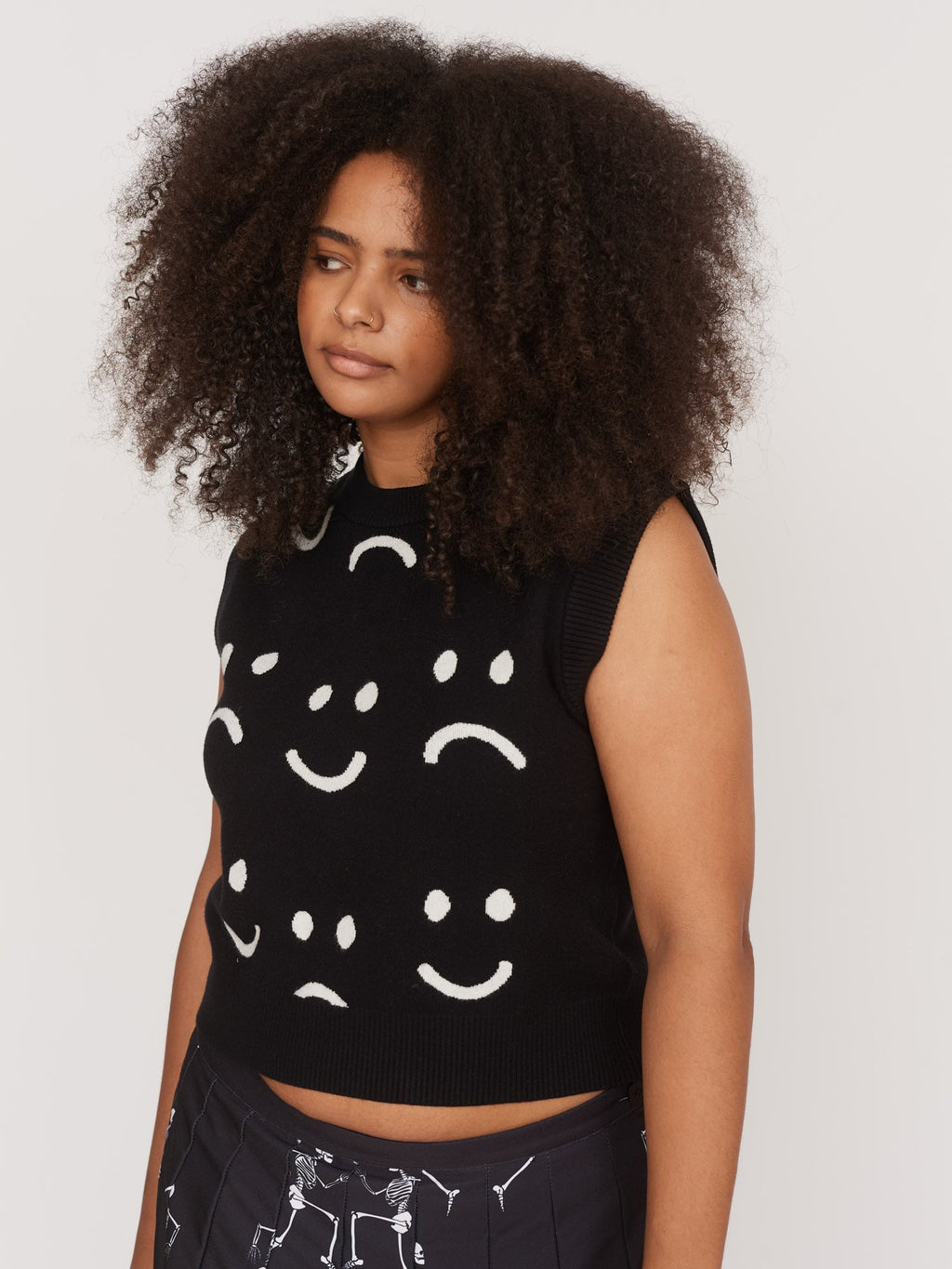 Our fitted acrylic knit vest features an intarsia all over happy sad design. It has a slightly cropped fit with ribbed hem, neck and armholes. This lightweight knit can be worn alone or layered, making it ideal for all seasons.