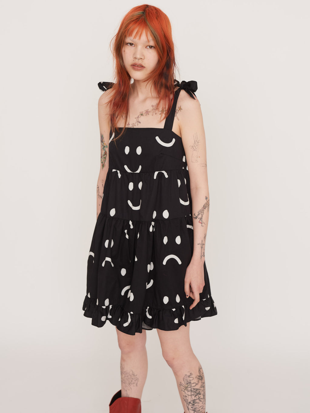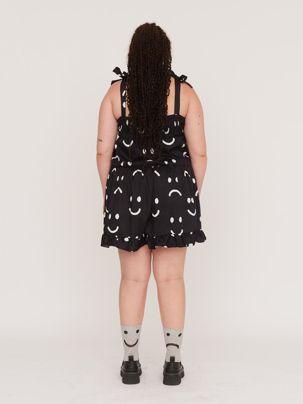 This is going to be a summer essential, ready to be thrown on for last minute pub plans. In our signature happy sad print, this is a relaxed and loose fit romper, with a tiered body and a ruffled hem, plus adjustable tie shoulders, which means you can change the fit to what’s comfortable for you.