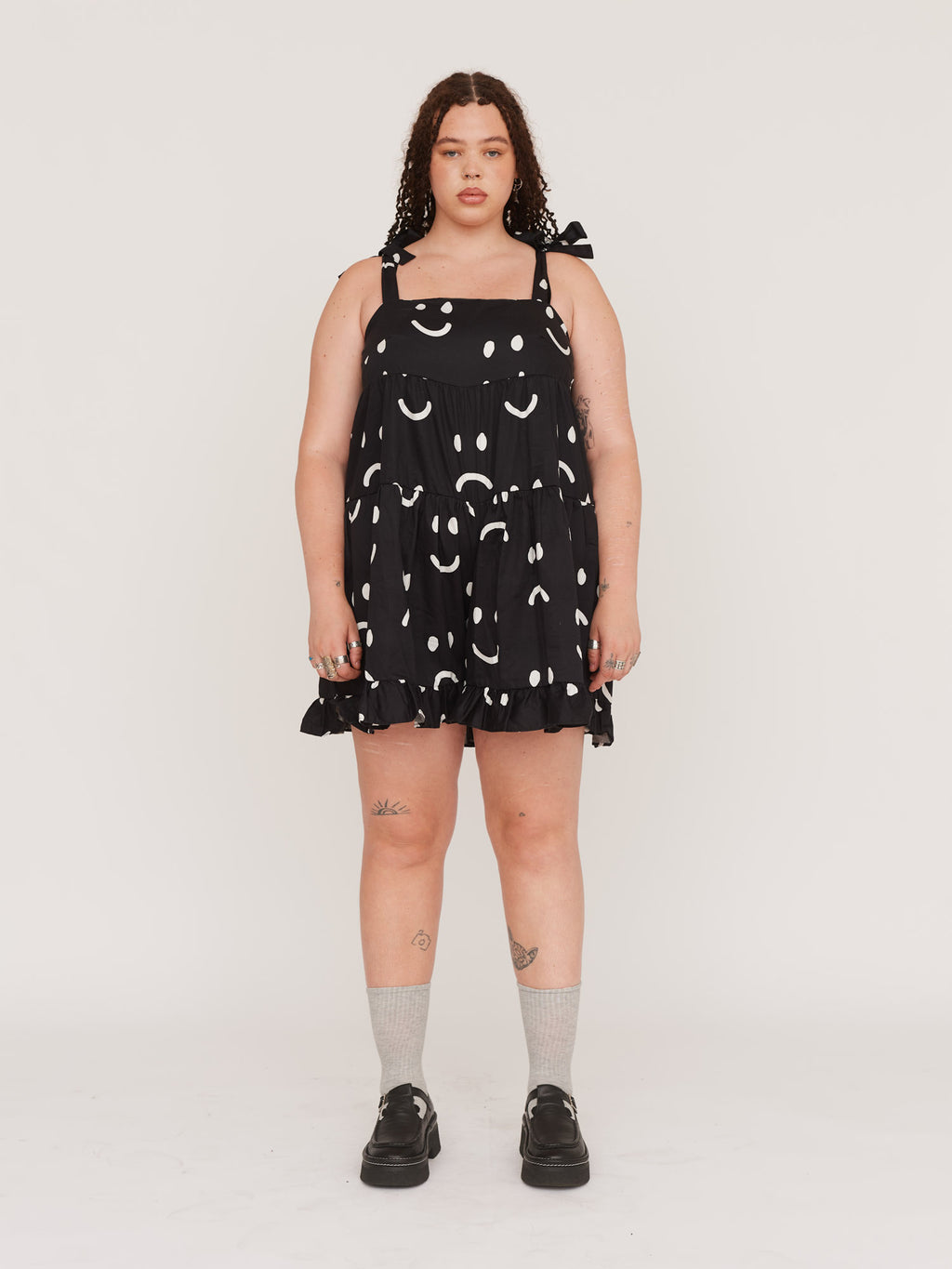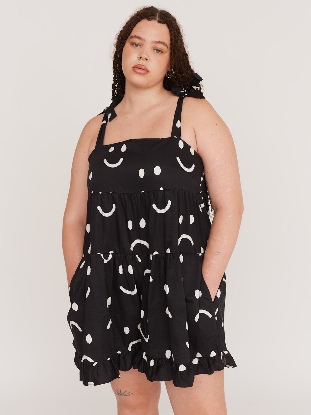 This is going to be a summer essential, ready to be thrown on for last minute pub plans. In our signature happy sad print, this is a relaxed and loose fit romper, with a tiered body and a ruffled hem, plus adjustable tie shoulders, which means you can change the fit to what’s comfortable for you.Need help with your order? CONTACT US