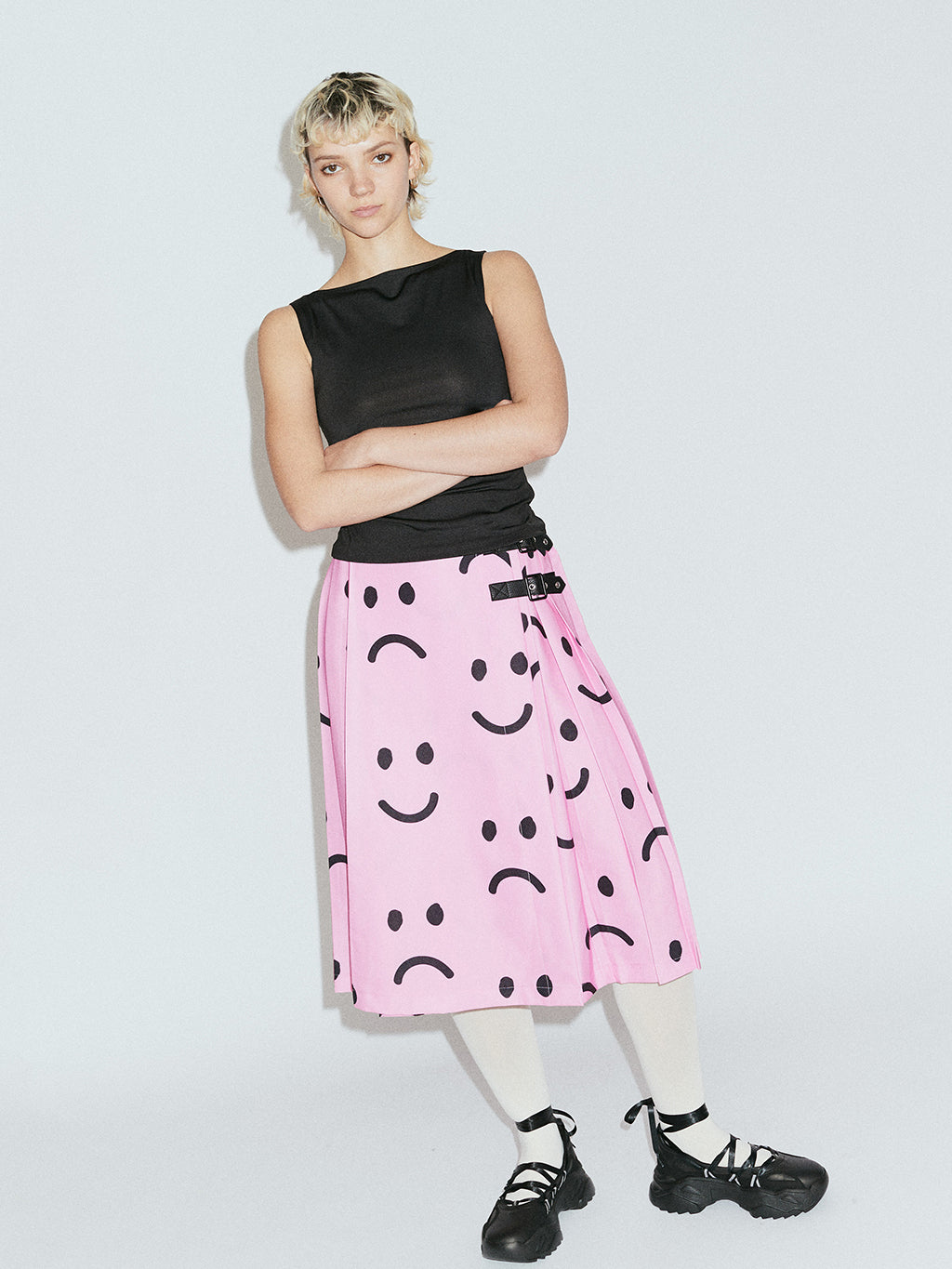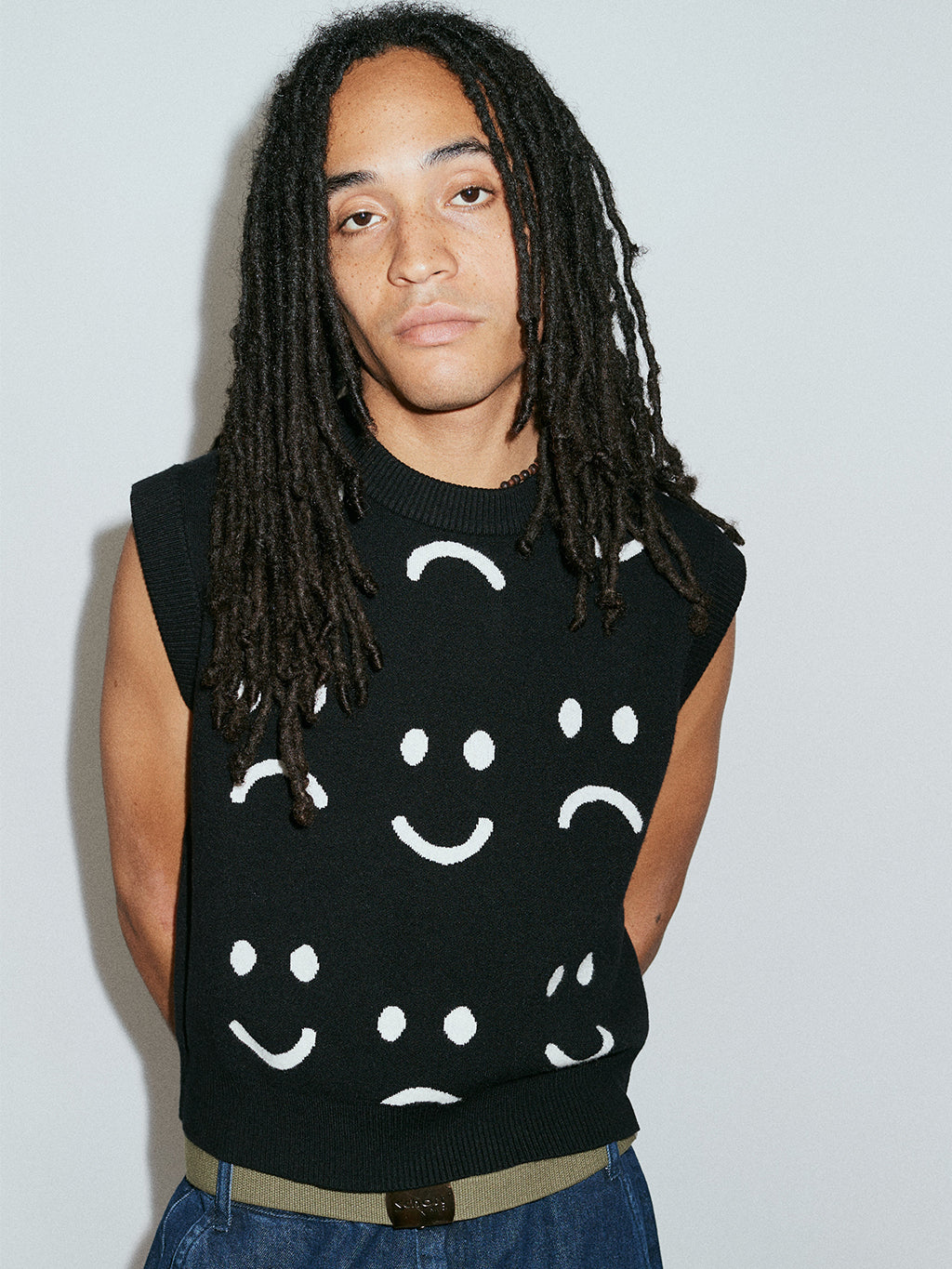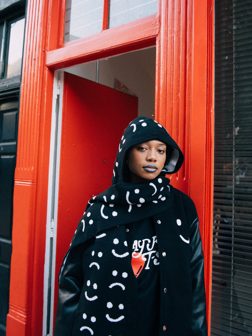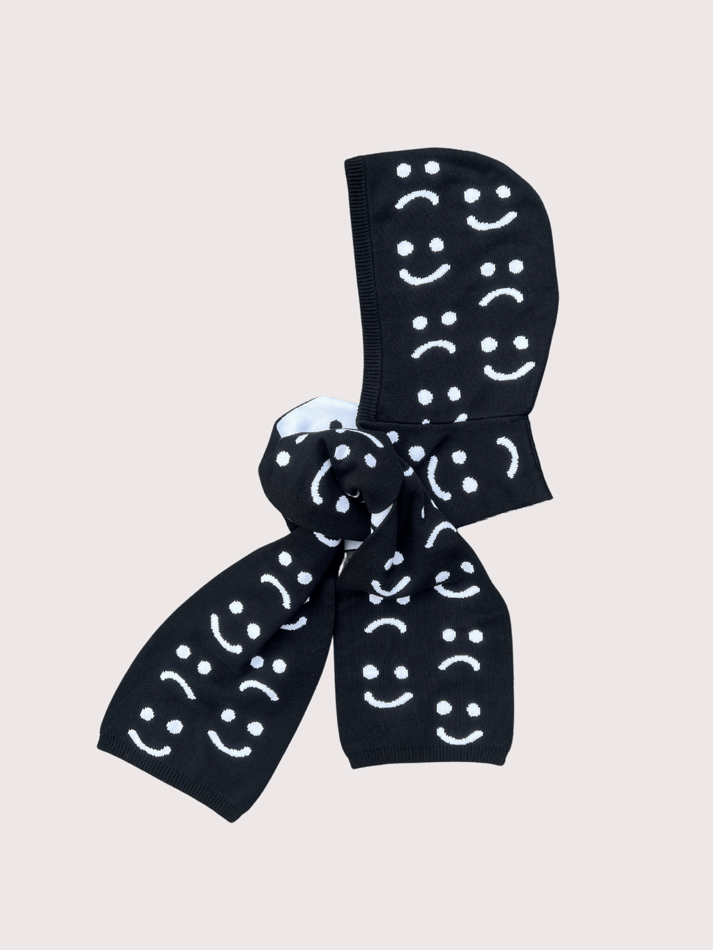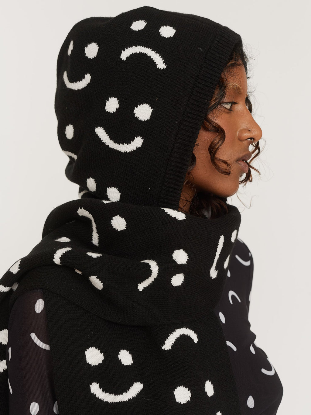 This new style is taking everything you know and love about a snood, to a whole new level. In a cotton knit blend, with an all over intarsia happy sad design, this scarf features a built in hood. The heavier weight of the fabric helps it sit perfectly as a scarf or hood, and the inside features a contrasting white with black happy sad design. This is going to be your cold weather hero.