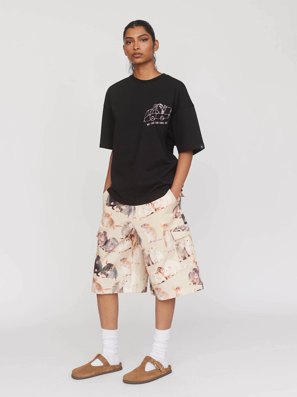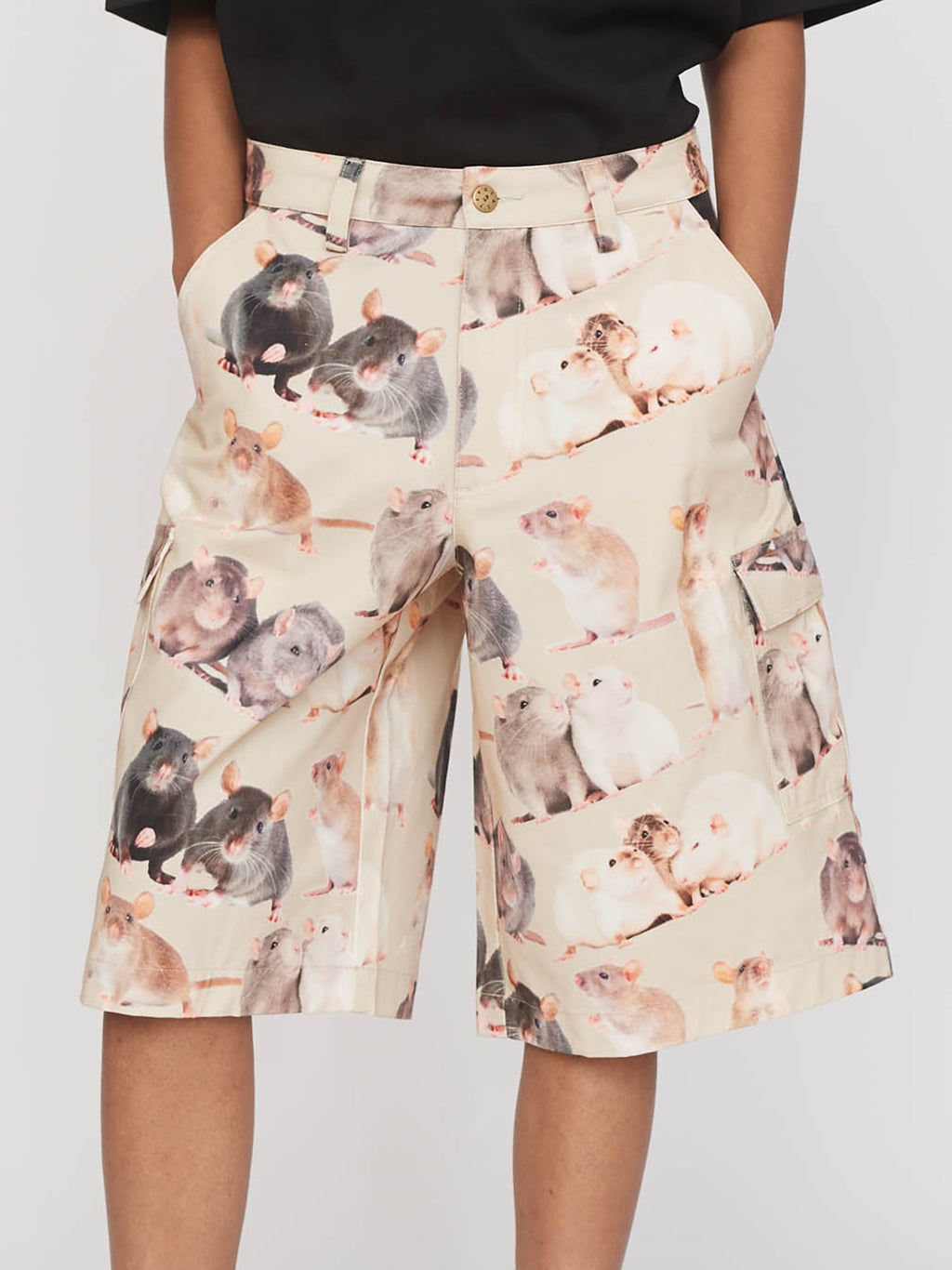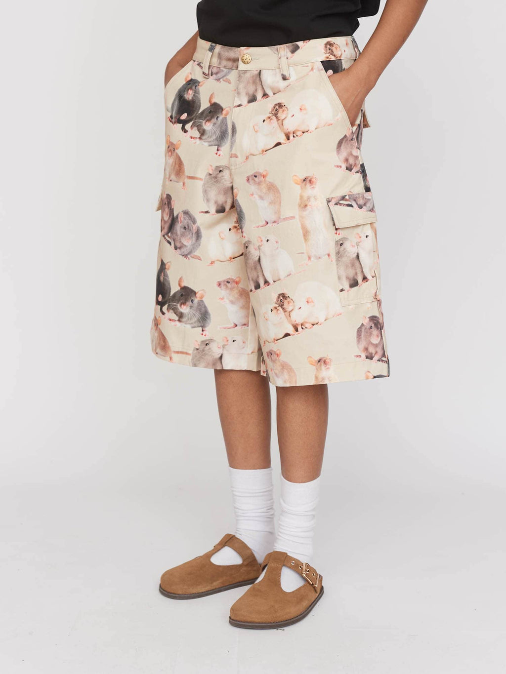 These cargo shorts have a relaxed fit and are made from a lightweight, 100% cotton twill making them the perfect accomplice on the hotter days. They have side seam as well as leg and back cargo pockets which’ll be the perfect home for all your everyday essentials. In beige, they have an all over rat print which is unique in placement from garment to garment. Show everyone you don’t mess around when it comes to rats by pairing with our Away With The Rats Shirt.