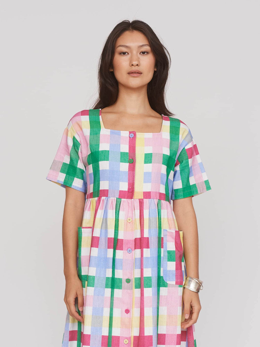 This textured, midi smock dress has a printed multi-colour check all over with short sleeves and a squared neckline. Made from a raime and cotton blend, this magic mix of materials makes it the perfect lightweight and breathable fabric for staying cool. With front patch pockets and a woven pip label, this’ll be the needed dose of Oaf for your wardrobe.