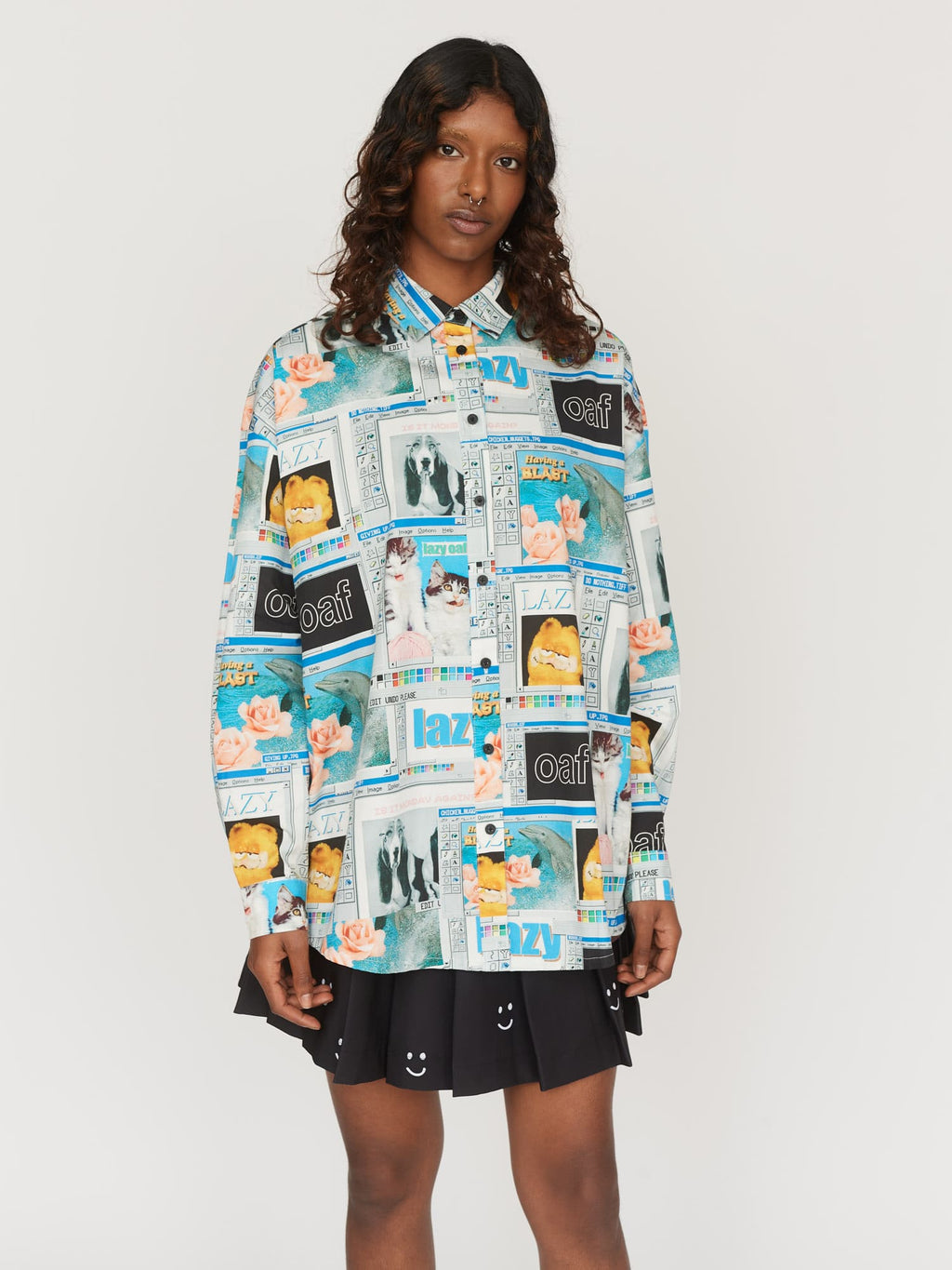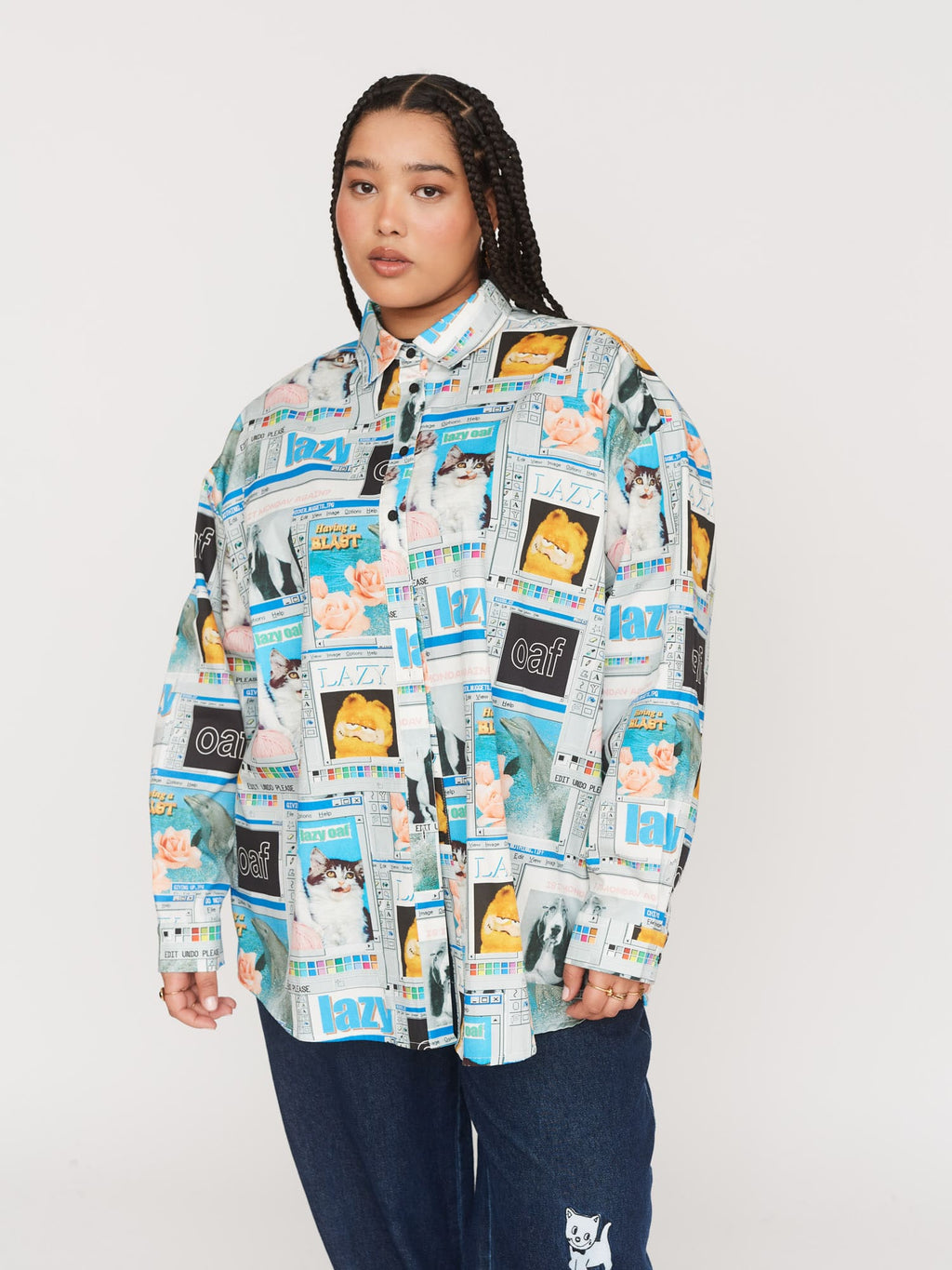 In an all over old-school Windows collage print, this 100% cotton button up shirt is the perfect piece to make your office less lame. The fit is oversized with a dropped shoulder, and the back yolke has a box pleat detail. Along with the button front, there are functional button cuffs and for added ease of wear, side slits at the hem
