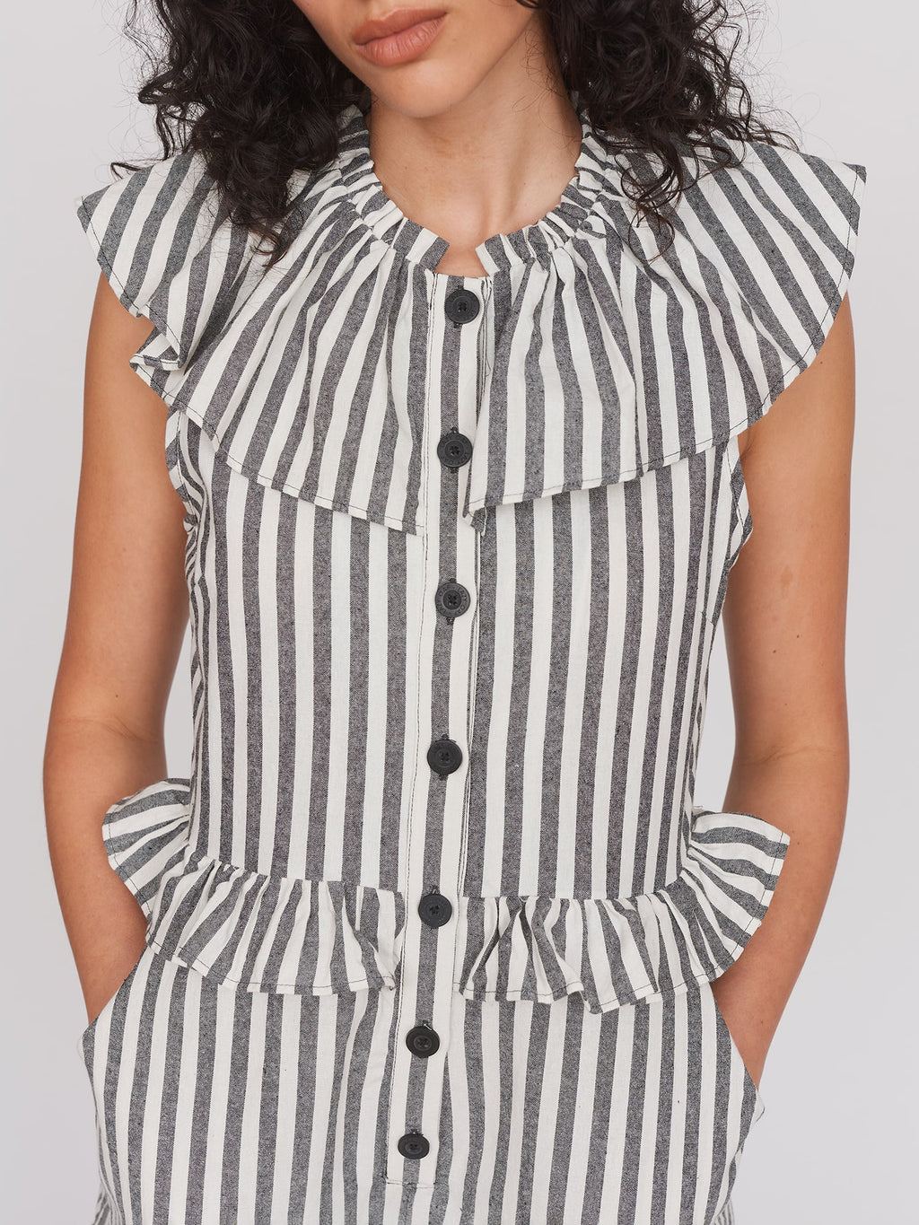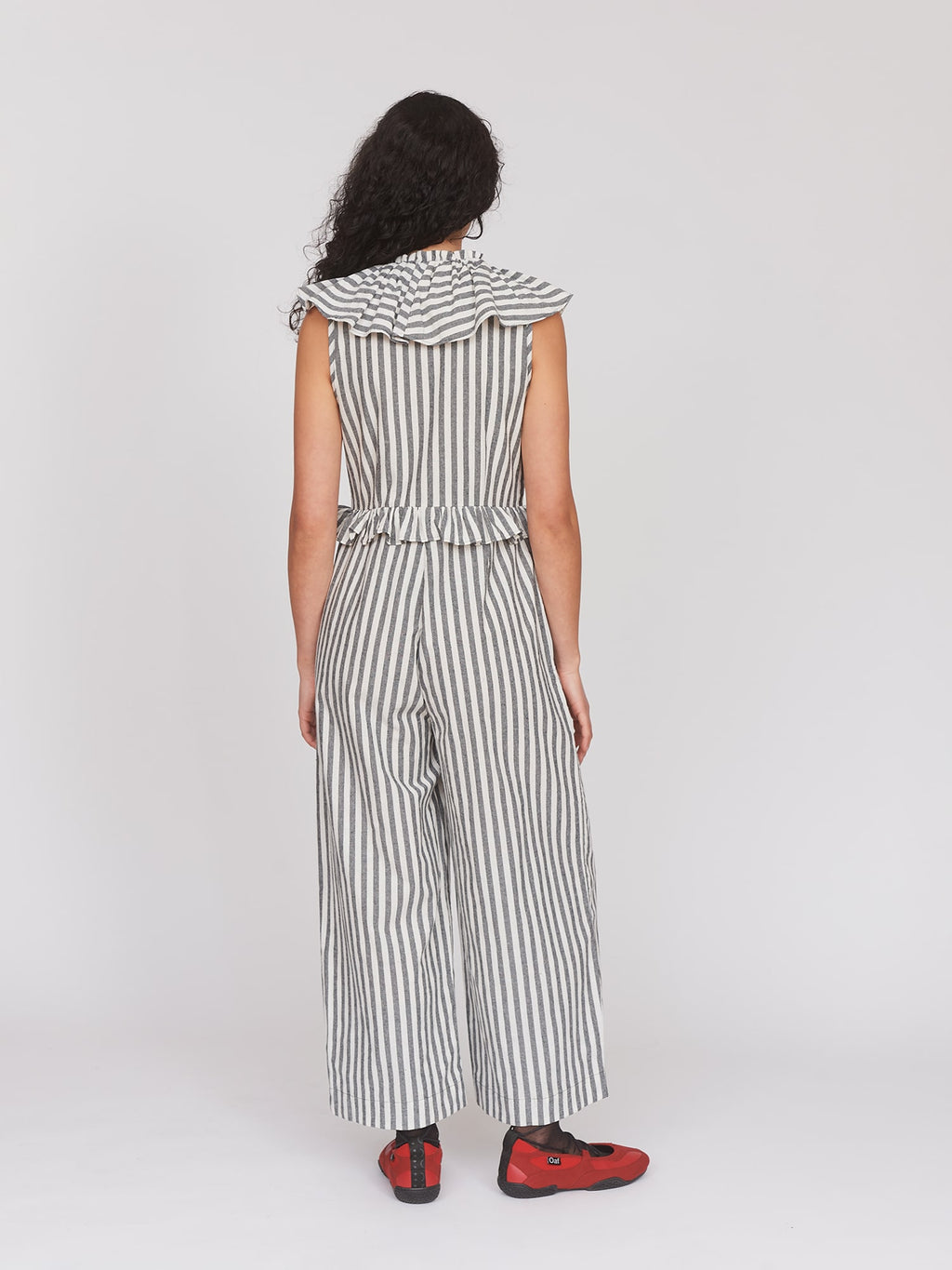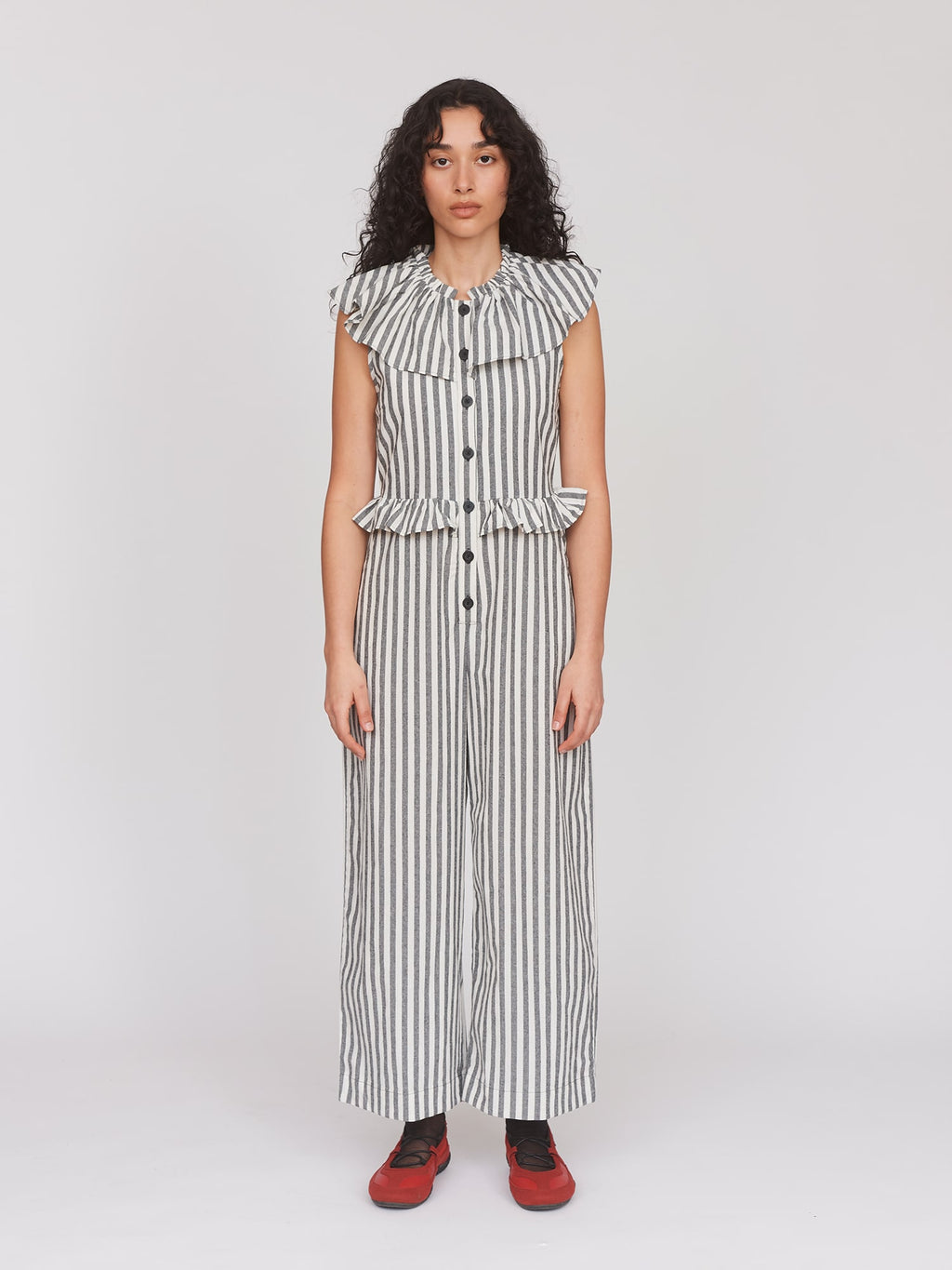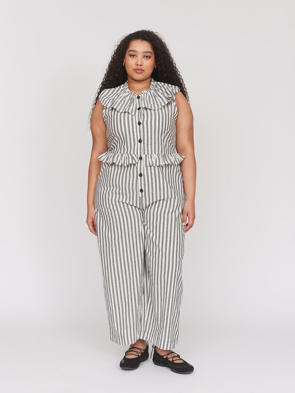 In textured cotton blend, this button up jumpsuit is sleeveless with an oversized collar which has a ruffle trim detail which is also featured at the waist. This woven stripe all in one is lightweight and relaxed in fit so won’t have you feeling like a sweaty puddle on the warmer days. With side seam pockets; this statement jumpsuit will be perfect for the summer season and layerable for the colder ones.