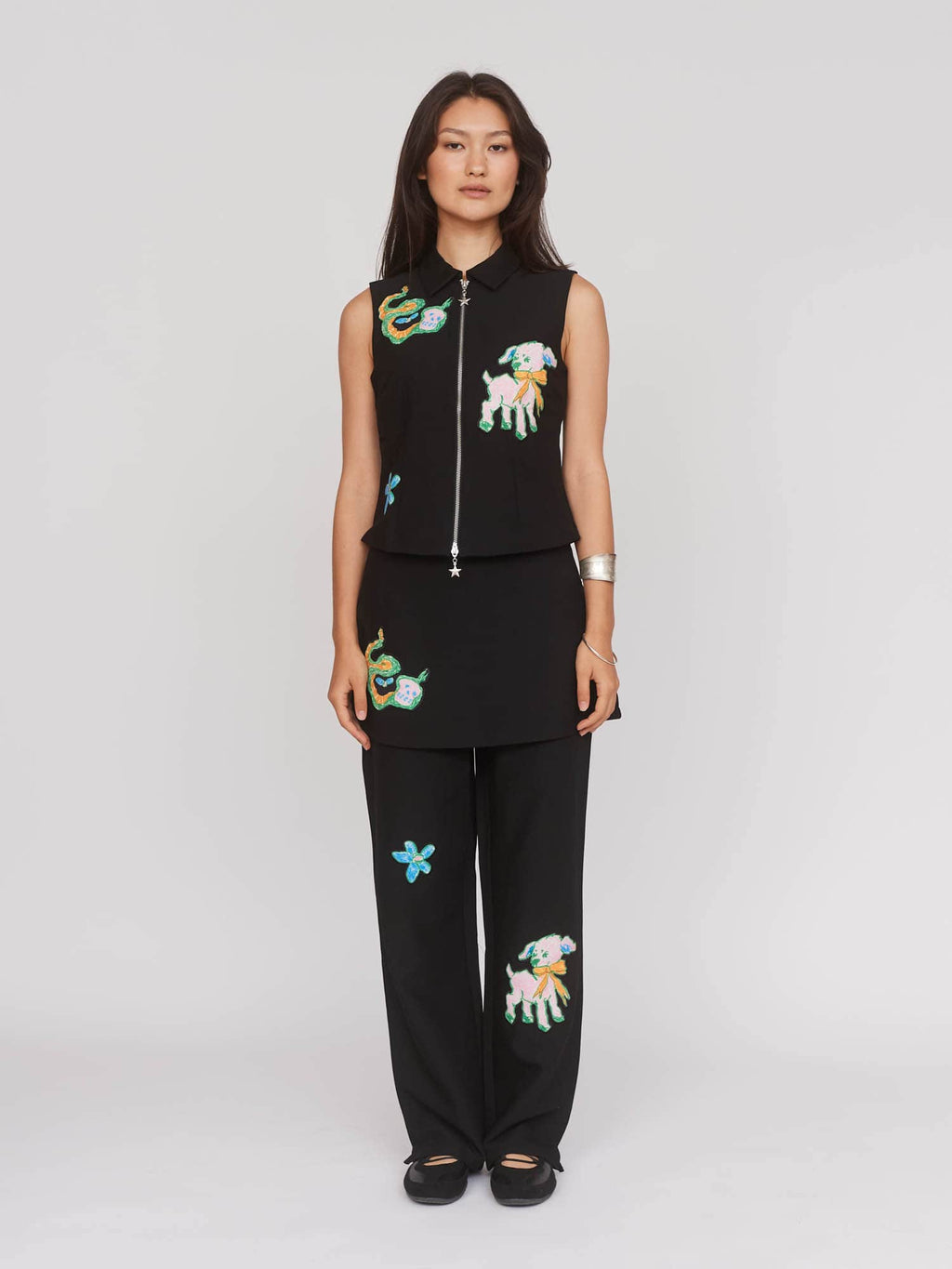 A new style at Oaf; these straight leg trousers have side slits at the hem and feature an attached, mini skirt overlay. In black, they’re fastenable by a concealed zip at the side seam and feature printed applique patches on the front by tattoo artist, Paula Grenouille. Coordinate with our Little Lamb Zip Up Top and you’ve got a versatile look you can reach for all year round.