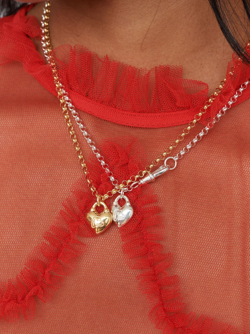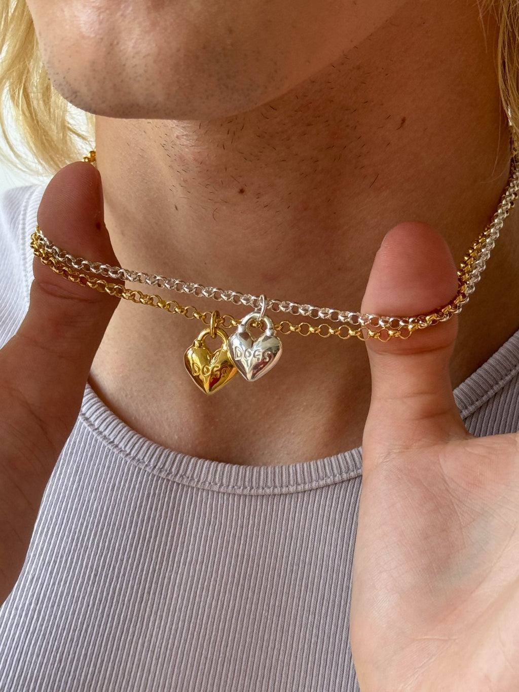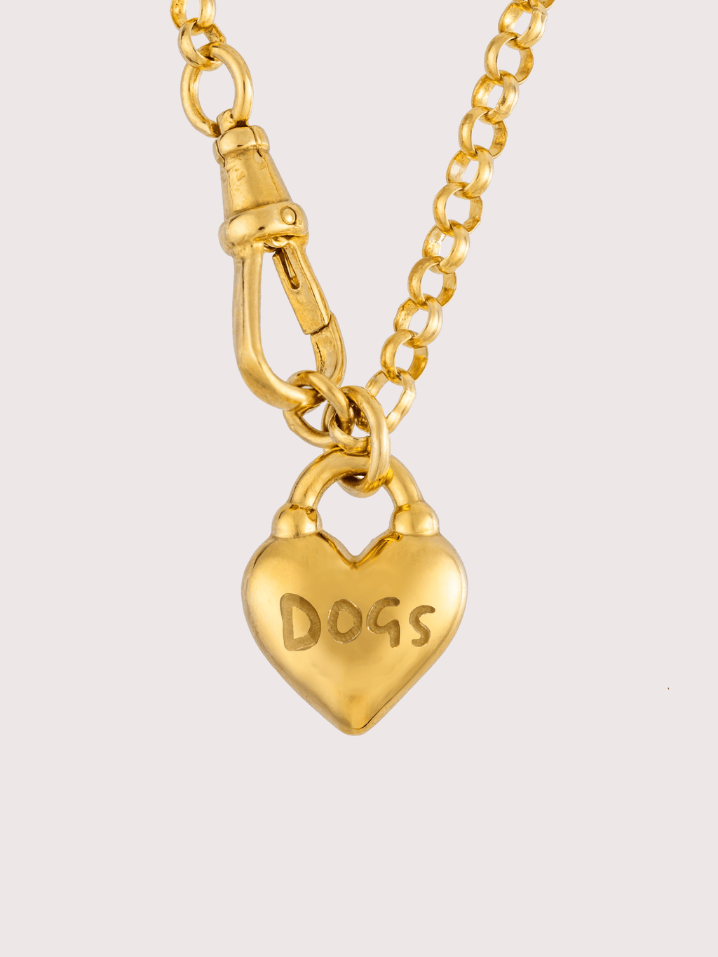 This 3D heart pendant necklace features an engraving of an illustrated dog on the front, and the word ‘dogs’ on the back. On a Belcher chain with a Prince Albert clasp, this piece is available in both Sterling Silver and 18k Gold Vermeil.
