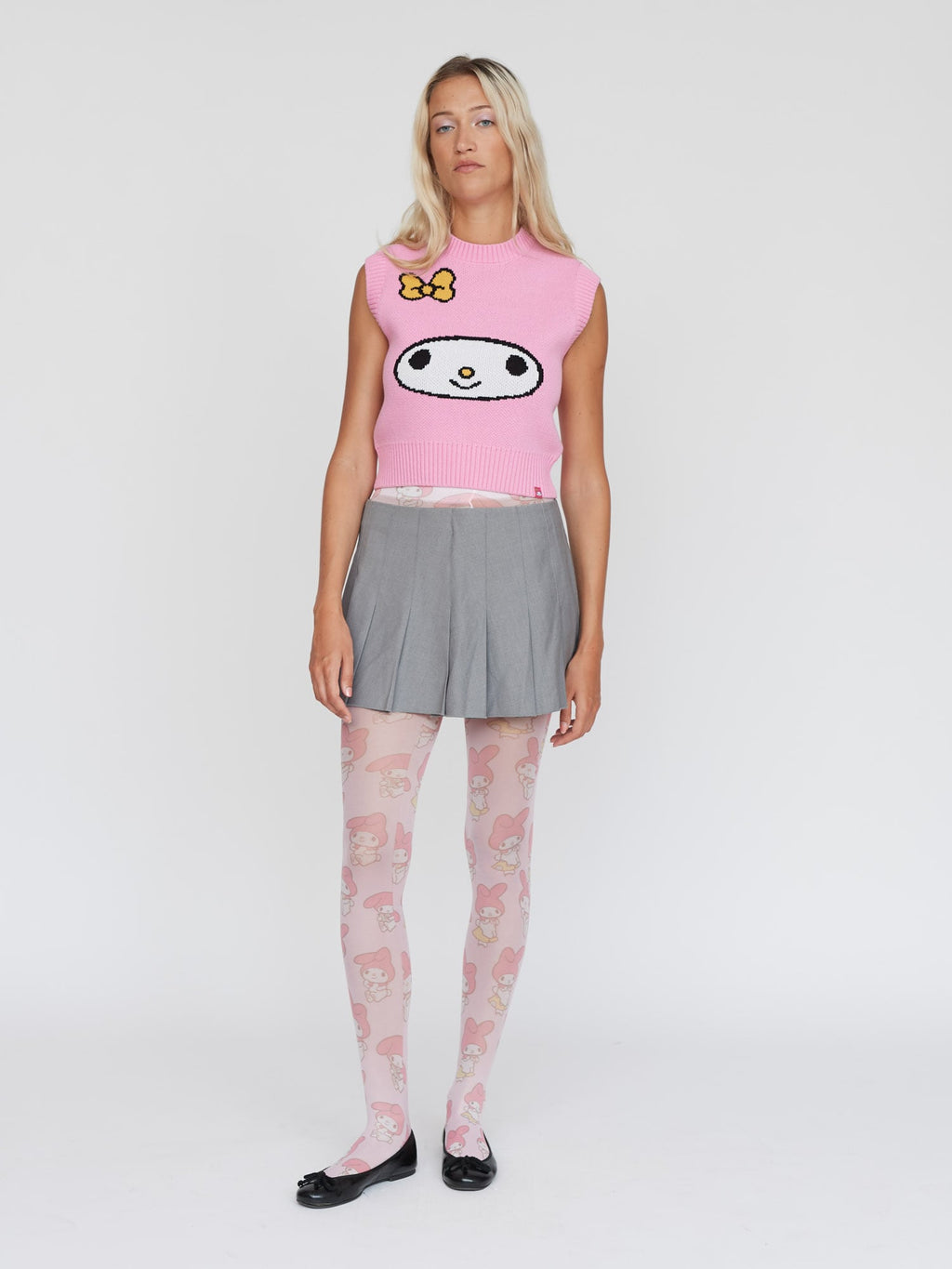 In a cropped length, this knitted vest has a placement intarsia My Melody design for our Lazy Oaf - My Melody collection. In pink, it has ribbed armholes, neck and hem and has bespoke labelling as well as swing tag for the collection.