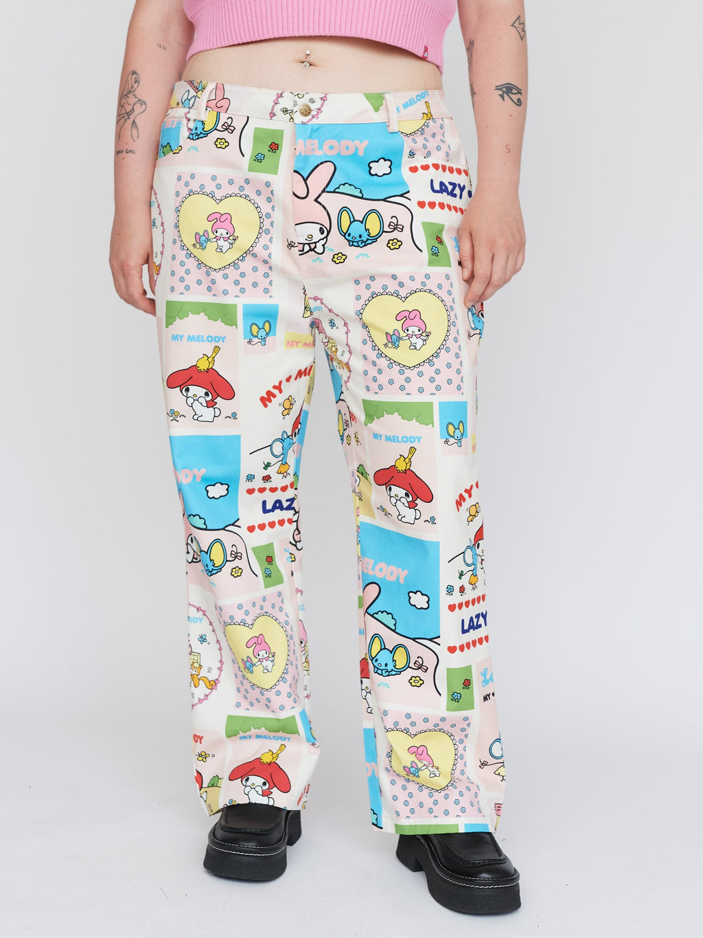 In an all over patchwork print as part of our collaboration with My Melody, these straight leg trousers have a zip fly closure and contrast pink stitching. Sitting at mid-rise, they have hip and back patch pockets with one of the hip pockets having a coin pocket. These trousers have a bespoke Lazy Oaf - My Melody label and swing tag.This Item Only Ships To: UK, USA, Canada, Australia, New Zealand, China, Japan, Taiwan, Austria, Belgium, Cyprus, Denmark, Finland, France, Germany, Greece, Republic of Ireland, Italy, Luxemburg, The Netherlands, Norway, Portugal, Spain, Sweden, Switzerland, Turkey, Bahrain, Egypt, Iran, Iraq, Kuwait, Lebanon, Oman, Qatar, Kingdom of Saudi Arabia, Syria, United Arab Emirates, Yemen