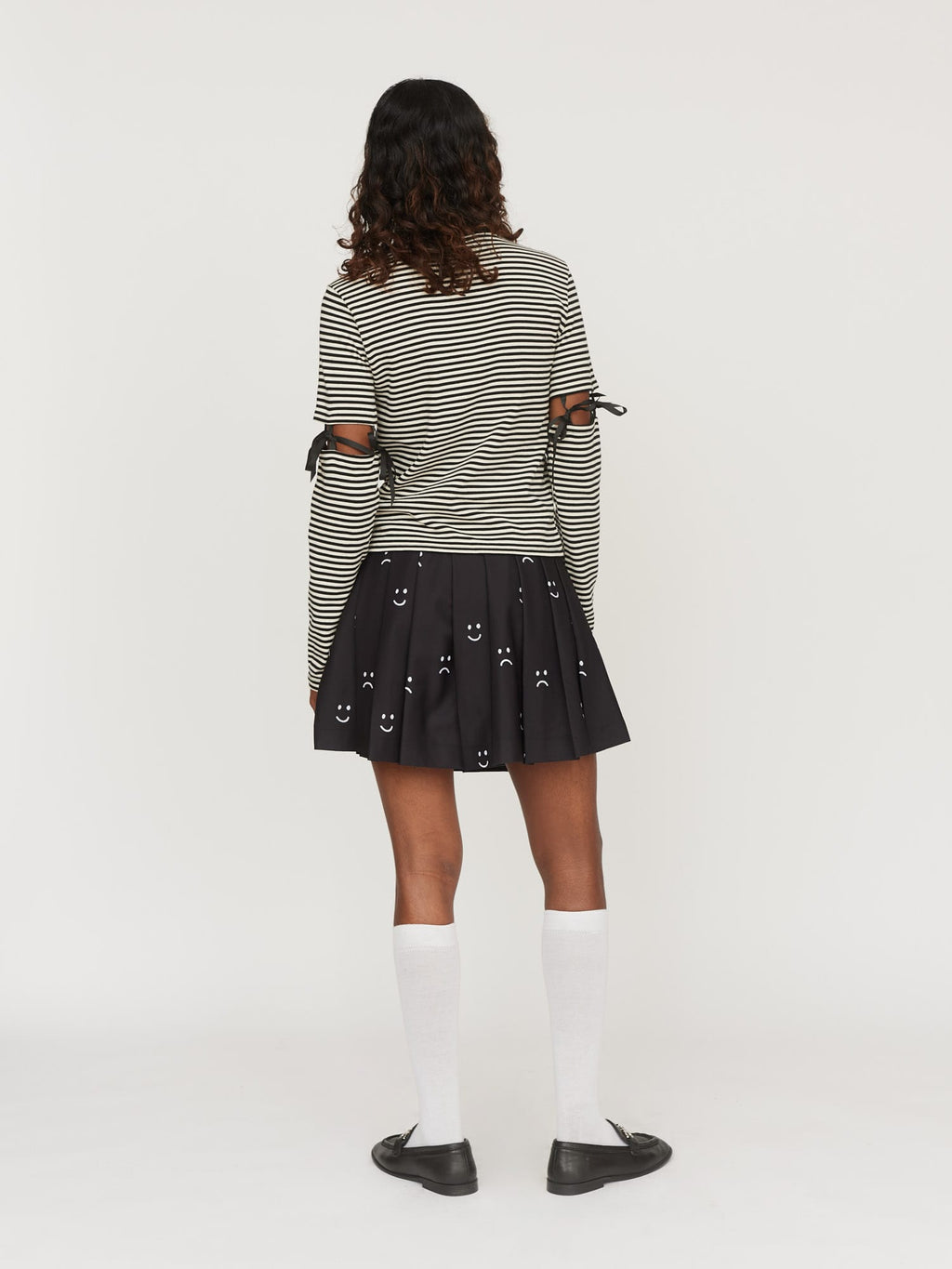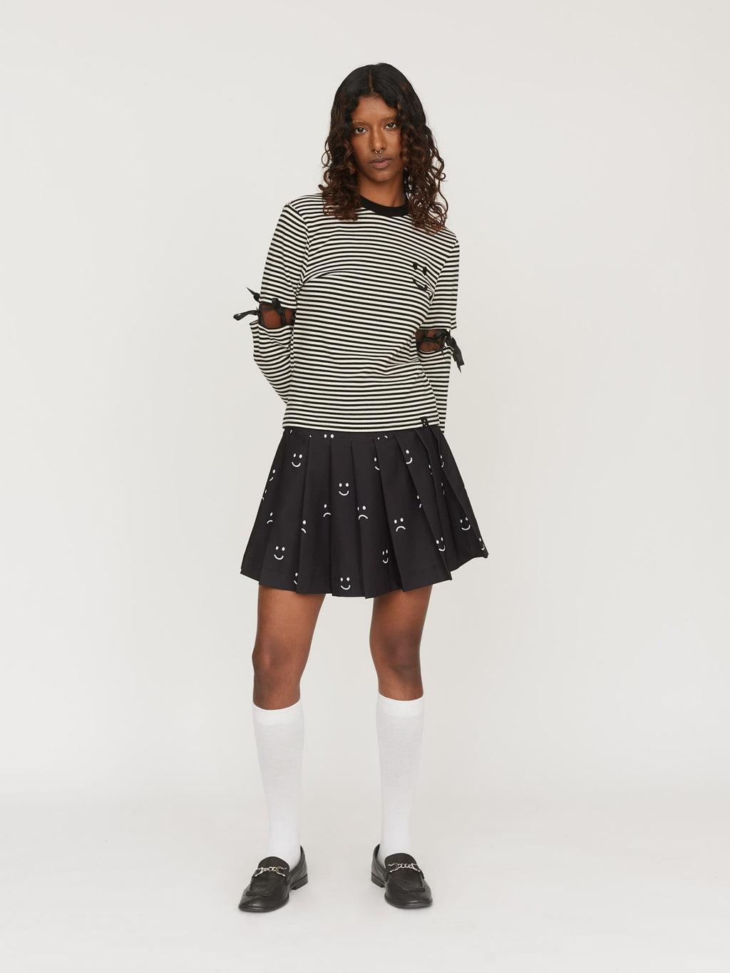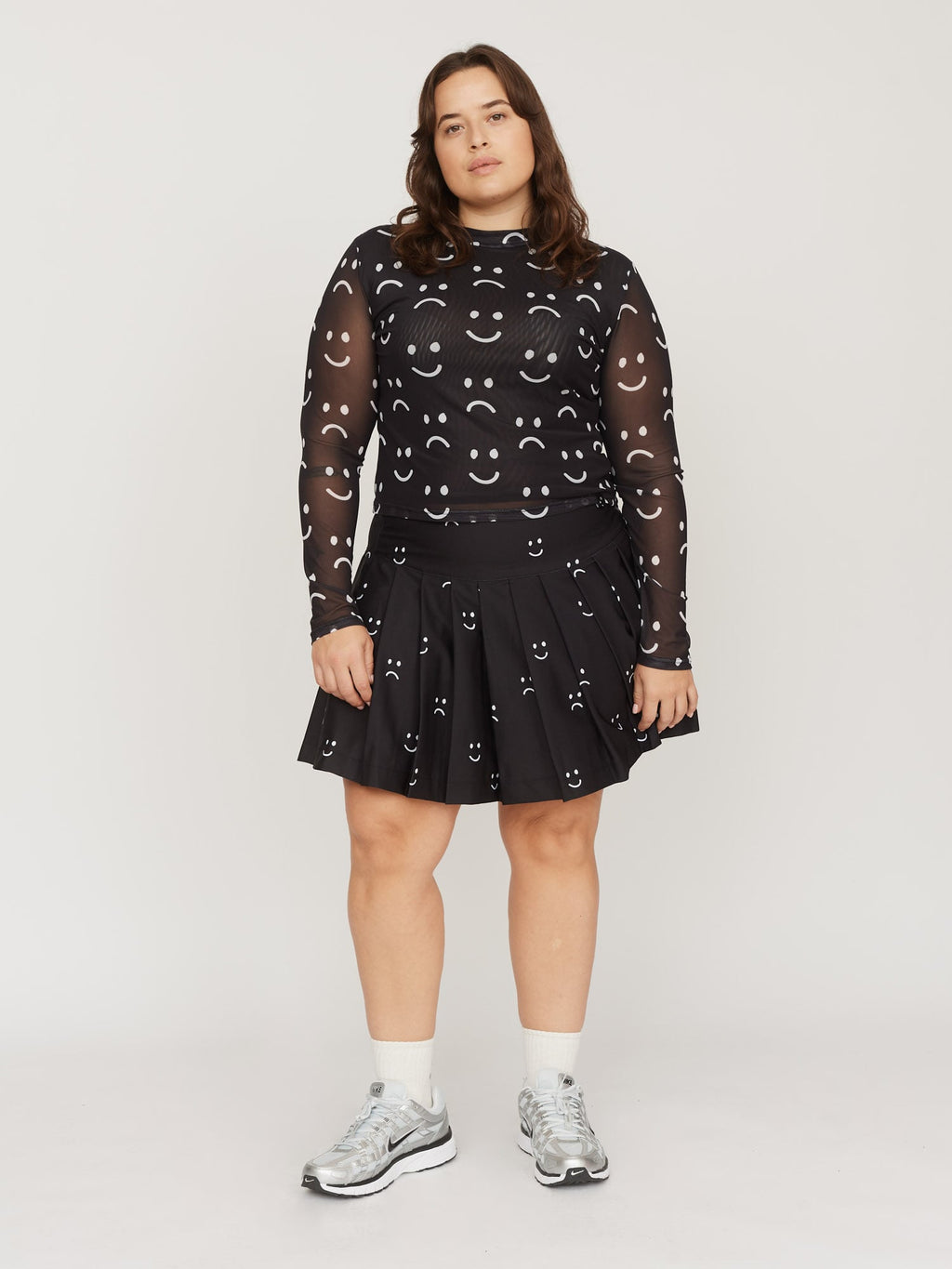 Mini happy sad faces, for a mini skirt! In black, with an all over contrasting white print of our best-selling happy sad graphic, this skirt is going to quickly become a wardrobe staple. It has a deep waistband with two branded buttons, met by a concealed zip in the wide pleated skirt.