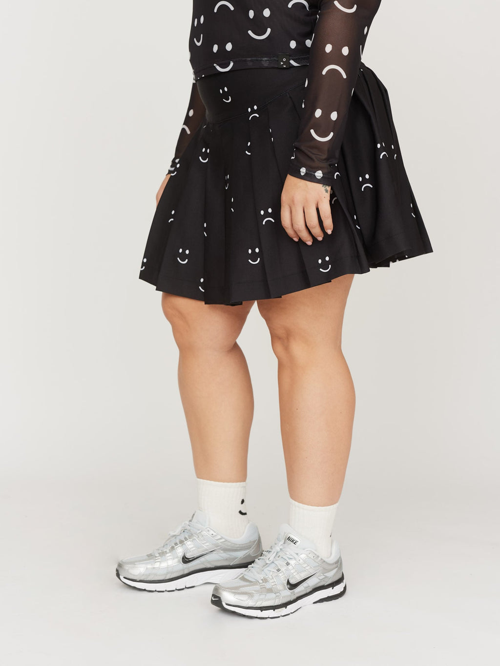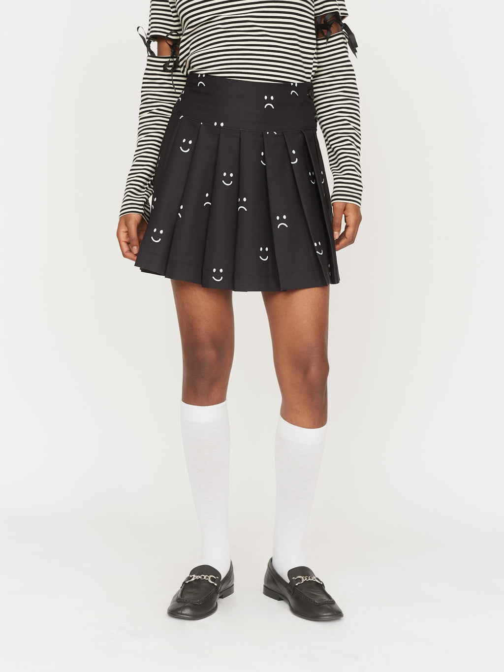 Mini happy sad faces, for a mini skirt! In black, with an all over contrasting white print of our best-selling happy sad graphic, this skirt is going to quickly become a wardrobe staple. It has a deep waistband with two branded buttons, met by a concealed zip in the wide pleated skirt.Need help with your order? CONTACT US