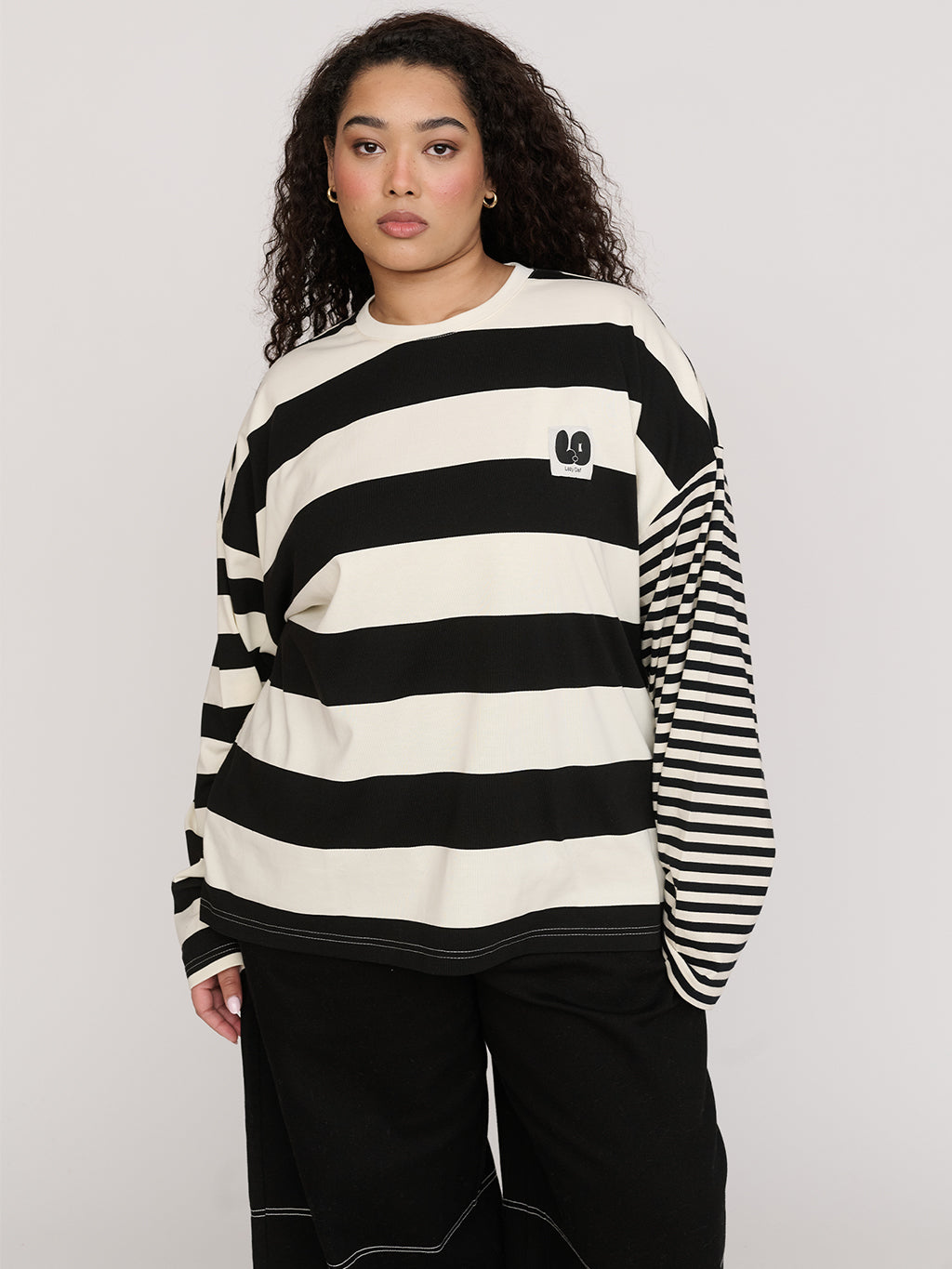 Made from 100% cotton, this boxy, oversized tee has contrasting panels in a mixed stripe made up of grey, blue and red. The neckline is ribbed and it features an embroidery detail of our infamous side eyes. It’ll pair up perfectly with a pair of our Bev, Kev or Trev trousers.
