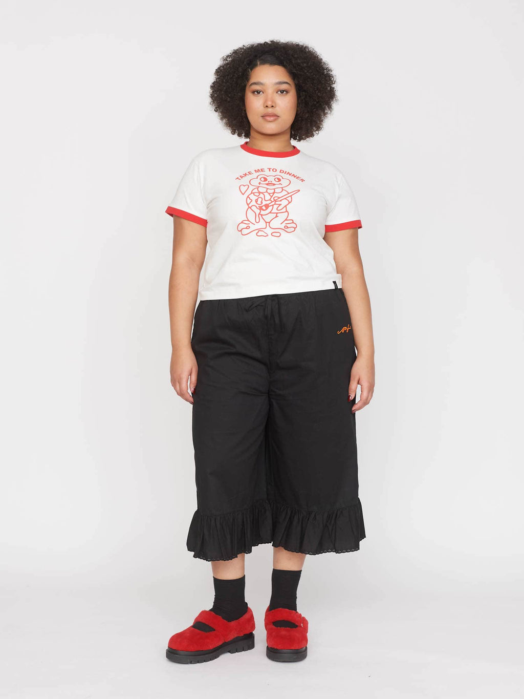 These wide leg culotte trousers have an elasticated drawcord waistband with an embroidered ruffle hem detail. In black, they have side seam pockets and feature an orange Oaf embroidered on the left side. Wear alone, or for the colder months, layer your favourite block coloured tights underneath.