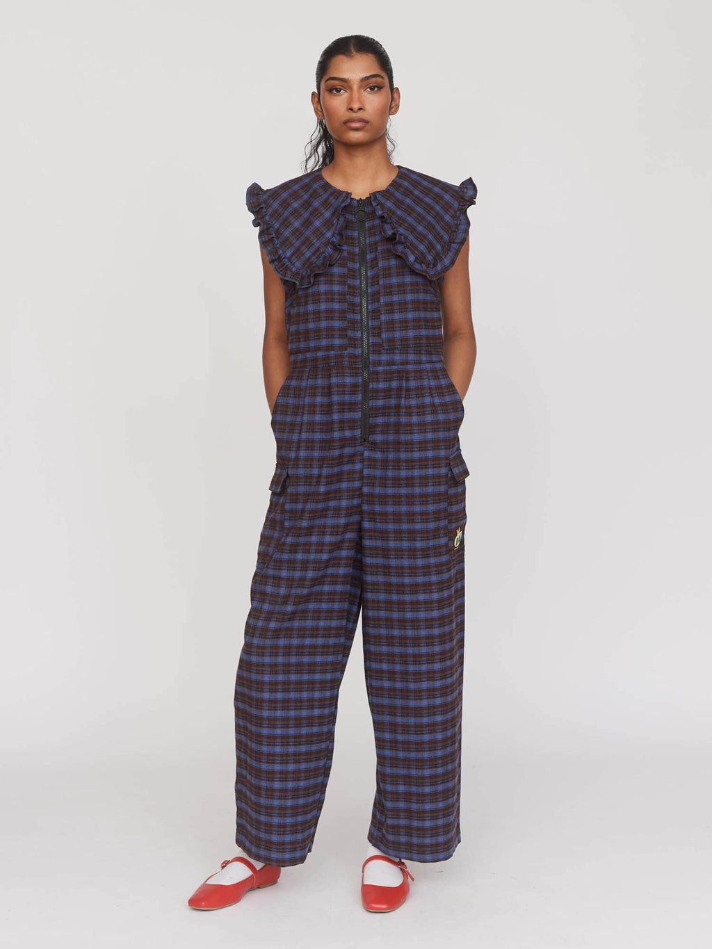 In blue and brown brushed check fabric, this sleeveless jumpsuit has a true to size fit with a gathered waist and darts at the back and front to give an effortlessly good fit. It has an oversized collar with a ruffle trim, plus, chest and hip pockets as well as cargo style ones of the leg. Layer a white long sleeve underneath for colder days and style alone for the warmer ones.