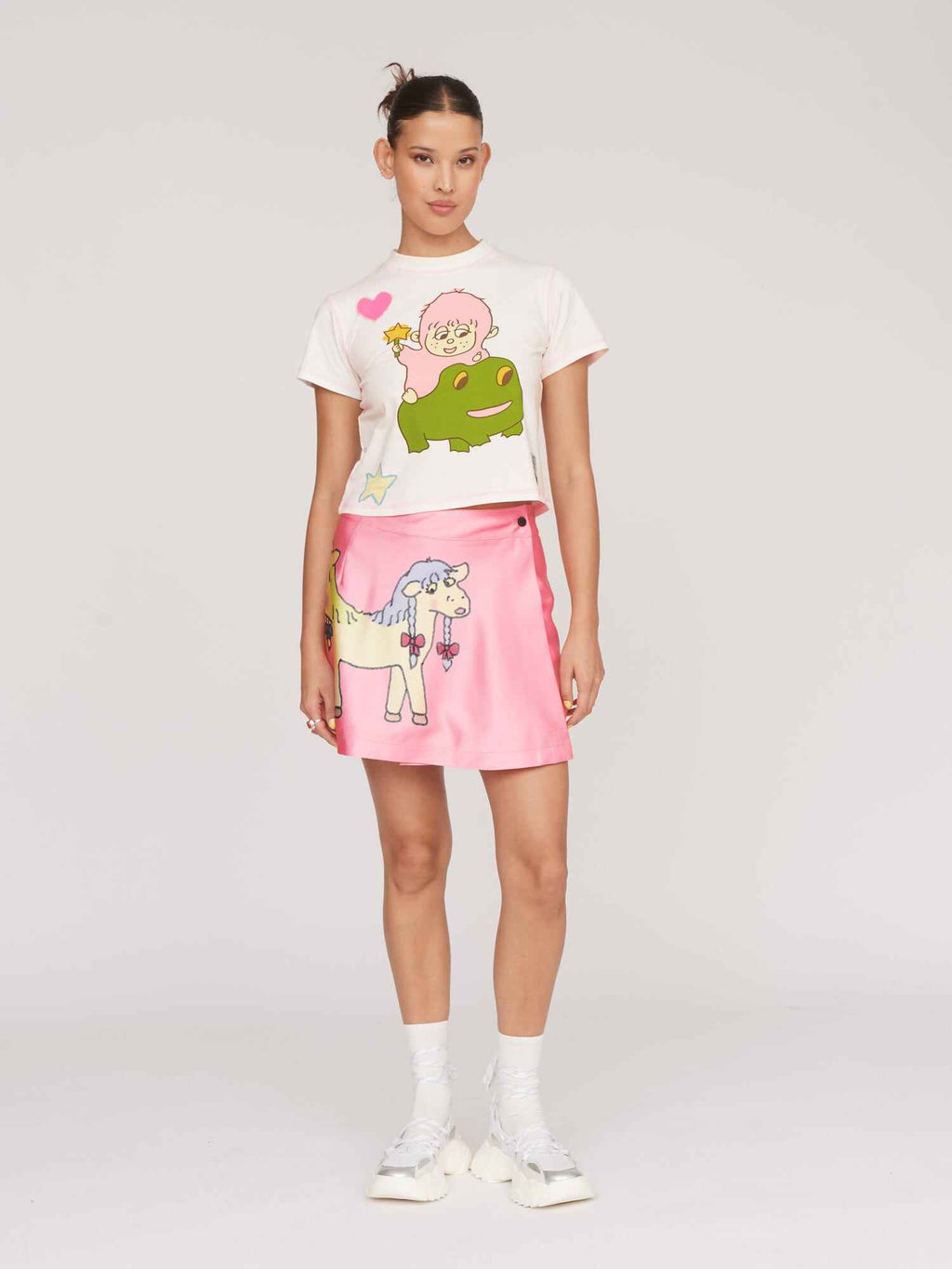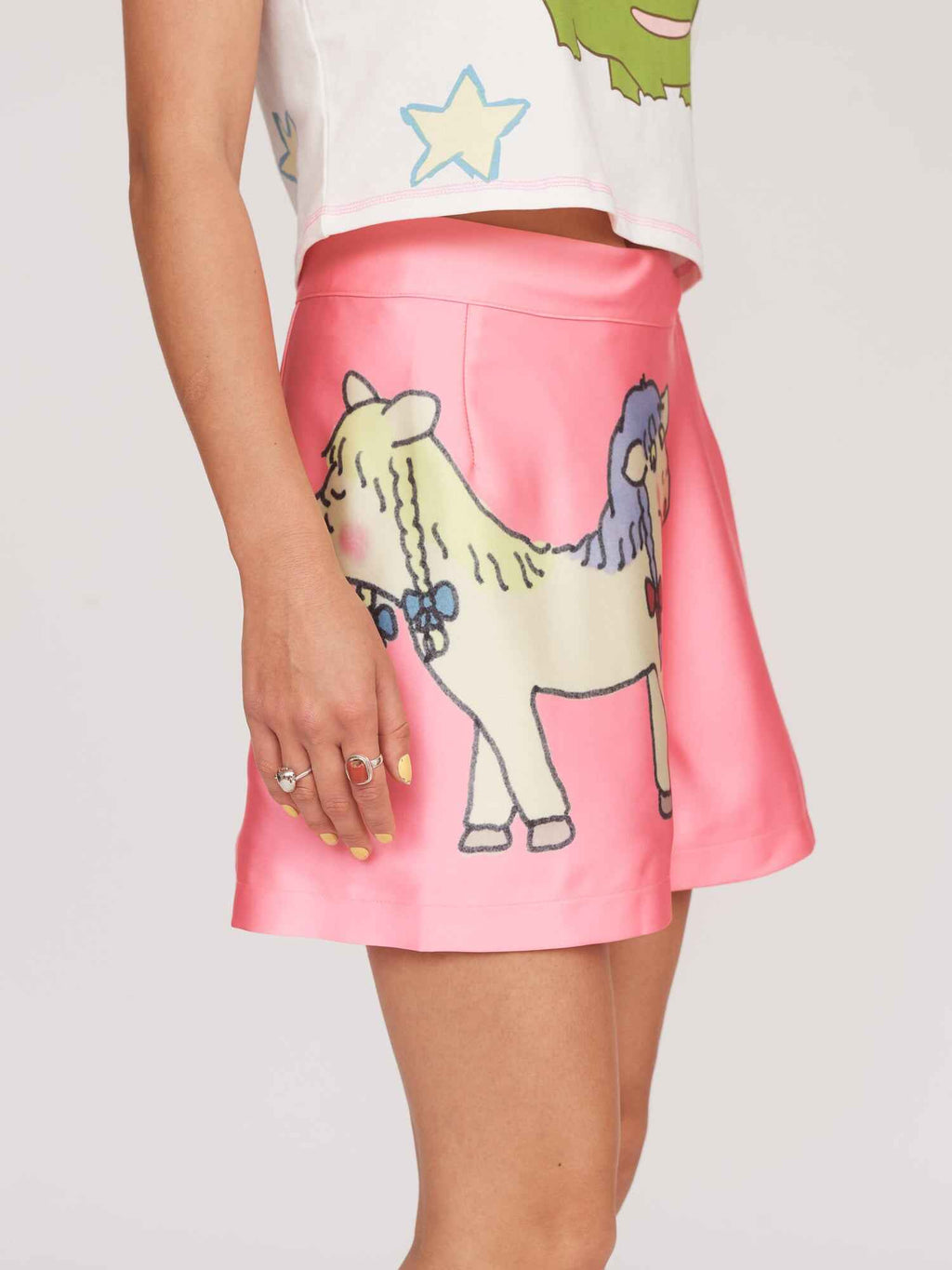 This mini skirt made from a pink satin material is fully lined with both an internal, and external, black button closure. On the side seam is a printed graphic by UK based illustrator Tom Jones. Go all pretty in pink with our Once Upon a Time Bow Top and Pink Lace Ballet Sneakers, or dial it back with a black baby tee and Happy Sad Lace Up Ballet Sneakers.