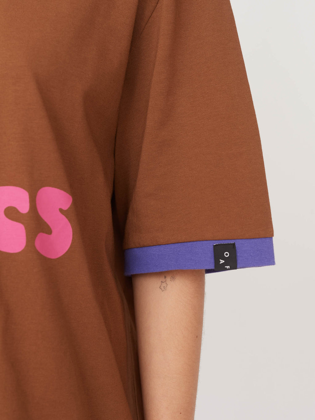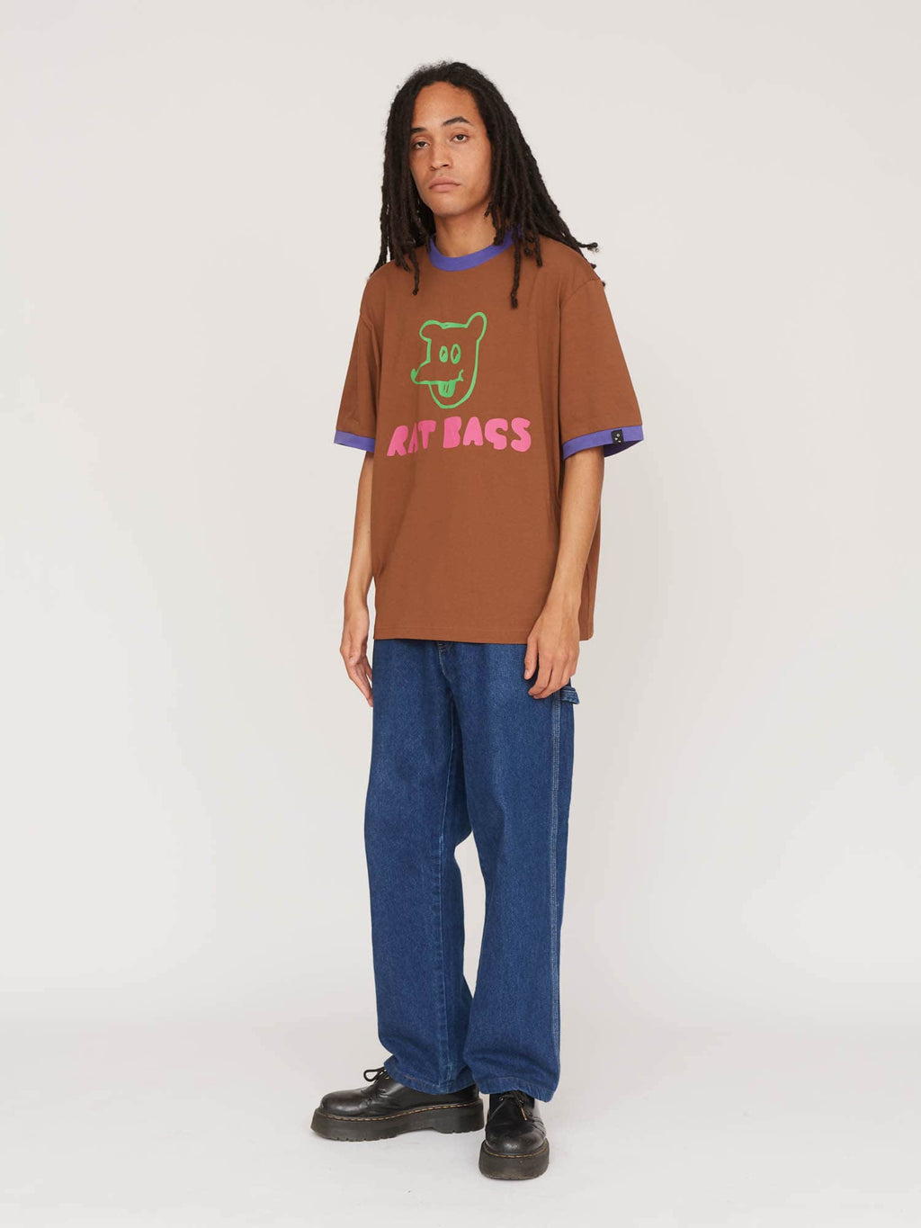 In a super soft, 100% cotton fabric, our genderless t-shirt shape looks good on everybody. This style has a contrast ringer neck and hem with a rat graphic, and ‘rat bags’ type, on the chest. There’s a custom woven patch on the back of the neck, and an Oaf pip label on the sleeve cuff.