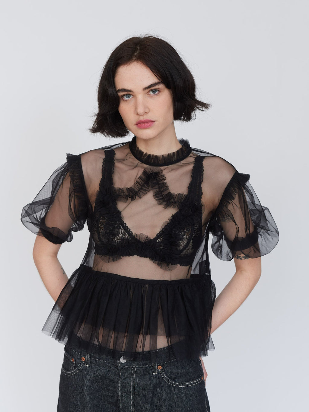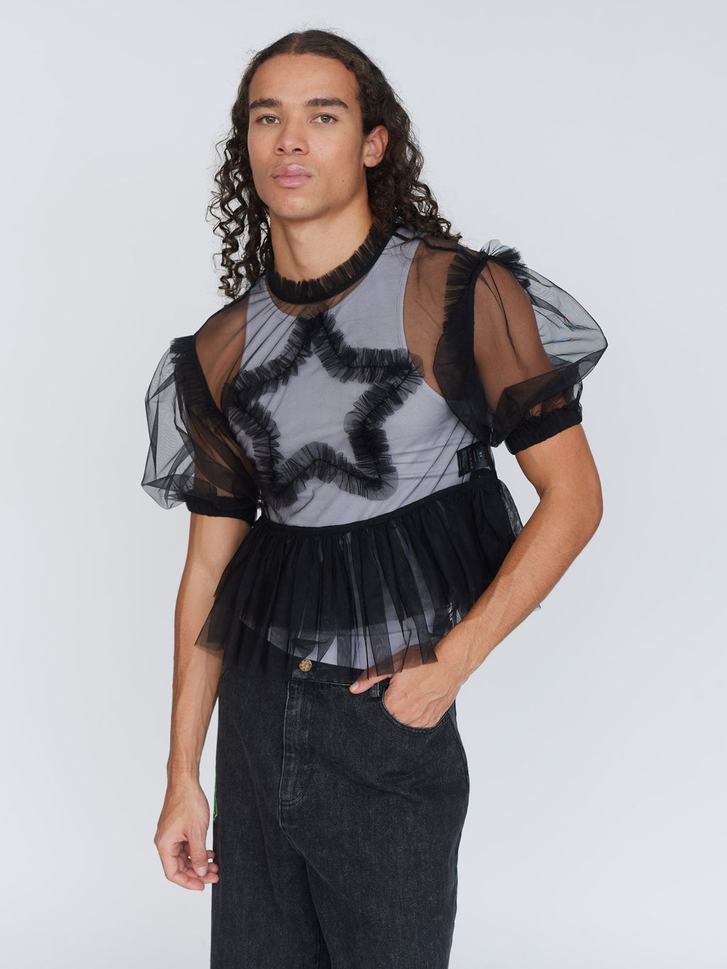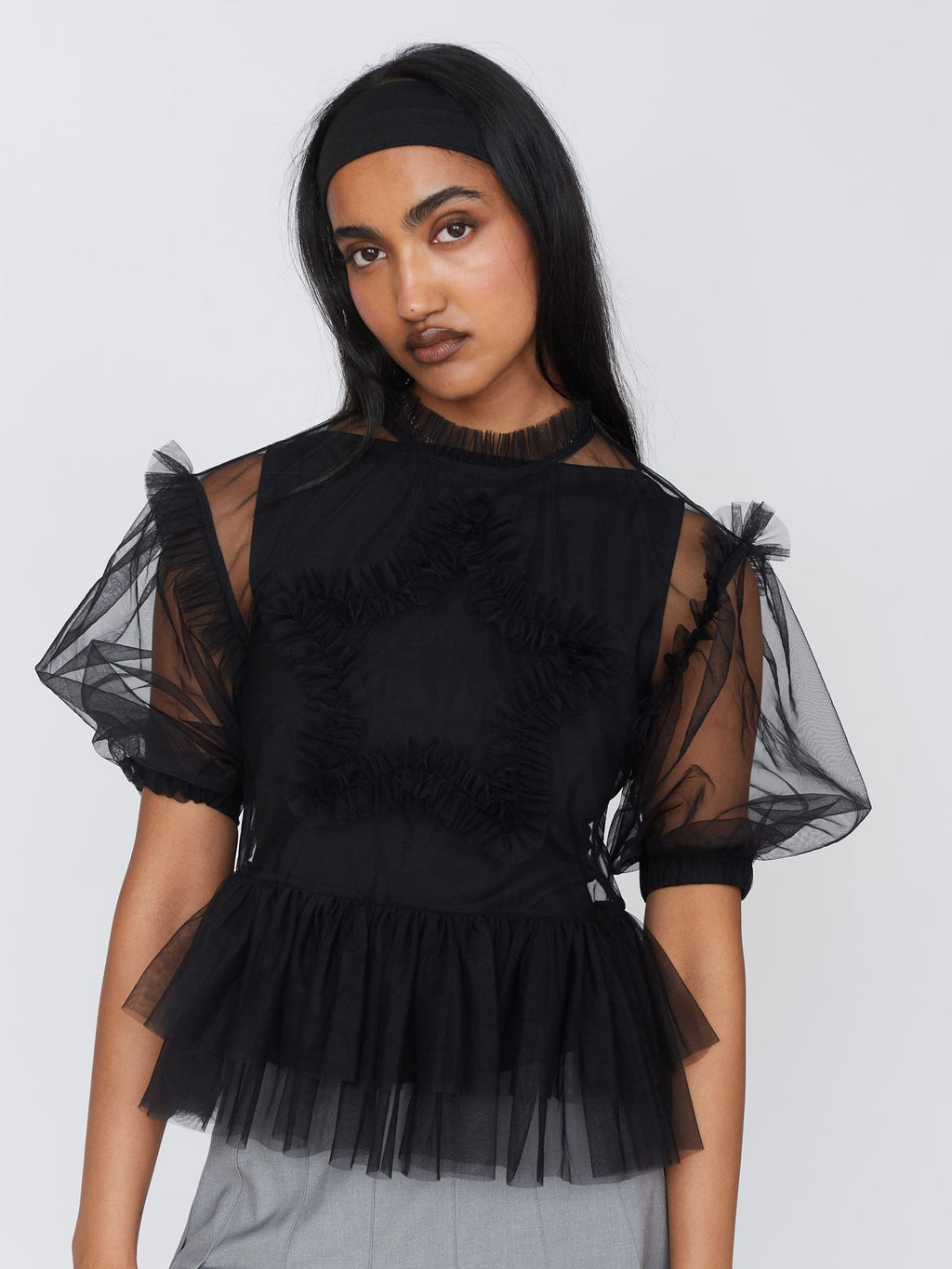 Sheer black tulle top. Puff sleeves with elasticated cuffs. Applique ruffle star detail at chest. Ruffle detail at neck, shoulder, and waist peplum. Back neck keyhole closure.